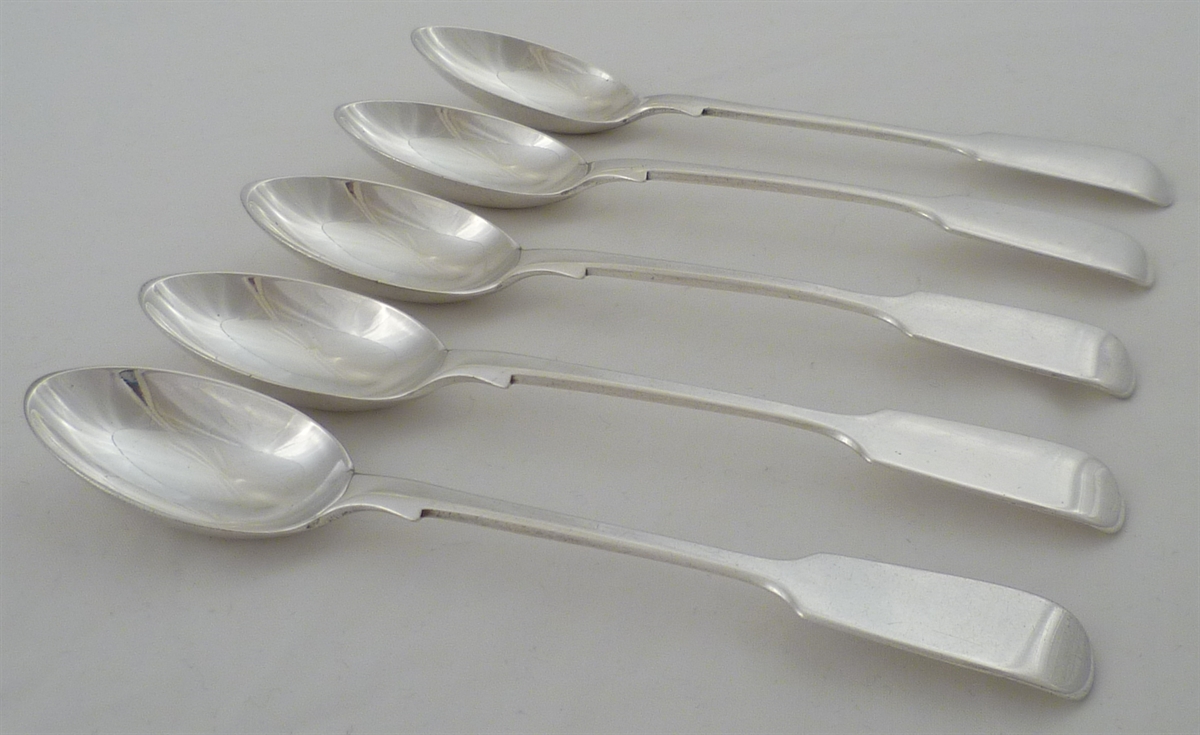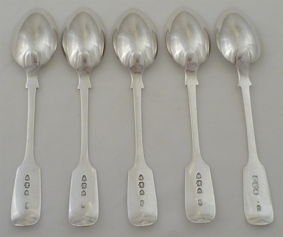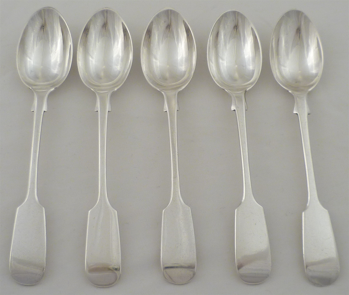DESCRIPTION | Five Victorian silver Fiddle pattern teaspoons with no engraving or erasure. |