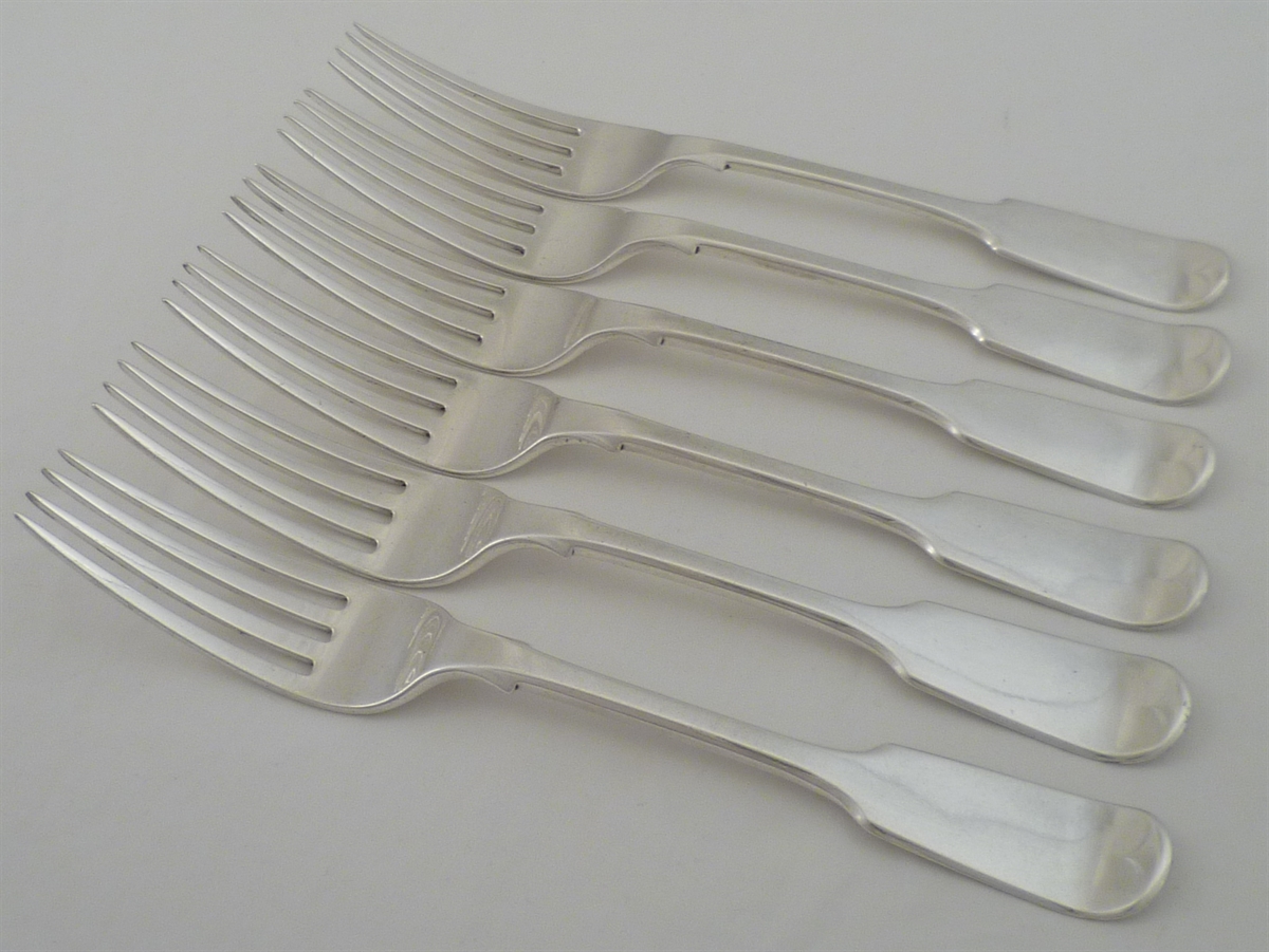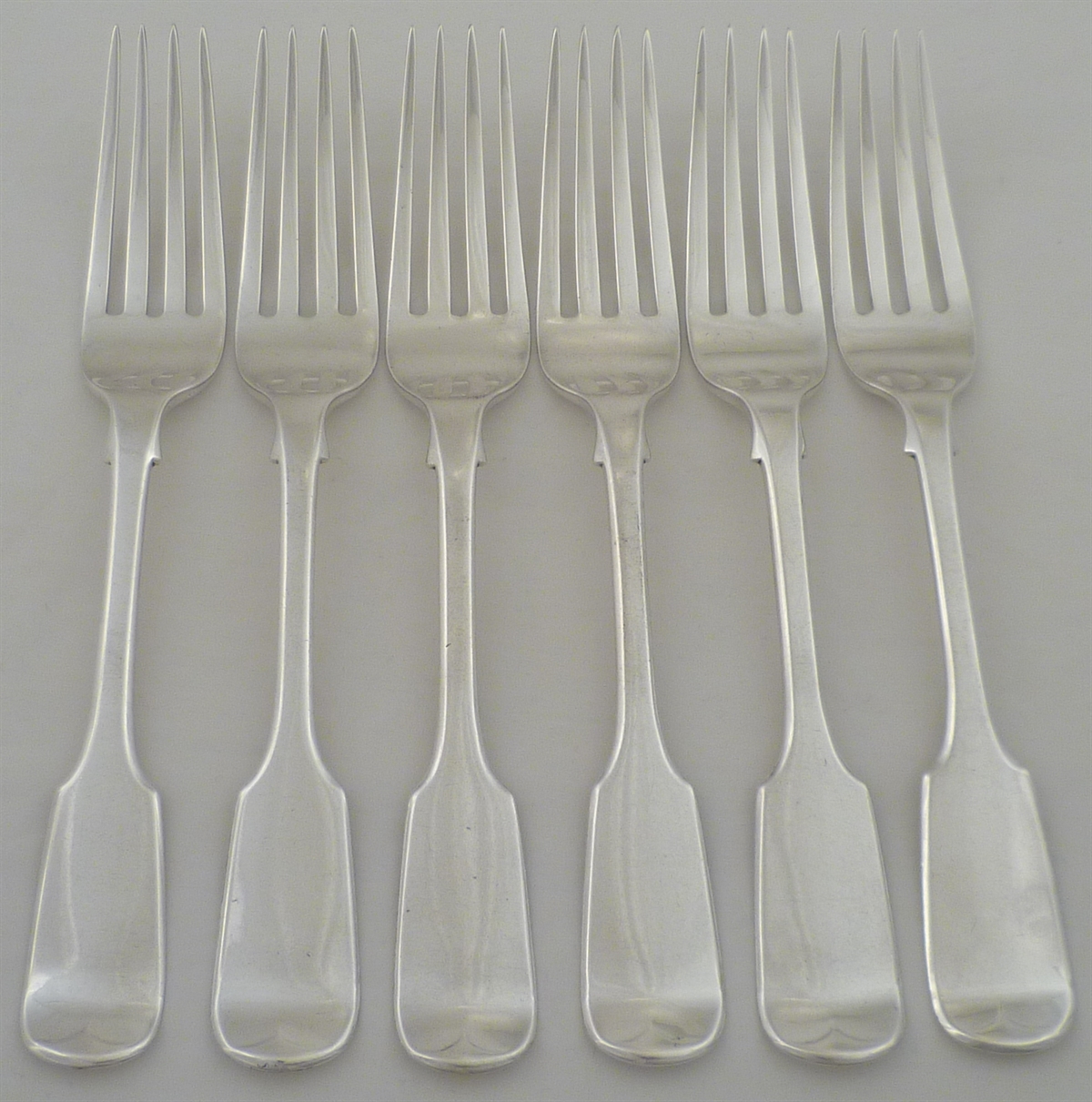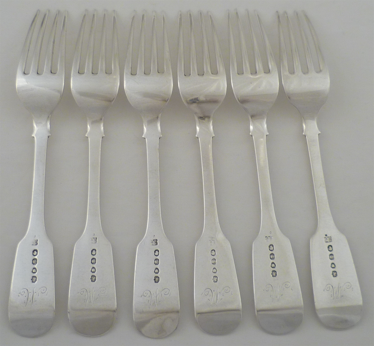 DESCRIPTION | Superb set of six early Victorian solid silver Fiddle pattern table forks with an initial engraving 'W', possibly 'M', verso. |