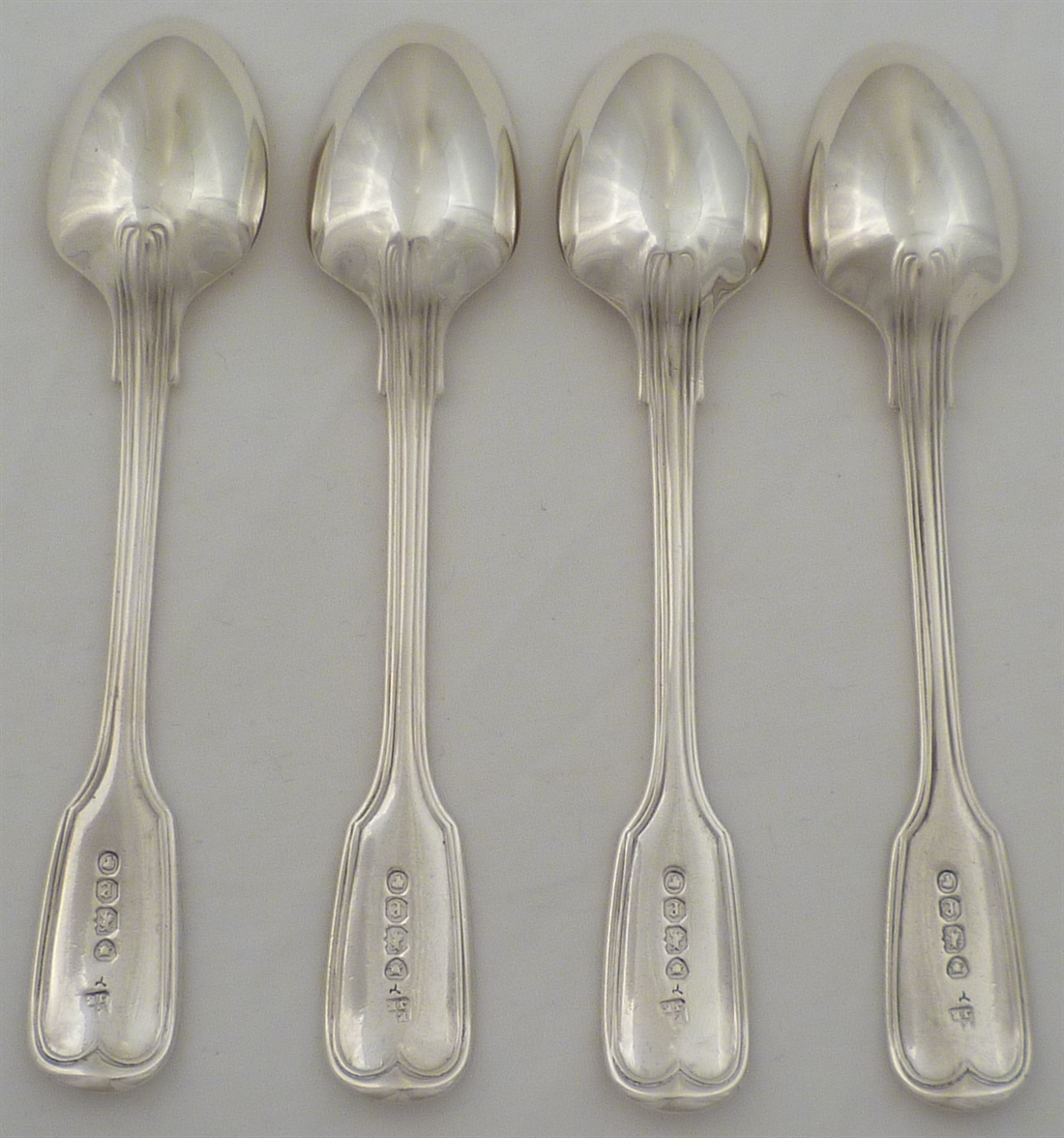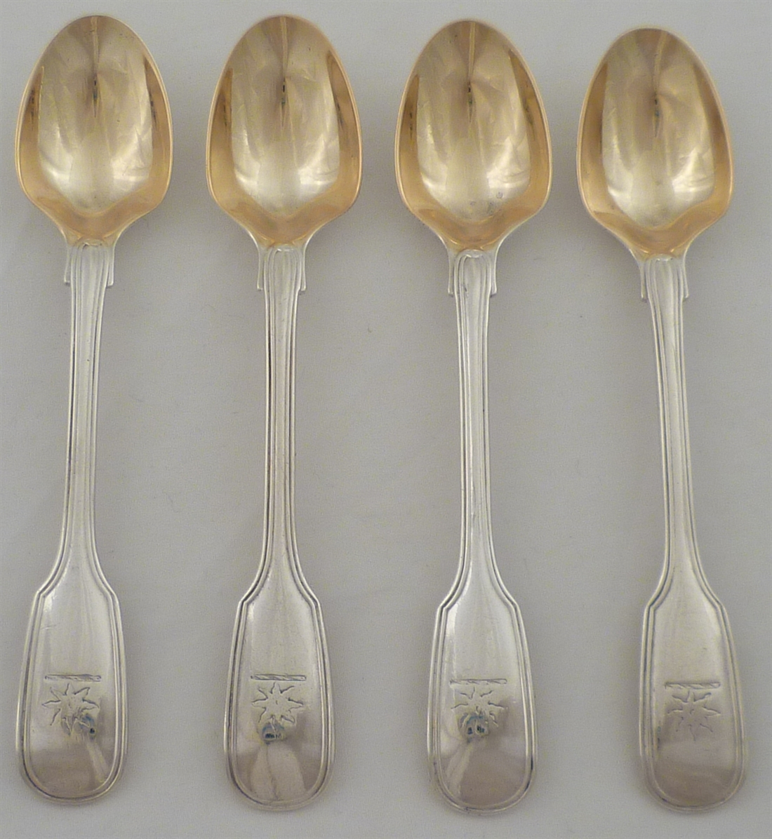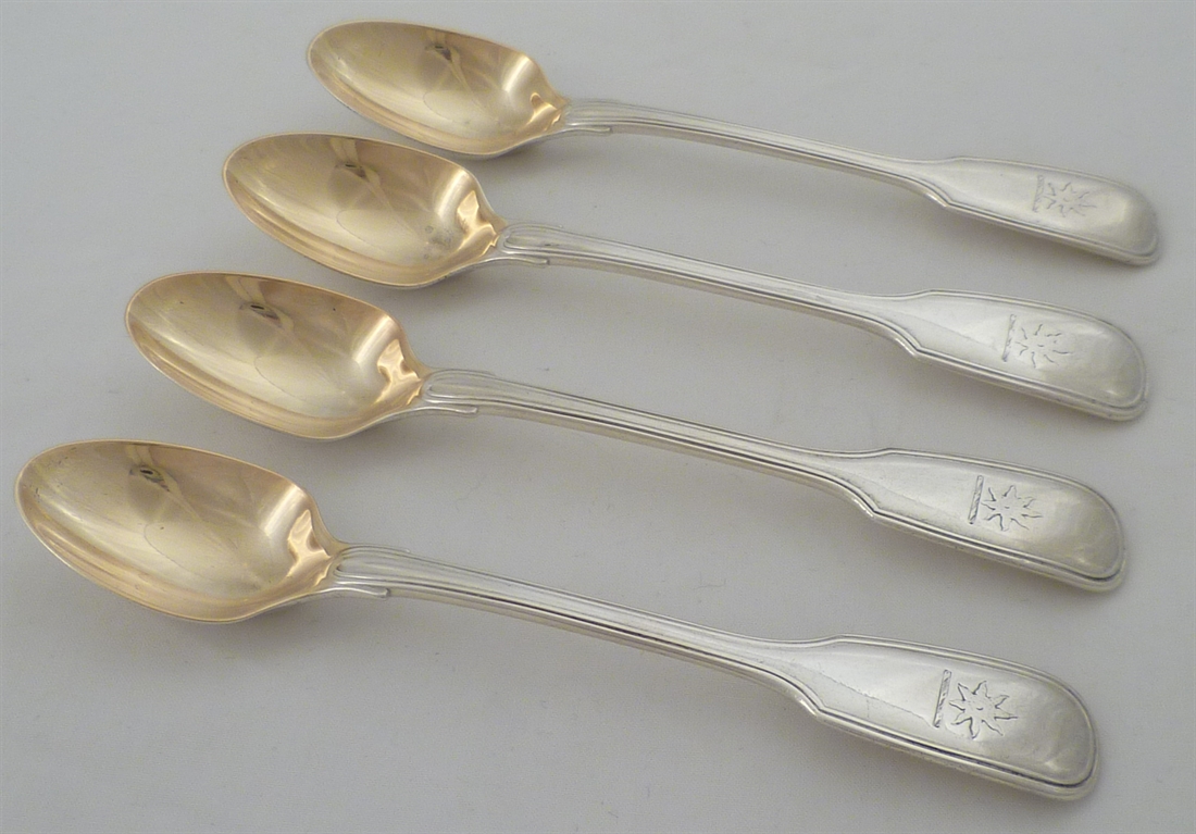 DESCRIPTION | Set of four Victorian solid silver double struck Fiddle & Thread pattern egg spoons with frontal crest engraving and gilded bowls. |