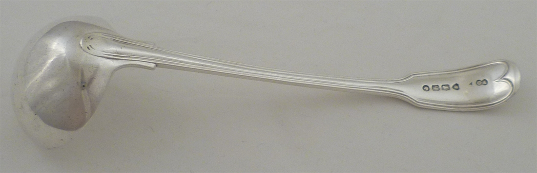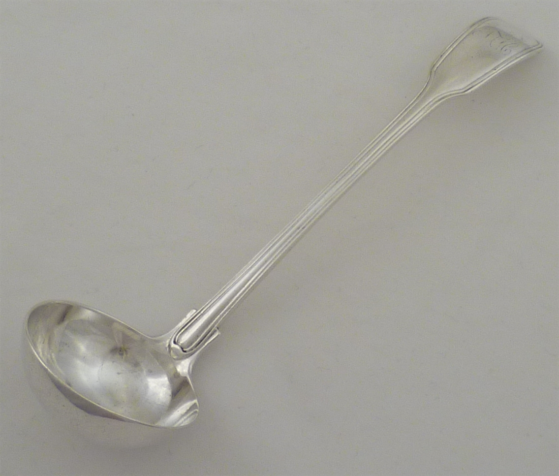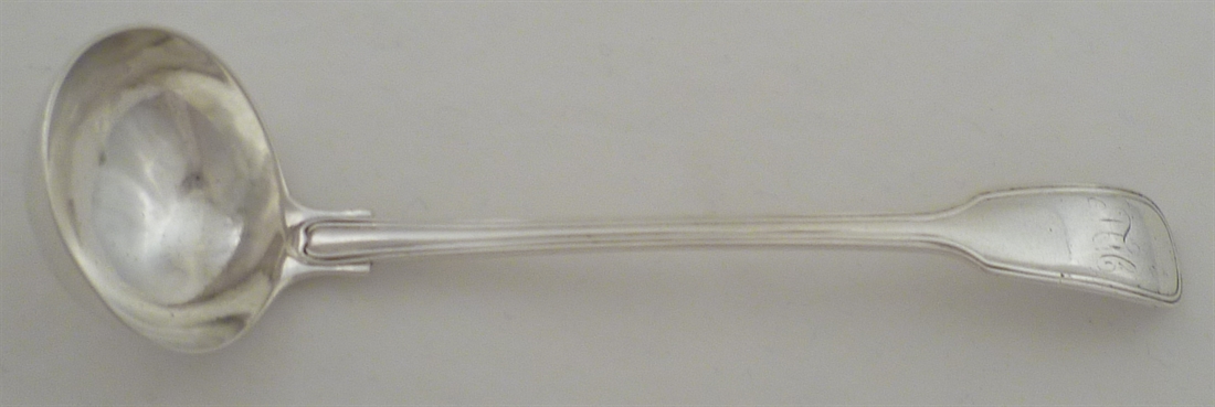 DESCRIPTION | Victorian solid silver Fiddle & Thread pattern ladle with a frontal monogram engraving. |