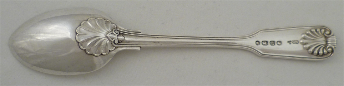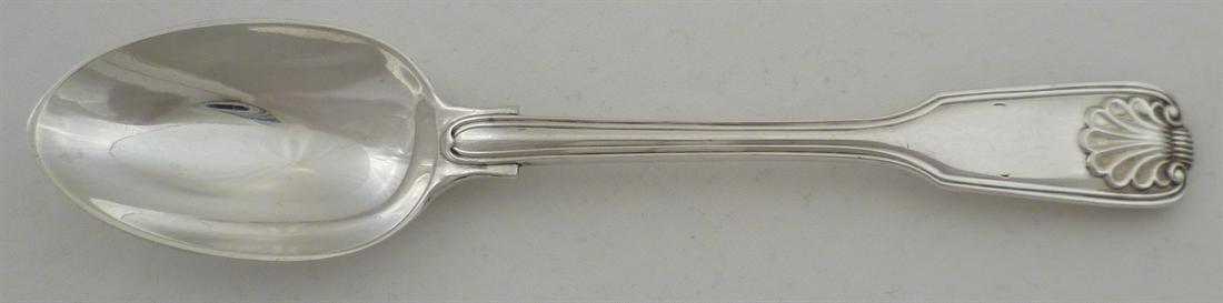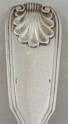 DESCRIPTION | Large and hefty Victorian solid silver Fiddle, Thread & Shell pattern teaspoon with a well executed frontal erasure. |