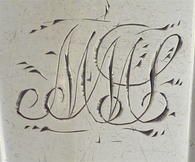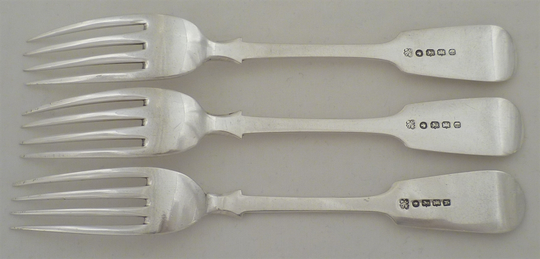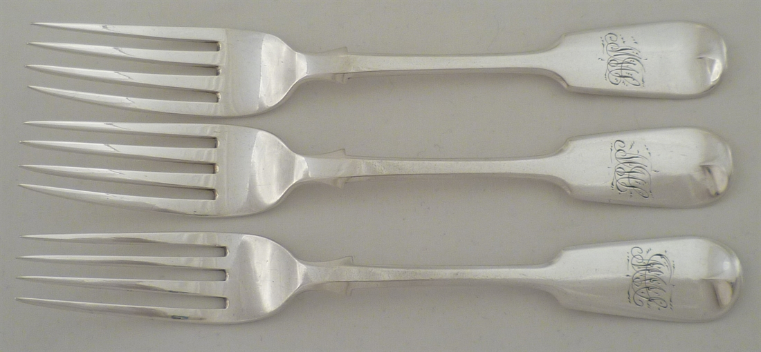 DESCRIPTION | Three Victorian solid silver Fiddle pattern dessert or salad forks with a frontal monogram engraving. |