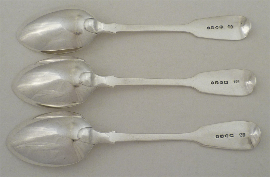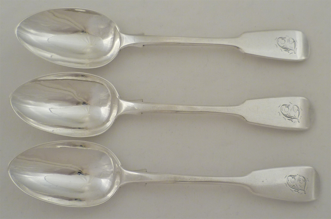 DESCRIPTION | Three Victorian solid silver Fiddle pattern dessert spoons with a frontal initial engraving. |