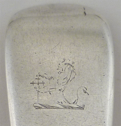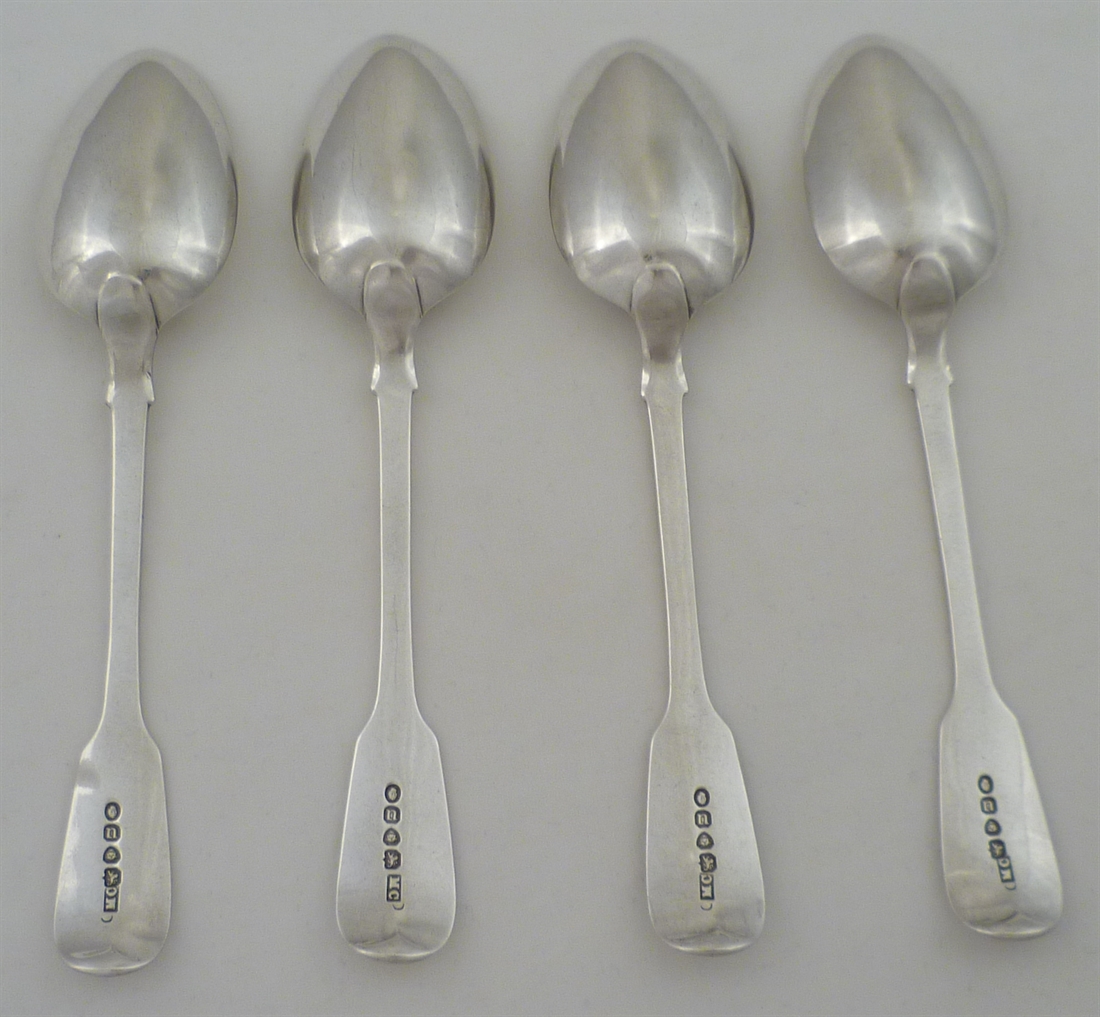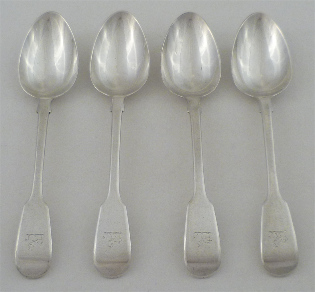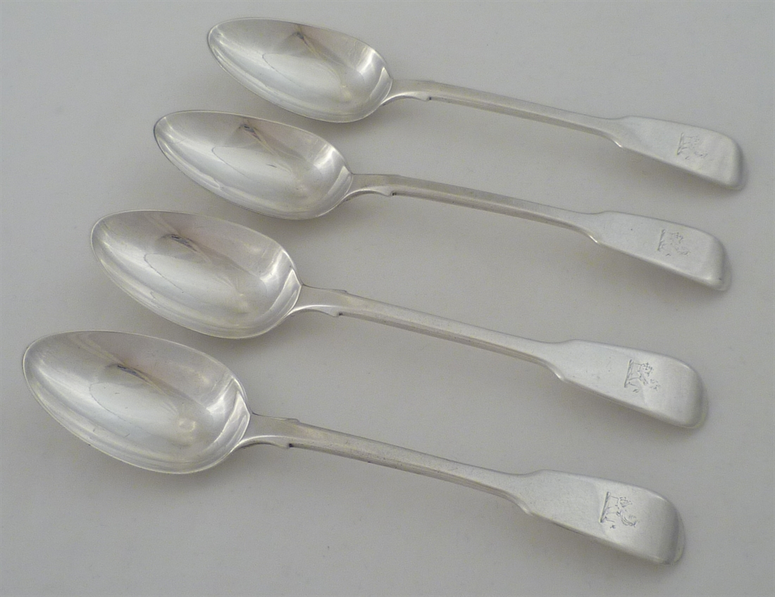 DESCRIPTION | Four William IV solid silver Fiddle pattern dessert spoons with a frontal crest engraving. |