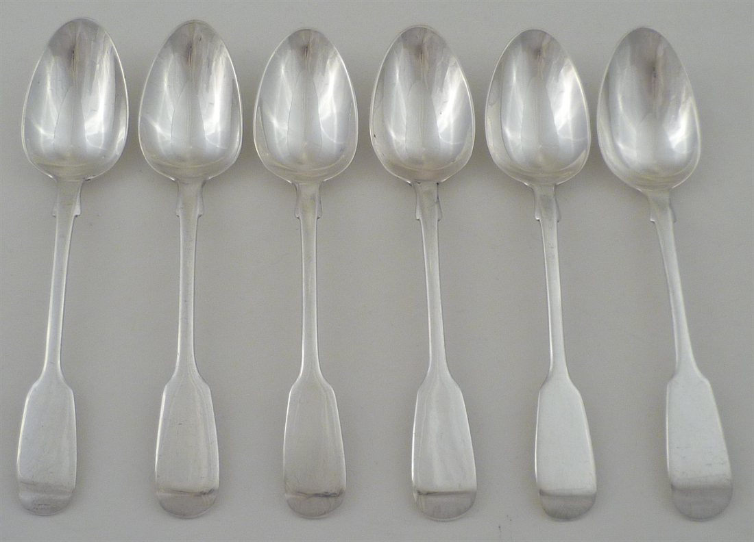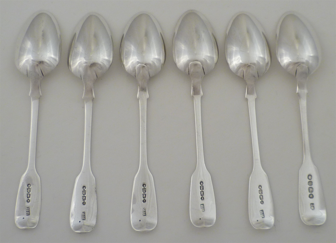 DESCRIPTION | Set of six (5+1) Victorian solid silver Fiddle pattern teaspoons with no engraving or erasure. |