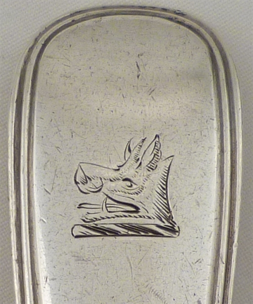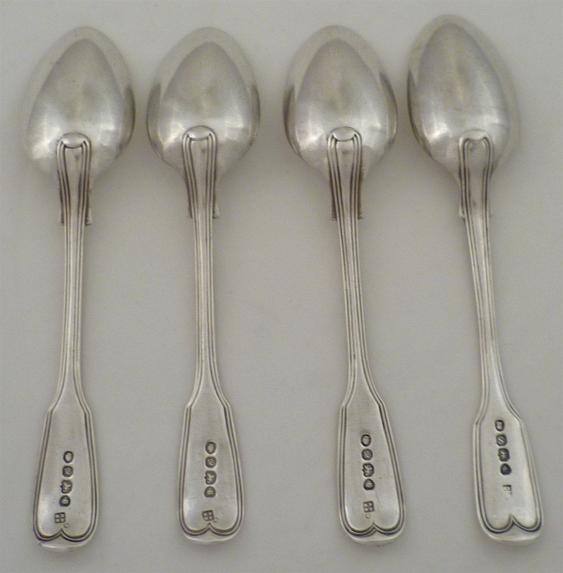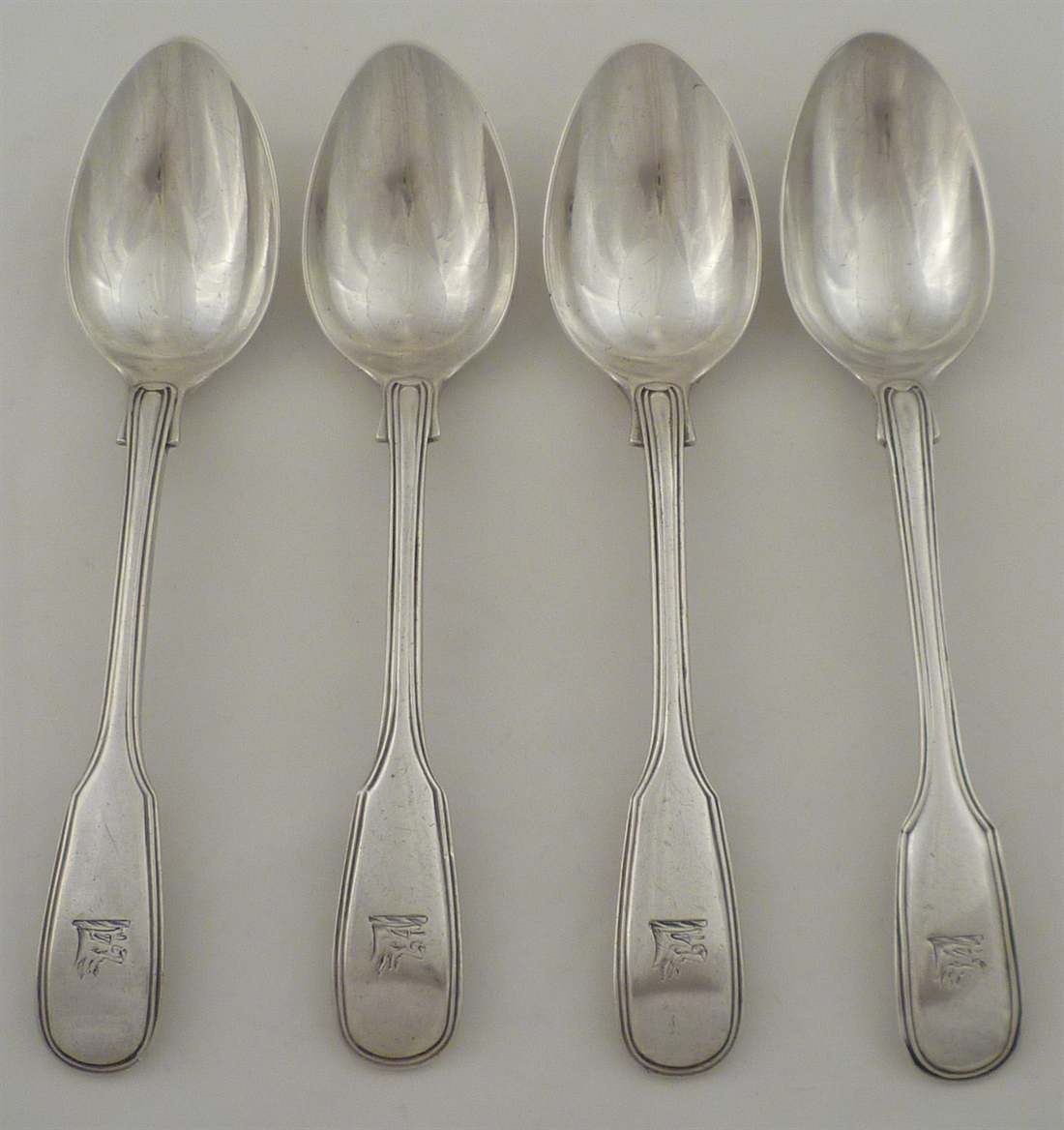 DESCRIPTION | Set of four William IV solid silver double struck Fiddle & Thread pattern teaspoons with a frontal crest engraving. |