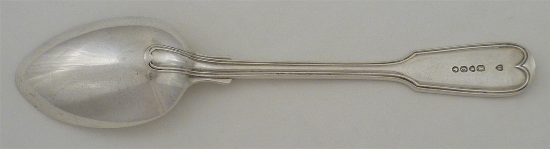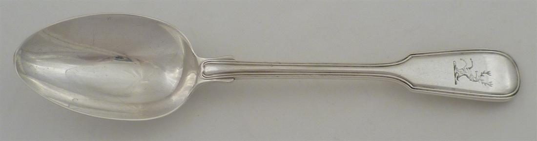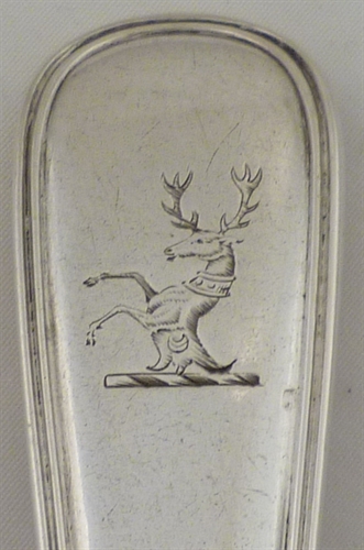 DESCRIPTION | One Victorian solid silver Fiddle & Thread pattern dessert spoon with a frontal stag crest engraving. |