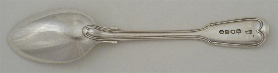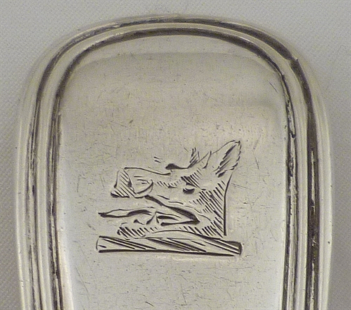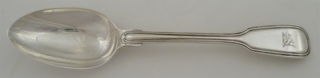 DESCRIPTION | One William IV solid silver Fiddle & Thread pattern dessert spoon with a frontal boar's head crest engraving. |