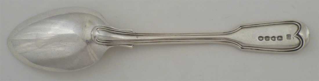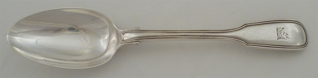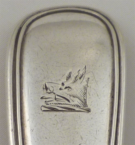DESCRIPTION | One William IV solid silver Fiddle & Thread pattern dessert spoon with a frontal boar's head crest engraving. |