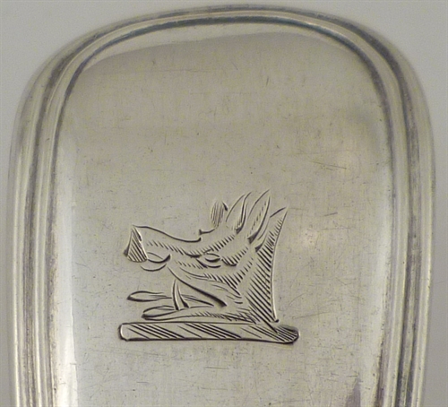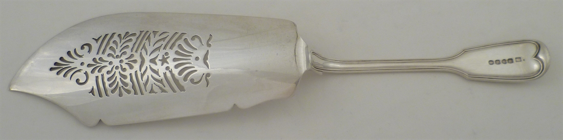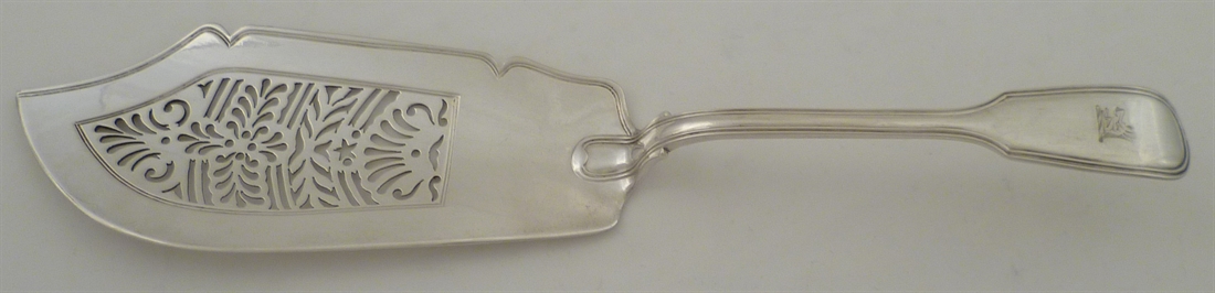 DESCRIPTION | Very good William IV solid silver Fiddle & Thread pattern fish serving slice with a frontal boar's head engraving and a superb hand pierced blade. |
