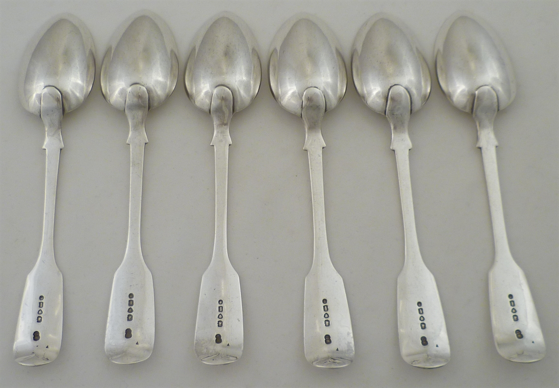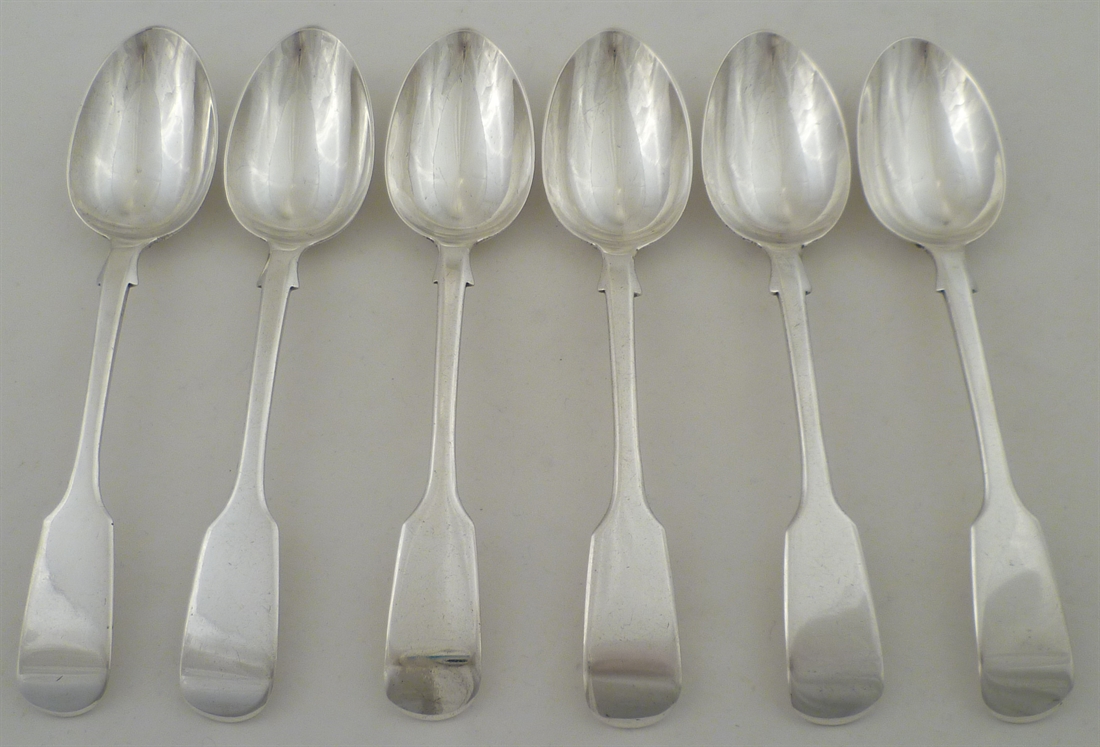 DESCRIPTION | Set of six Victorian solid silver Fiddle pattern dessert spoons with no engraving or erasure. |