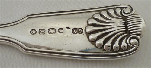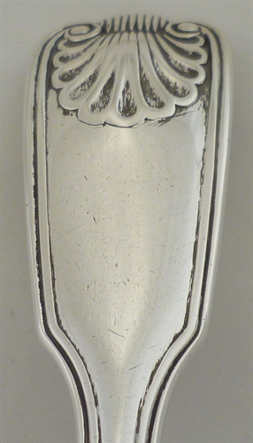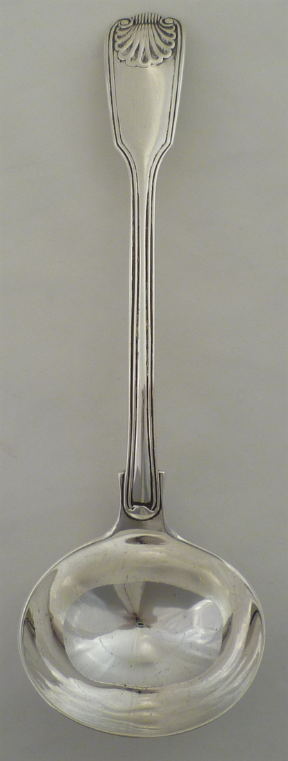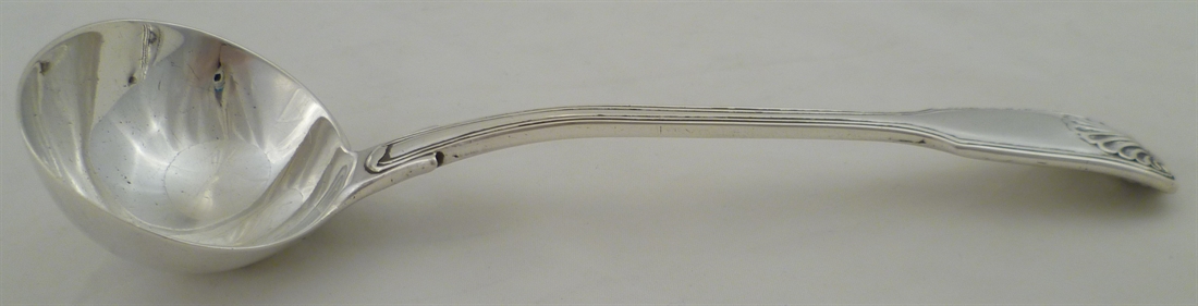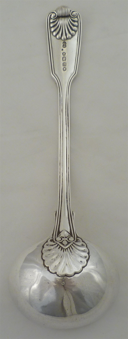 DESCRIPTION | Victorian solid silver double struck Fiddle, Thread & Shell pattern sauce ladle with a frontal erasure. |