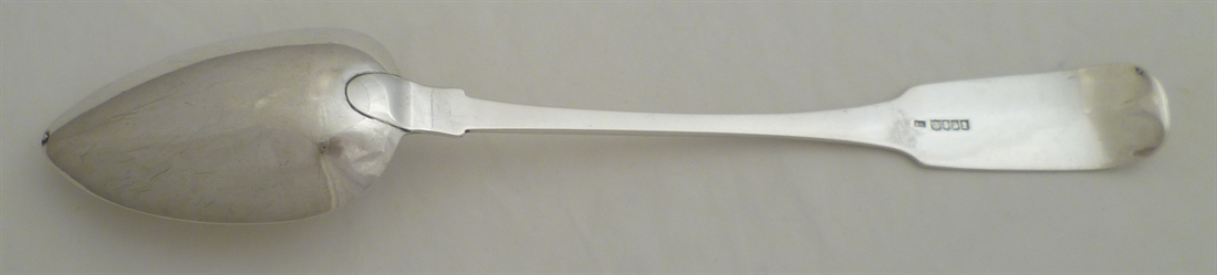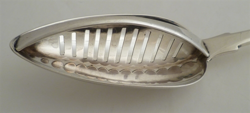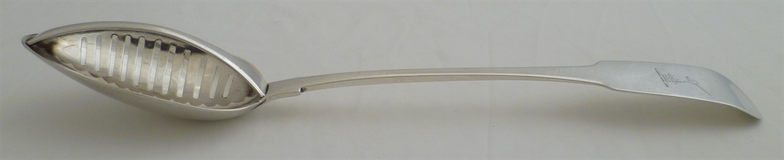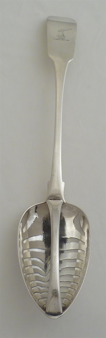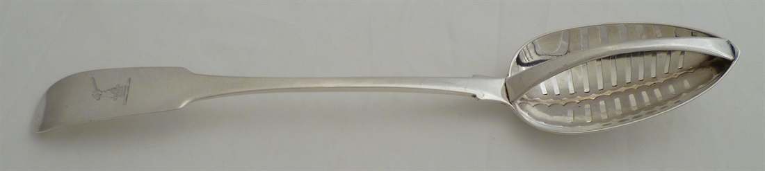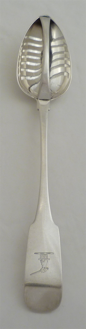 DESCRIPTION | Superb Irish Georgian solid silver Fiddle pattern straining spoon with a frontal crest engraving and wonderfully clear hallmarks. |