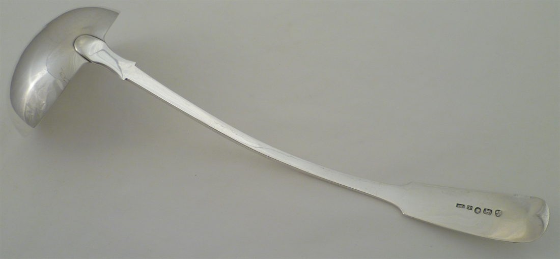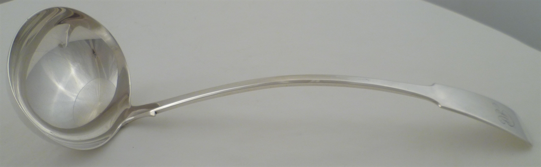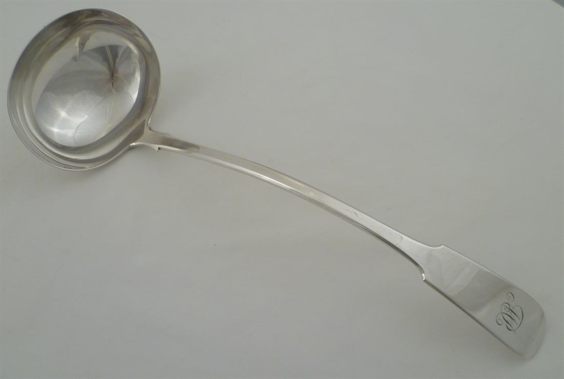 DESCRIPTION | Good William IV solid silver Fiddle pattern soup ladle with an oval bowl and a frontal monogram engraving. |