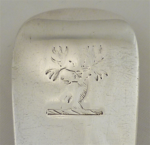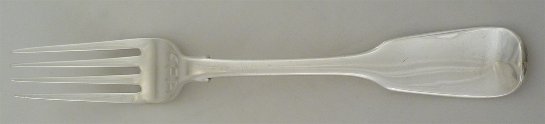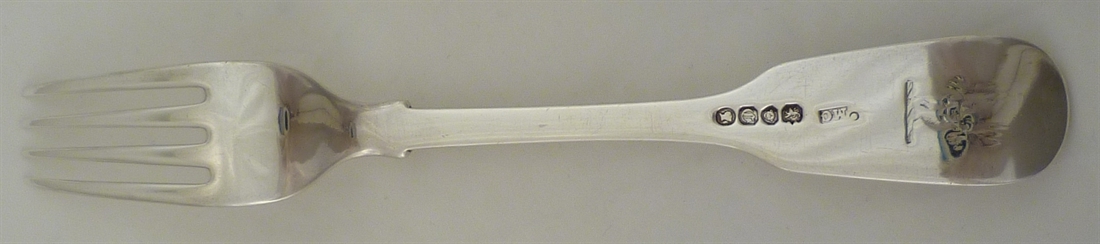 DESCRIPTION | Early Victorian solid silver Fiddle pattern table fork with a stag crest engraving verso. |