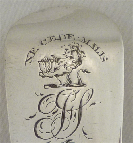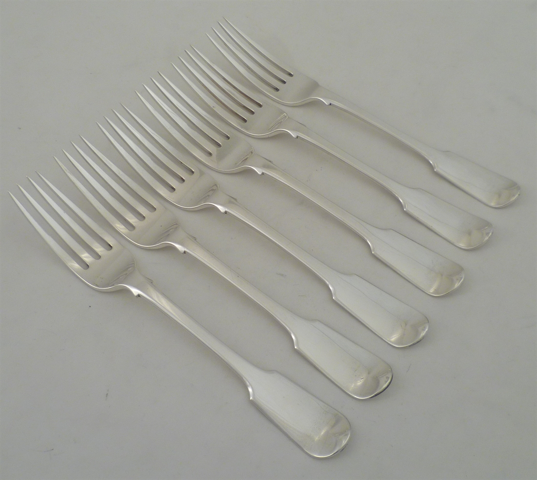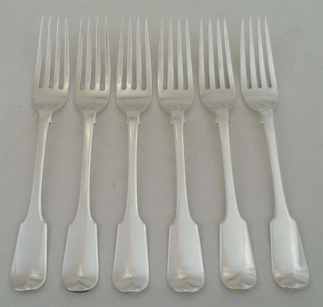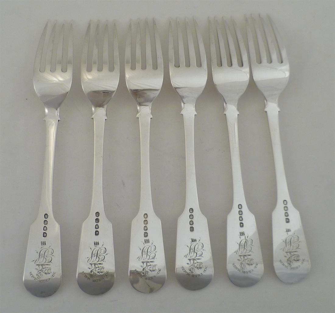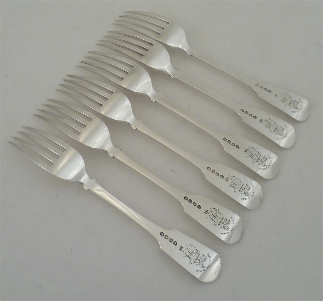 DESCRIPTION | Superb set of six Georgian solid silver Fiddle pattern table forks with motto, crest and monogram engraving verso. |