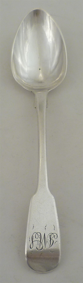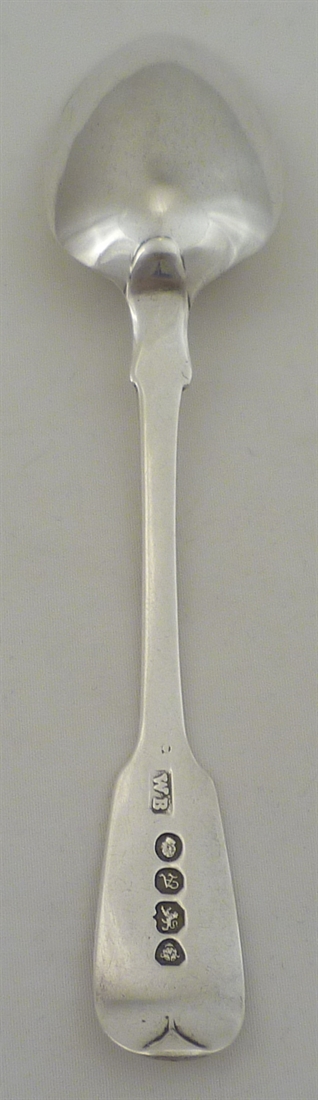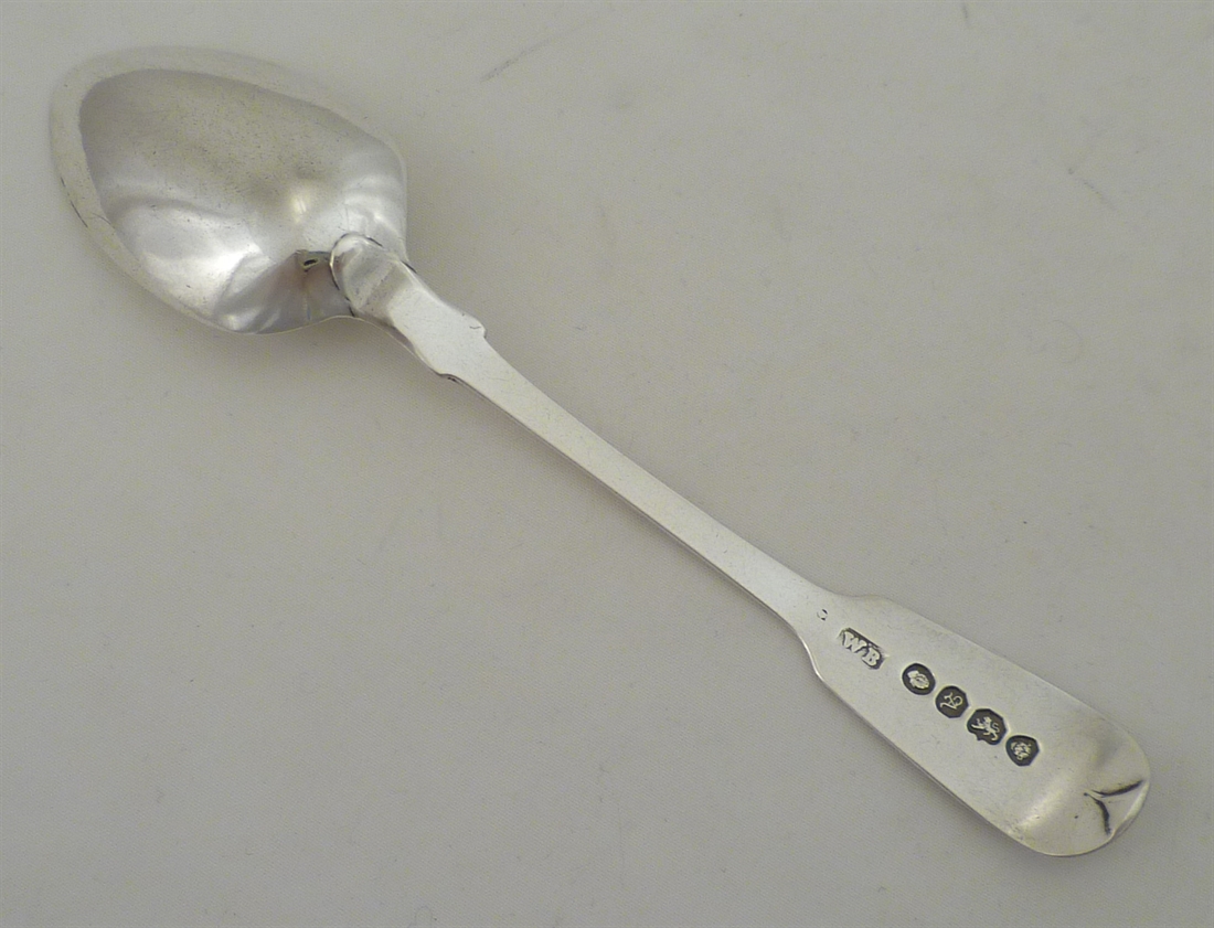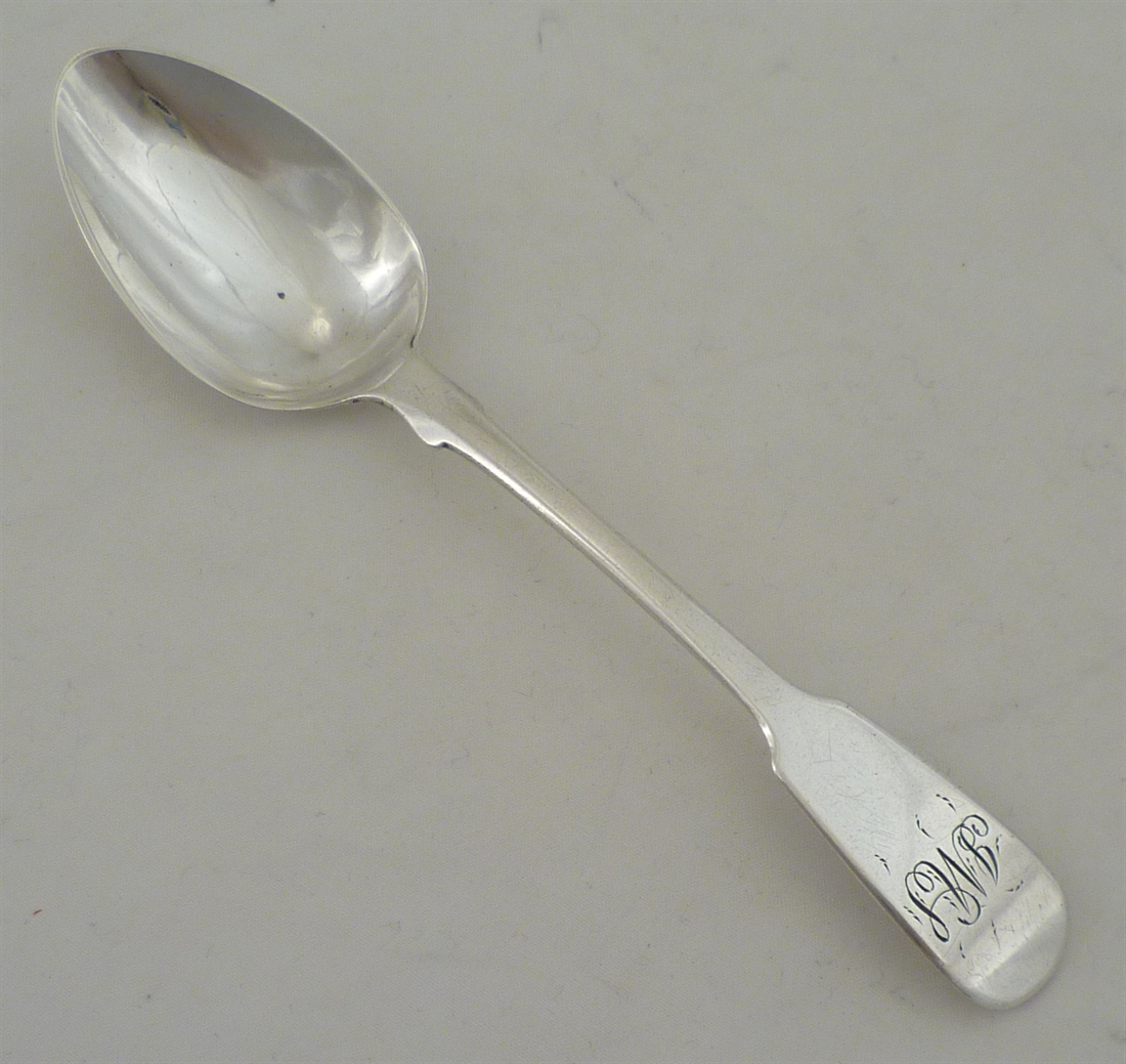 DESCRIPTION | Single William IV solid silver Fiddle pattern teaspoon with a frontal monogram engraving. |