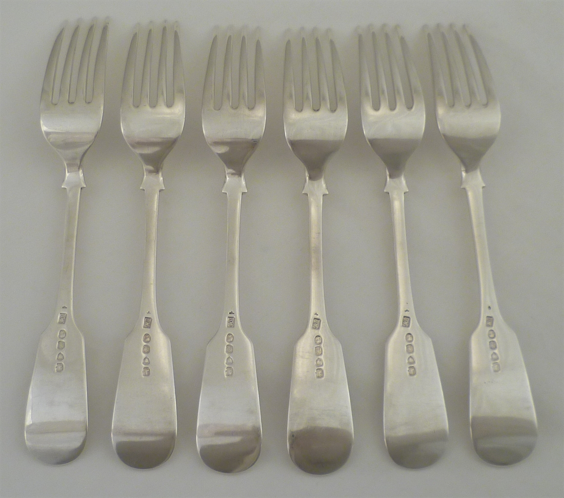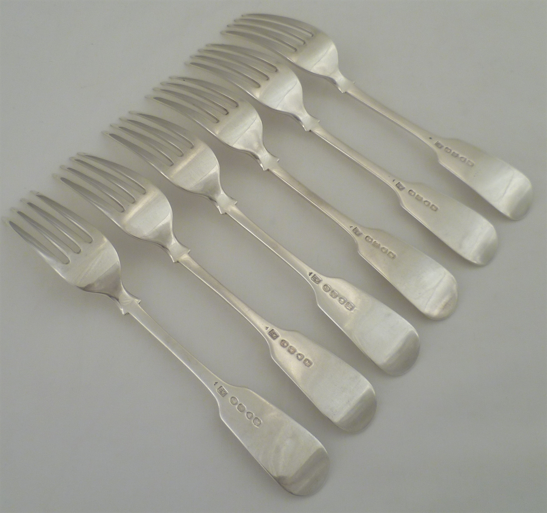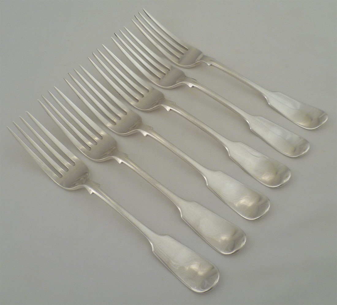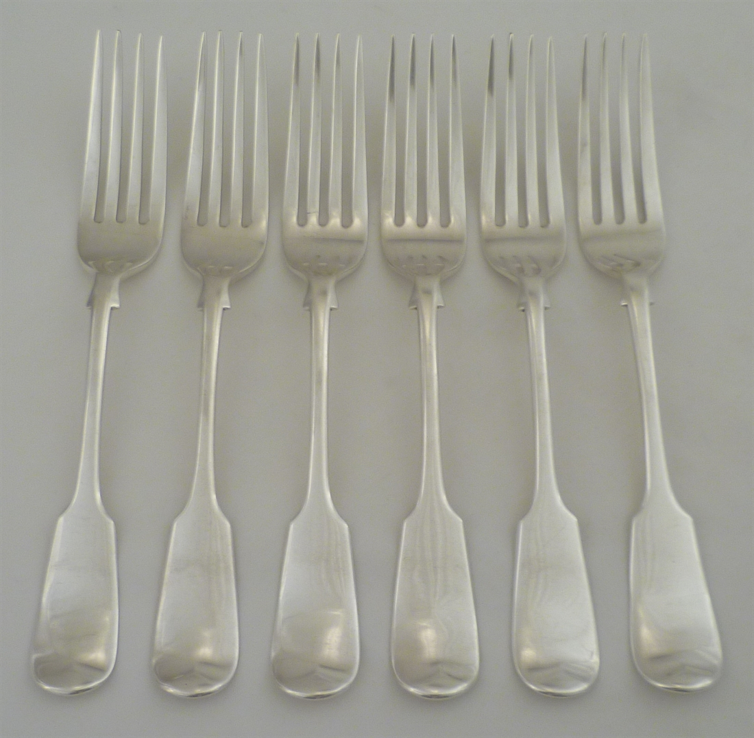 DESCRIPTION | Set of six Victorian solid silver Fiddle pattern table forks with no engraving and possible very well executed frontal erasures. |