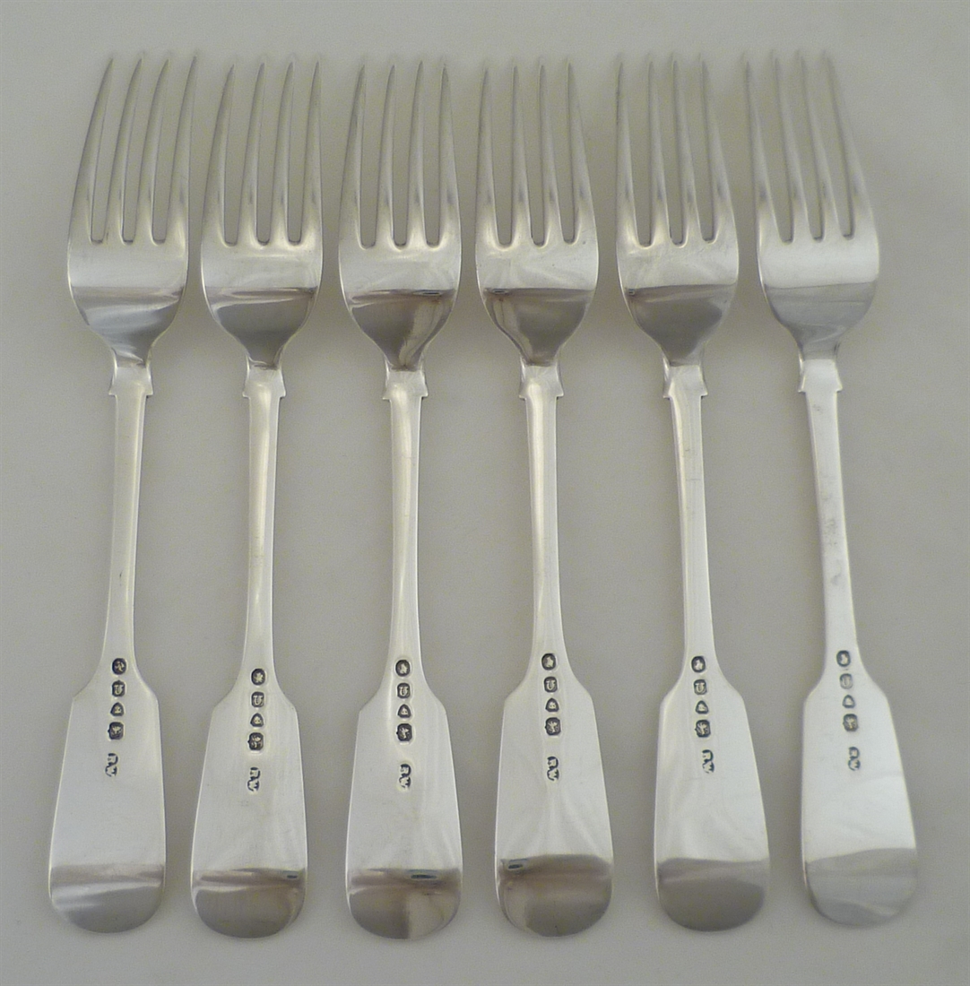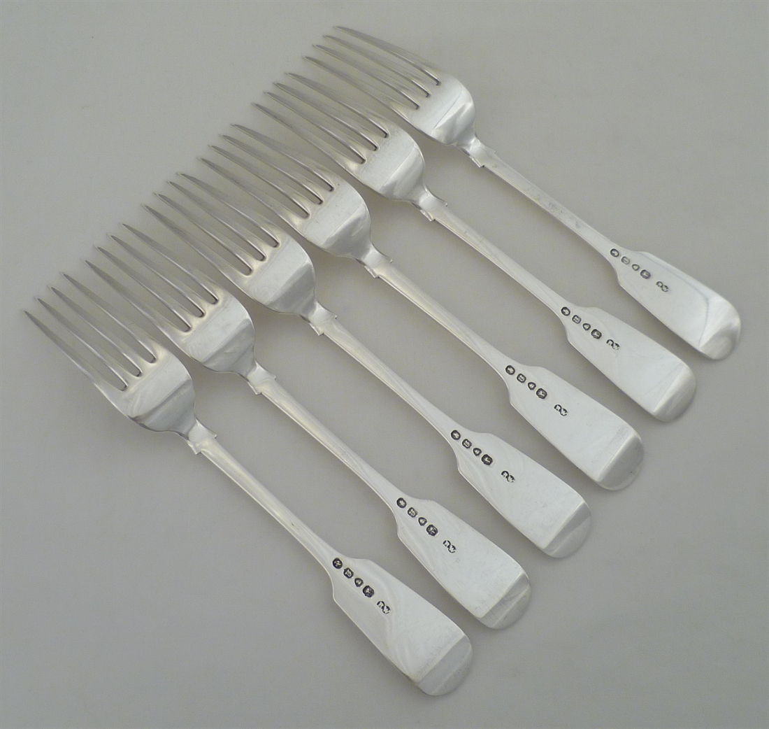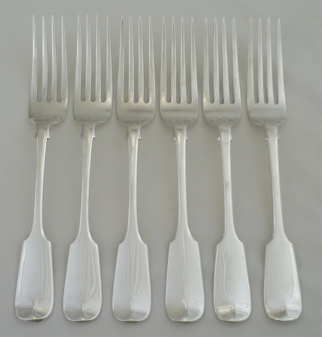 DESCRIPTION | Very good set of six Victorian solid silver Fiddle pattern table forks with no engraving or erasure. |