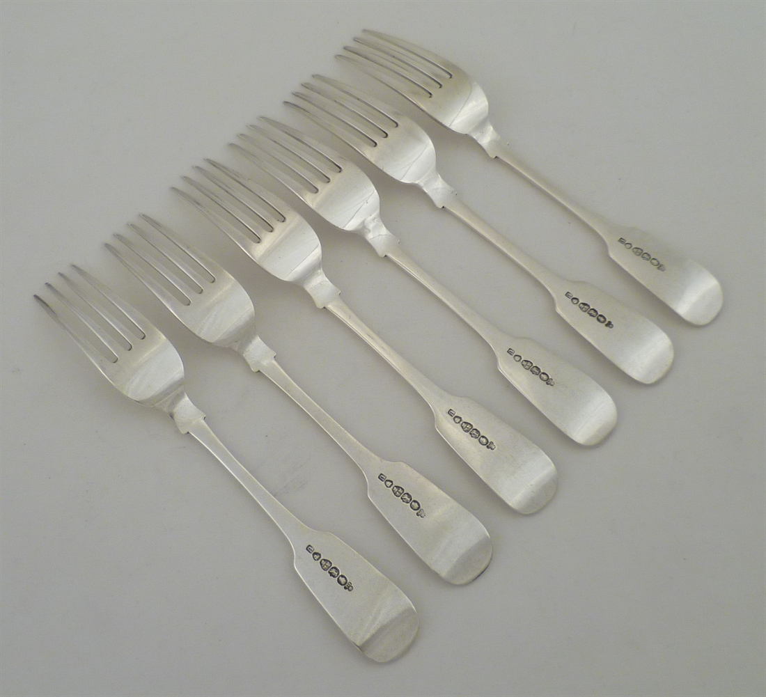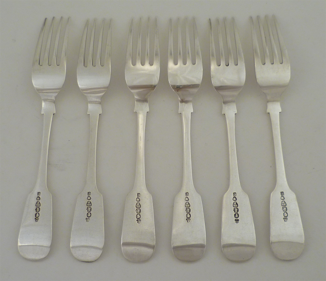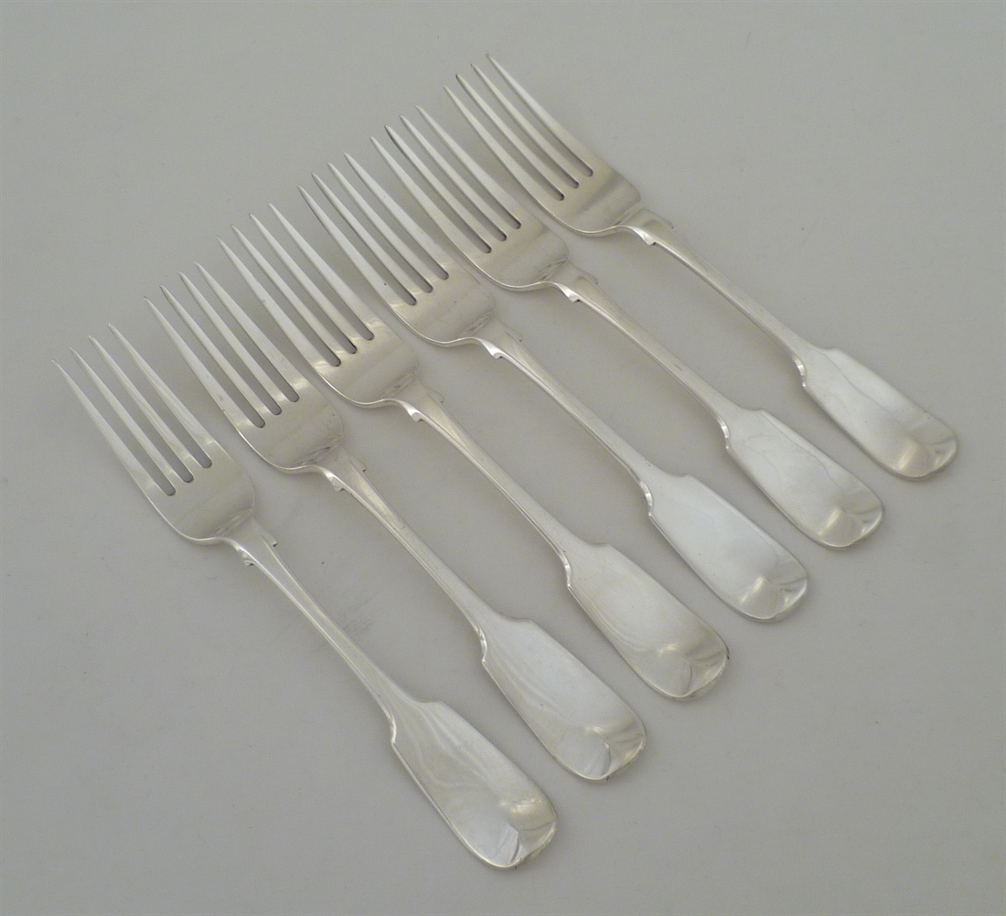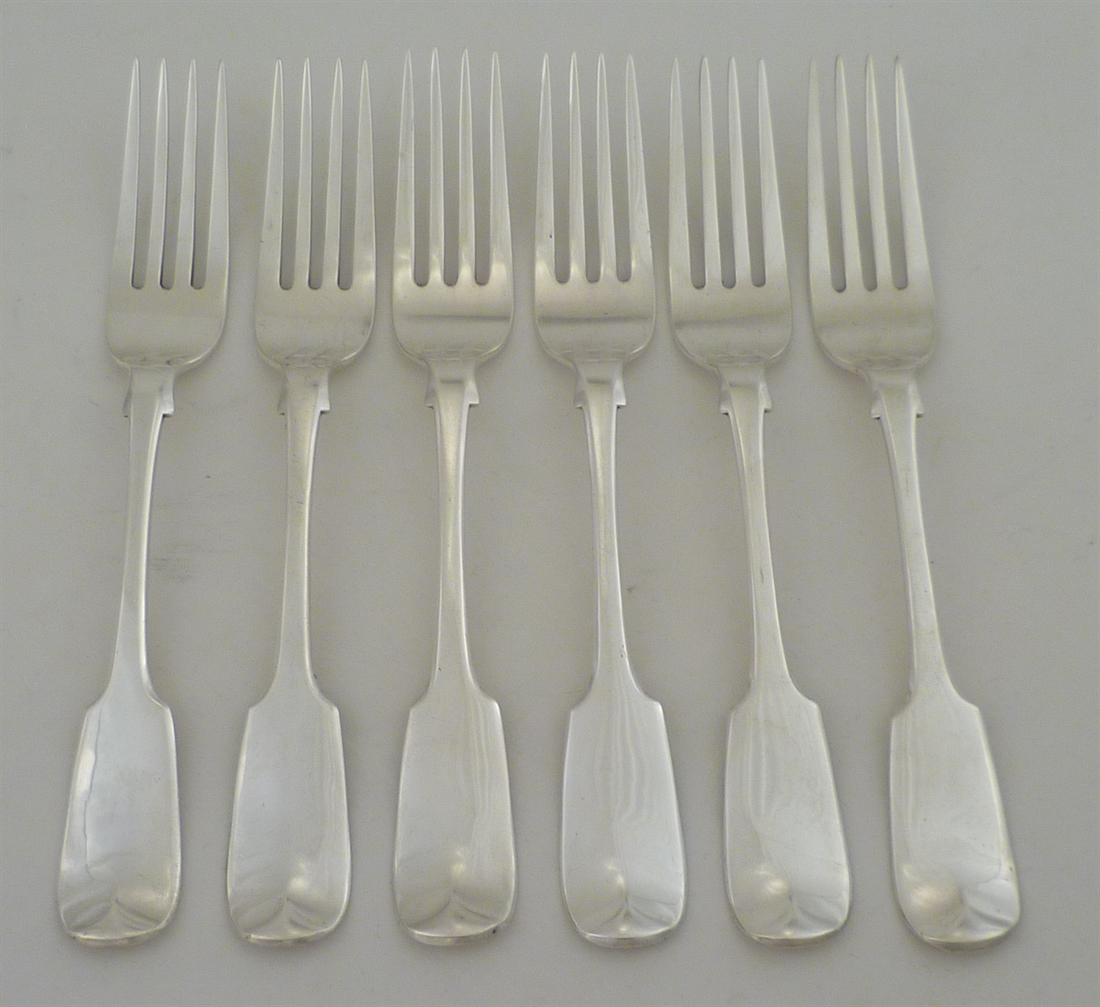 DESCRIPTION | Good set of six Victorian solid silver Fiddle pattern dessert or salad forks with no engraving. |