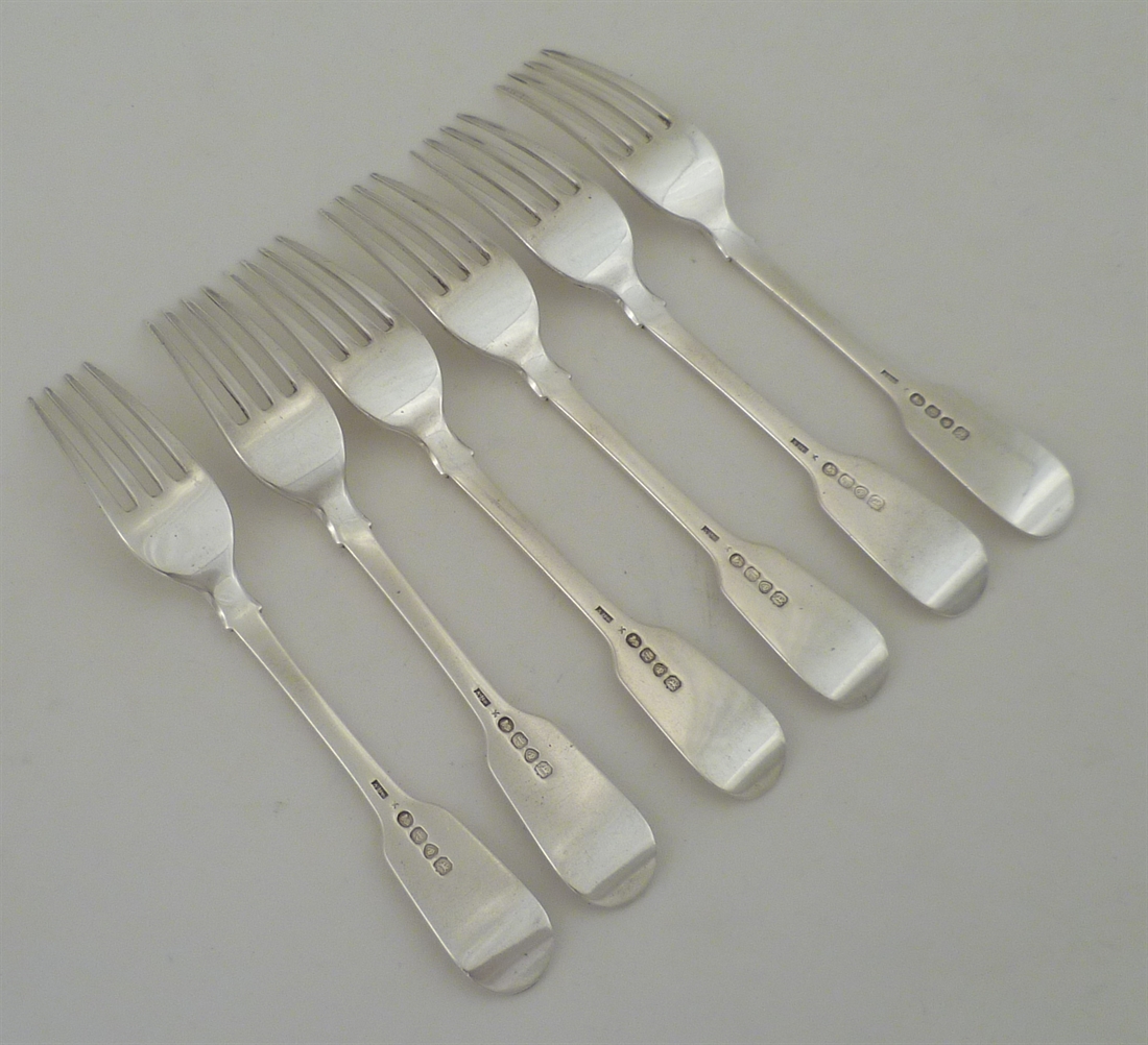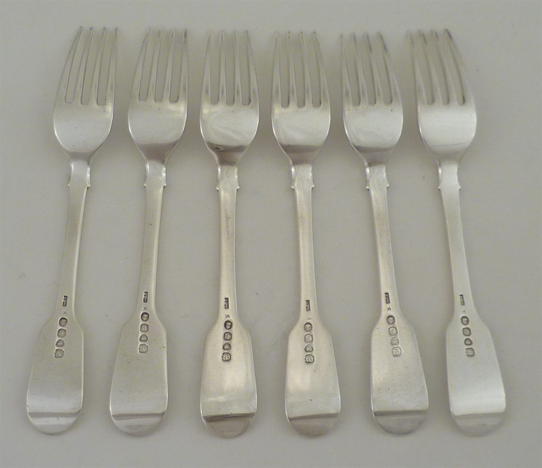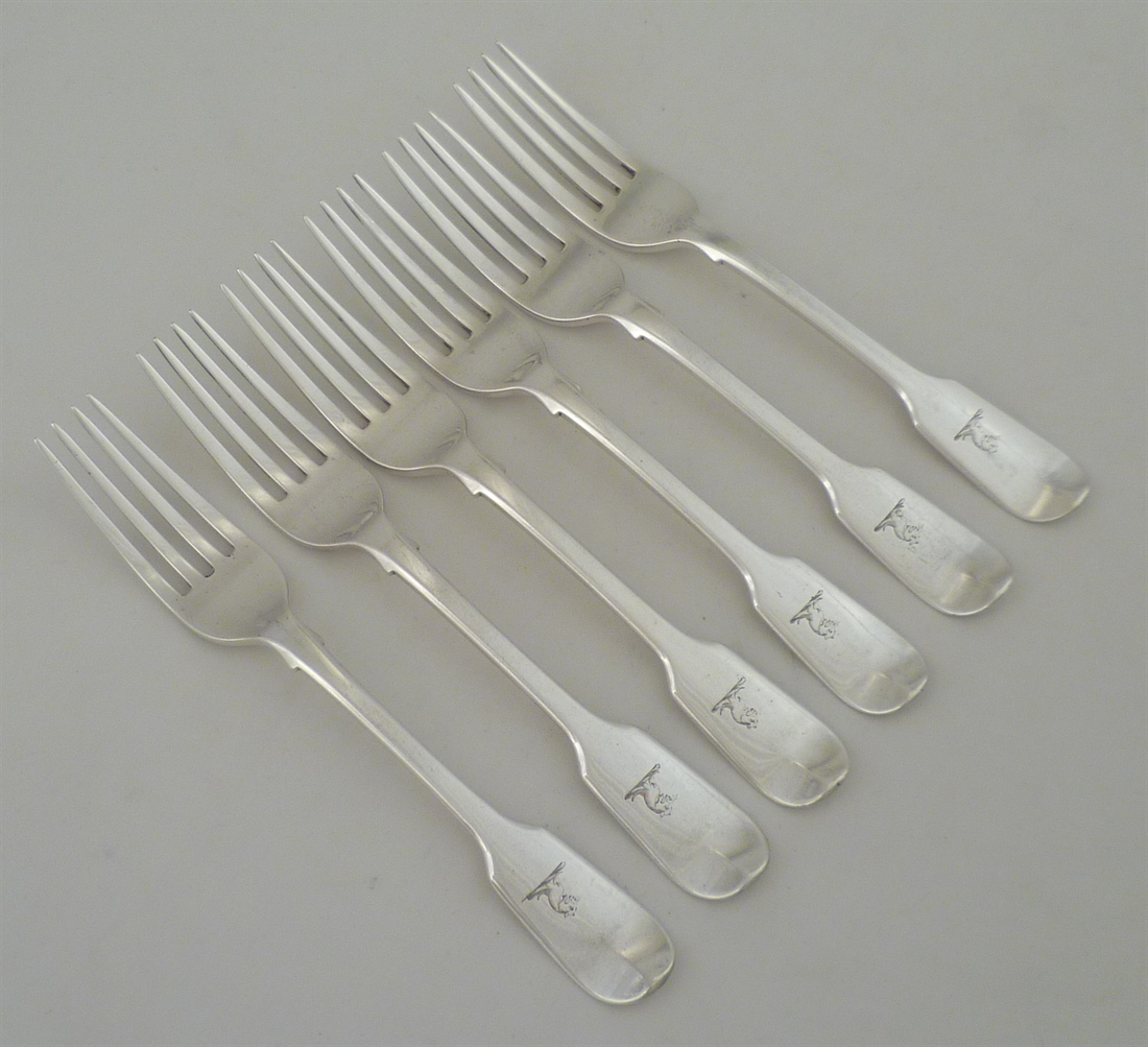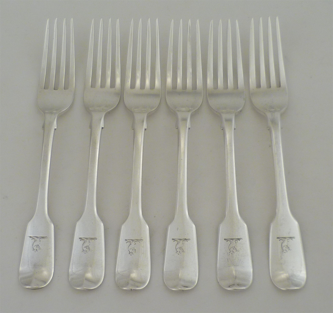 DESCRIPTION | Set of six William IV solid silver Fiddle pattern dessert or salad forks with a frontal crest engraving. |