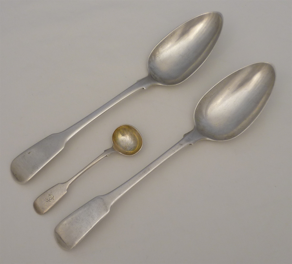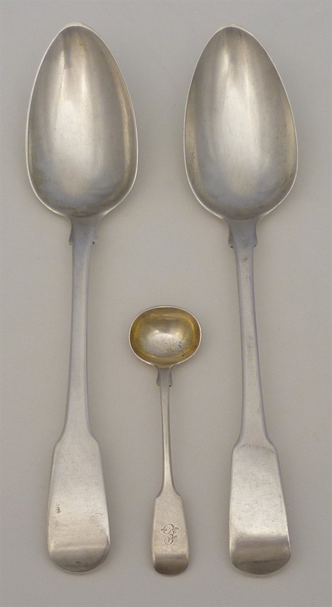 DESCRIPTION | Exceptionally good pair of English Georgian solid silver Fiddle pattern table spoons with no engraving or erasure. Plus one FREE Victorian silver gilt Fiddle pattern salt spoon. |