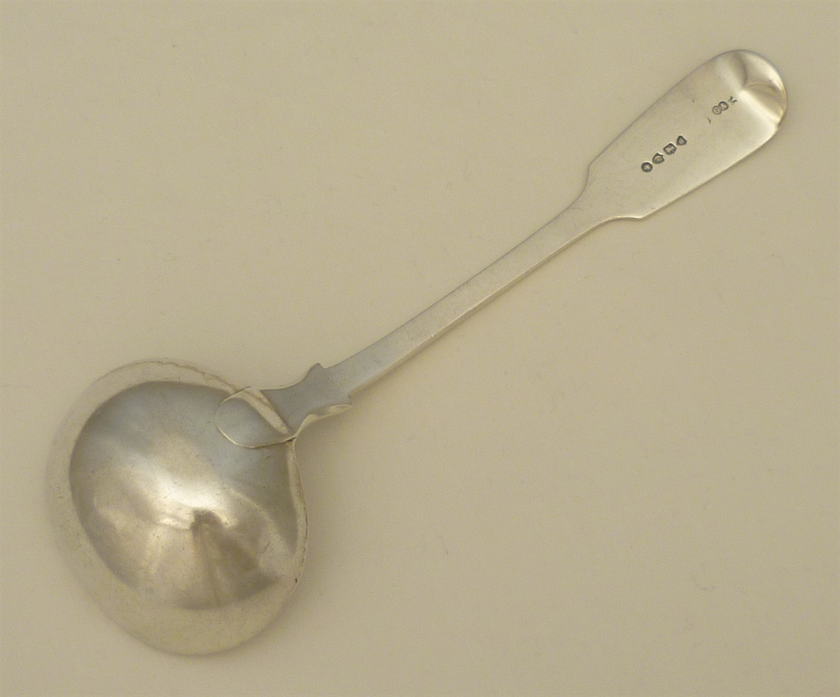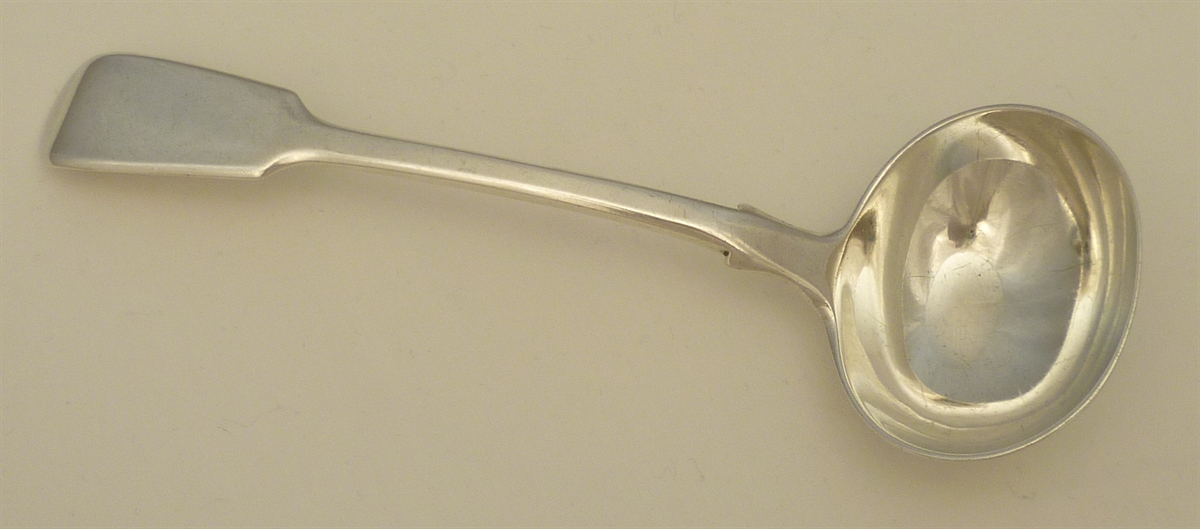 DESCRIPTION | Very good English Victorian solid sterling silver Fiddle pattern sauce ladle with no engraving or erasure. |