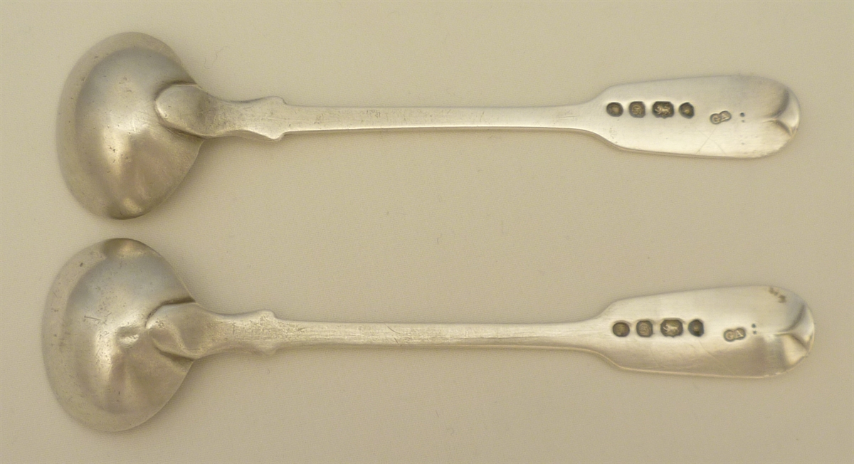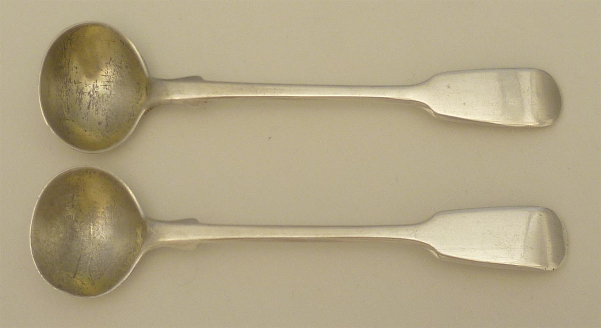 DESCRIPTION | Pair of English Victorian solid sterling silver Fiddle pattern salt spoons with oval bowls and no engraving or erasure. |