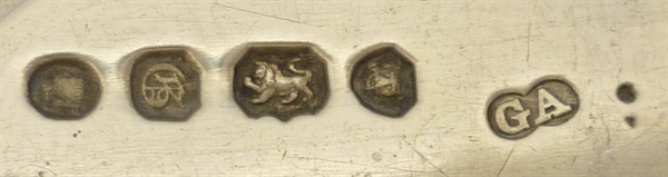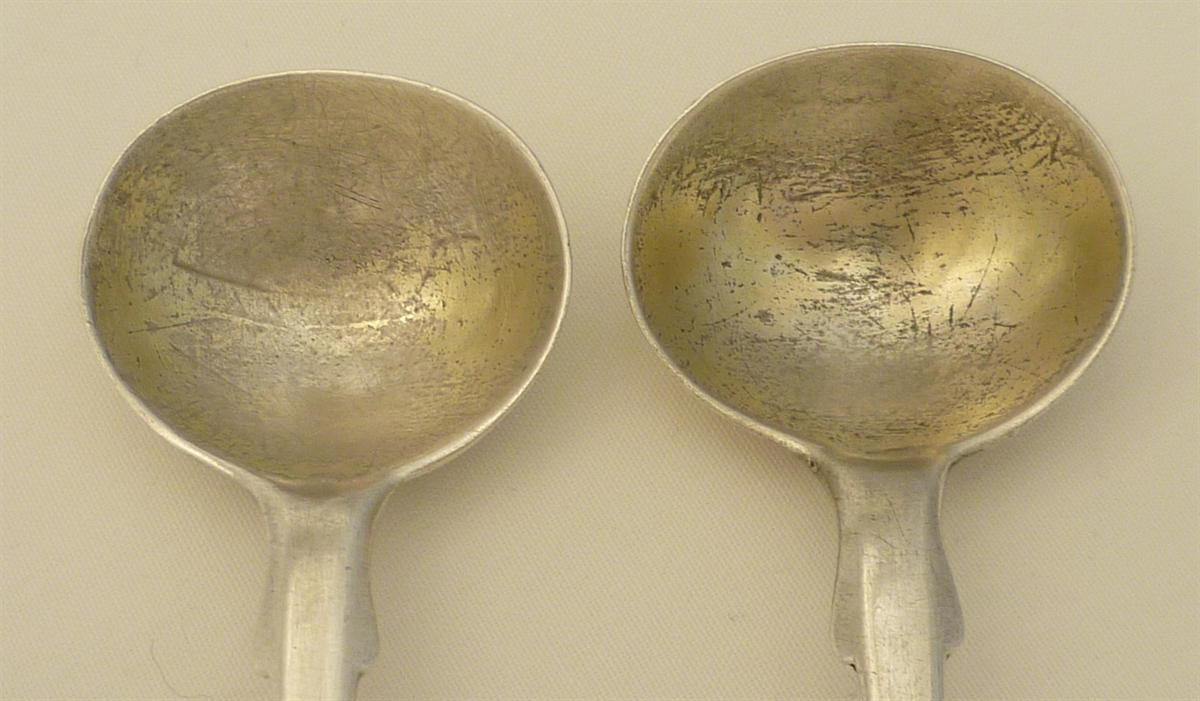 CONDITION | fair used, good hallmarks, no engraving or erasure, kink to one terminal, small bowl bumps, both bowls with salt pitting and surface marks but not thin |