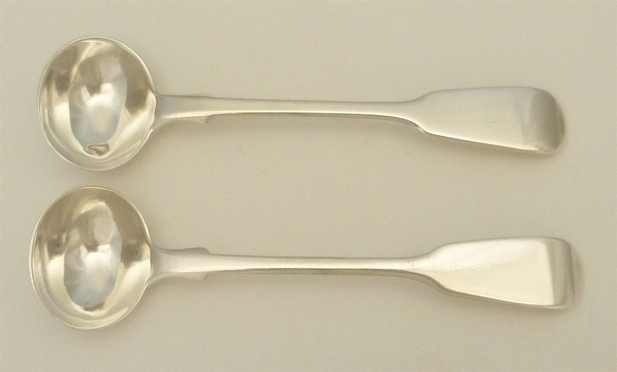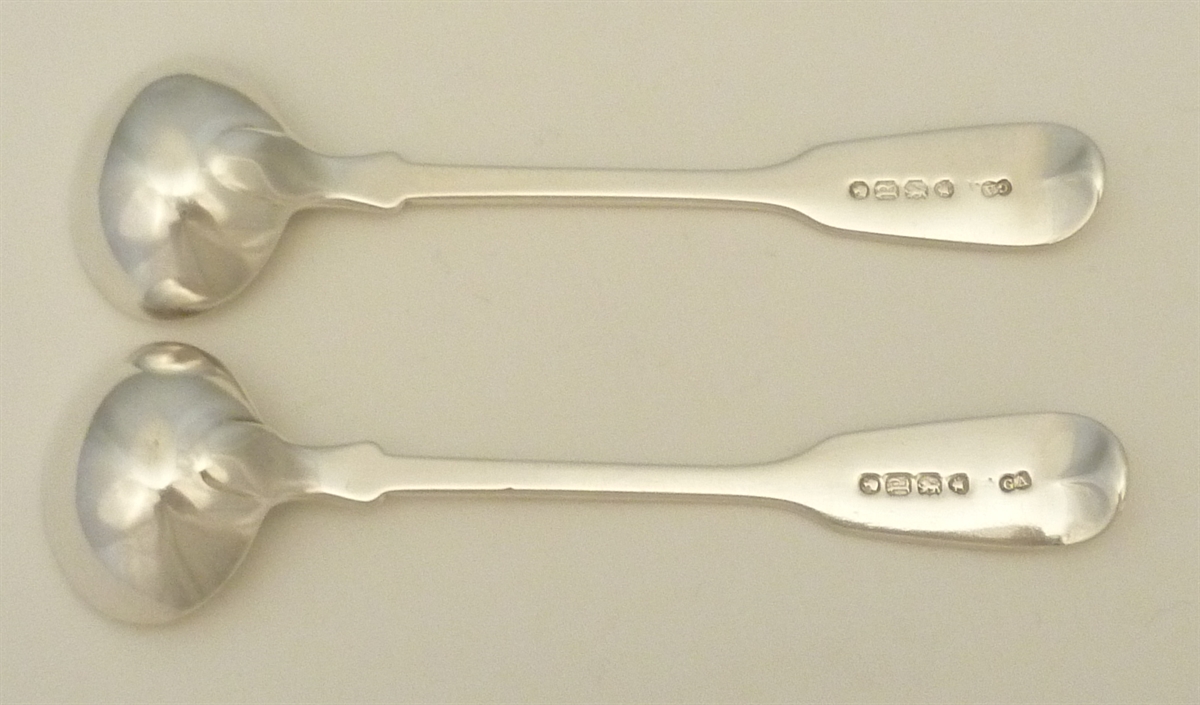 DESCRIPTION | Pair of English Victorian solid sterling silver Fiddle pattern salt spoons with oval bowls and no engraving. |