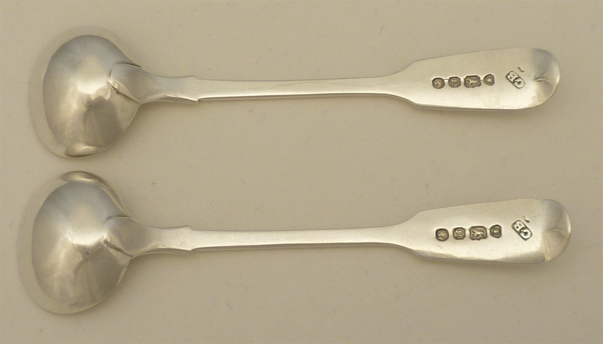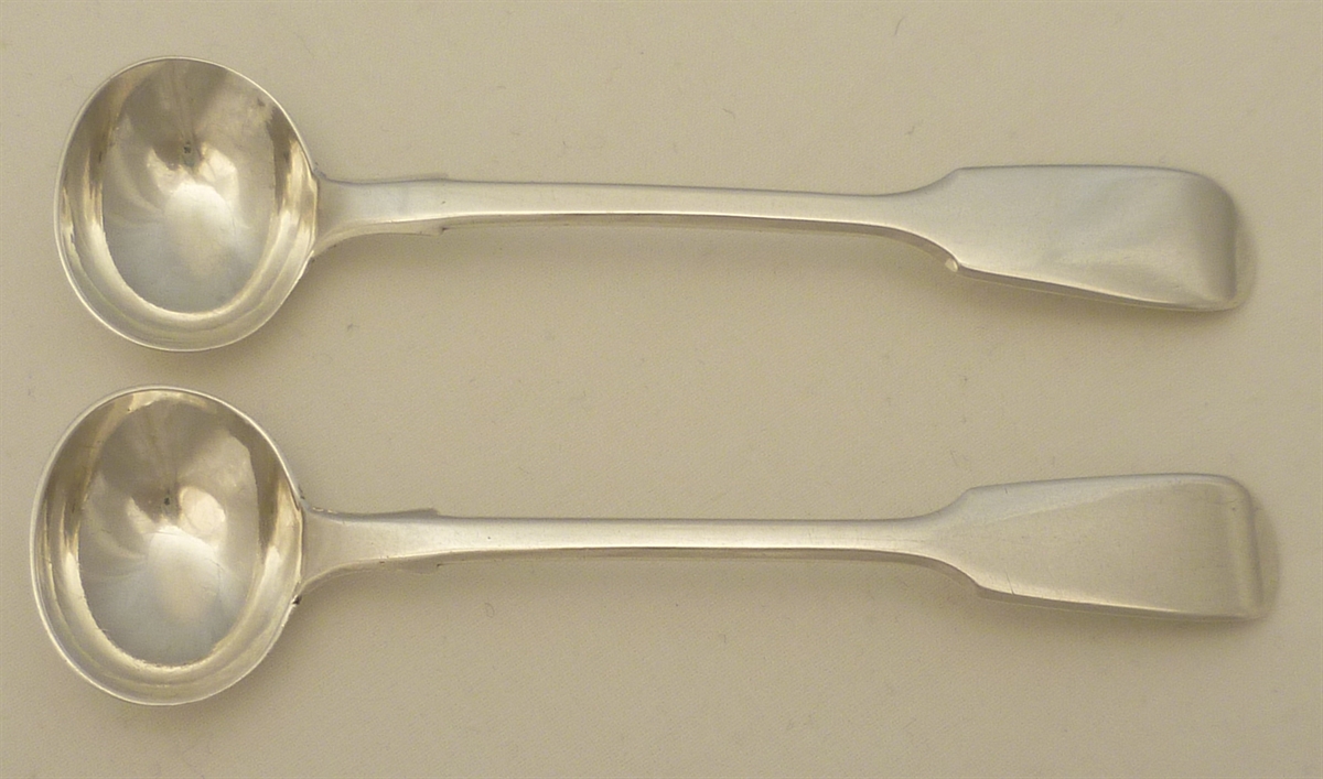 DESCRIPTION | Pair of English Victorian solid sterling silver Fiddle pattern salt spoons with oval bowls and no engraving or erasure. |