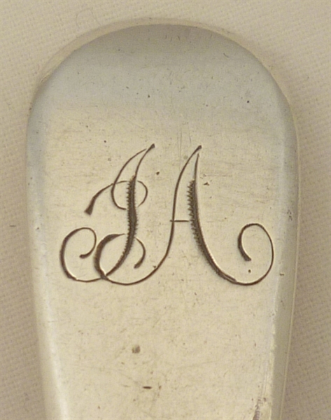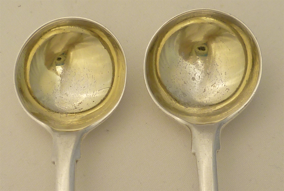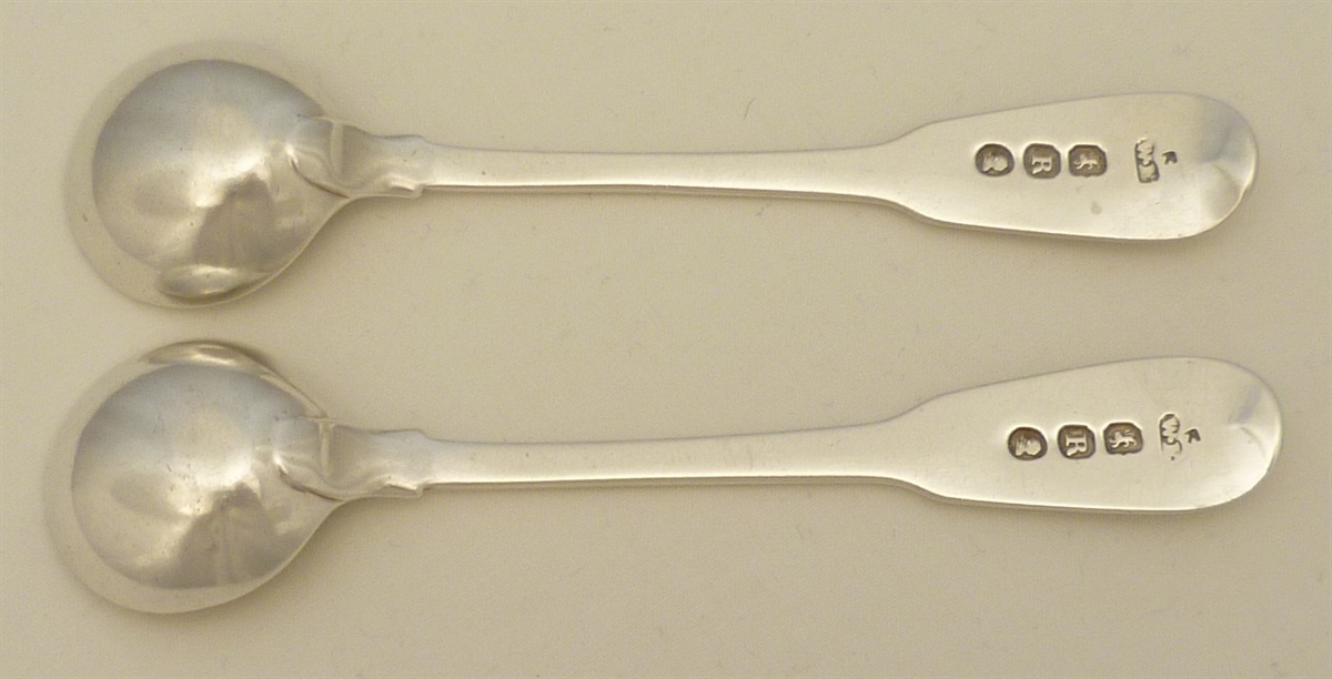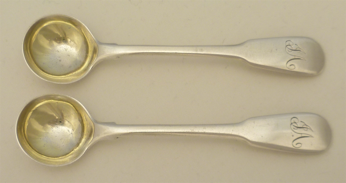 DESCRIPTION | Pair of English Georgian solid sterling silver Fiddle pattern salt spoons with round bowls and frontal monogram engraving. |