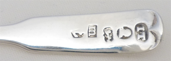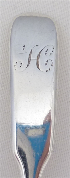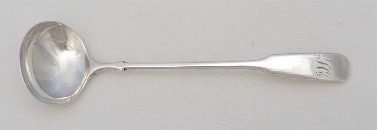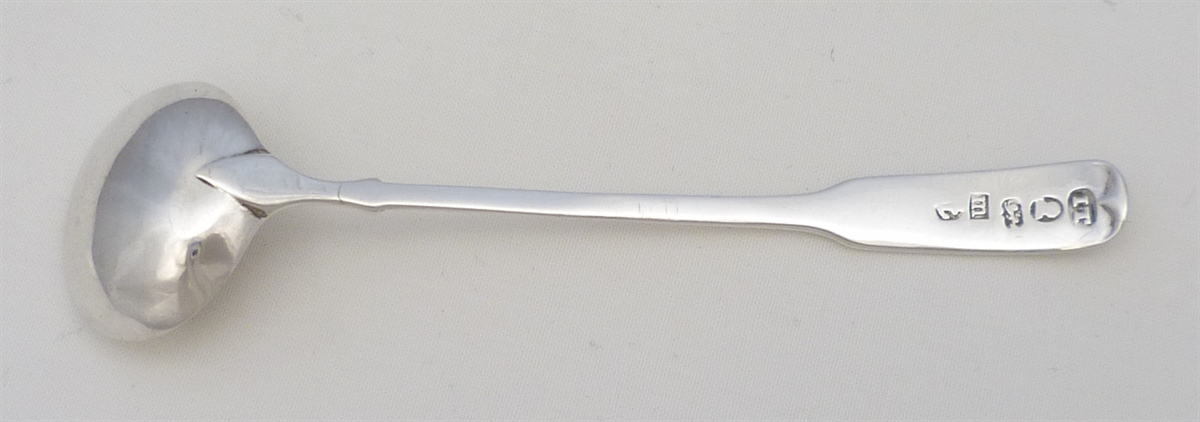 DESCRIPTION | Curious and scarce English Georgian solid sterling silver Fiddle pattern salt spoon. Light construction, unusually long and narrow terminal and small rat tail to the bowl. I have only had three of these before, same maker, Birmingham 1813 and with a very similar monogram. Those were in very poor condition and you can see them here: item m7081 This one is a far better example. |