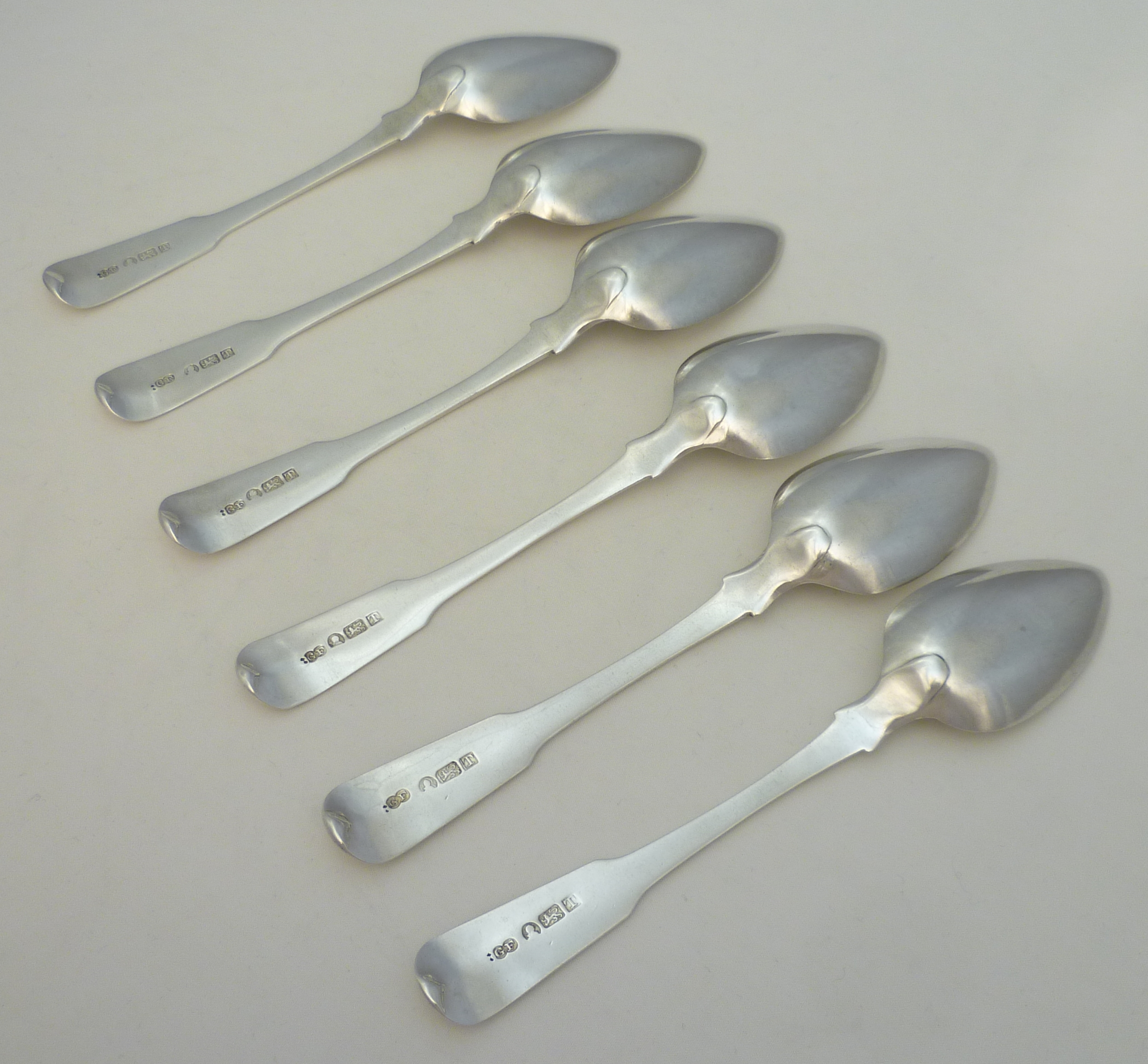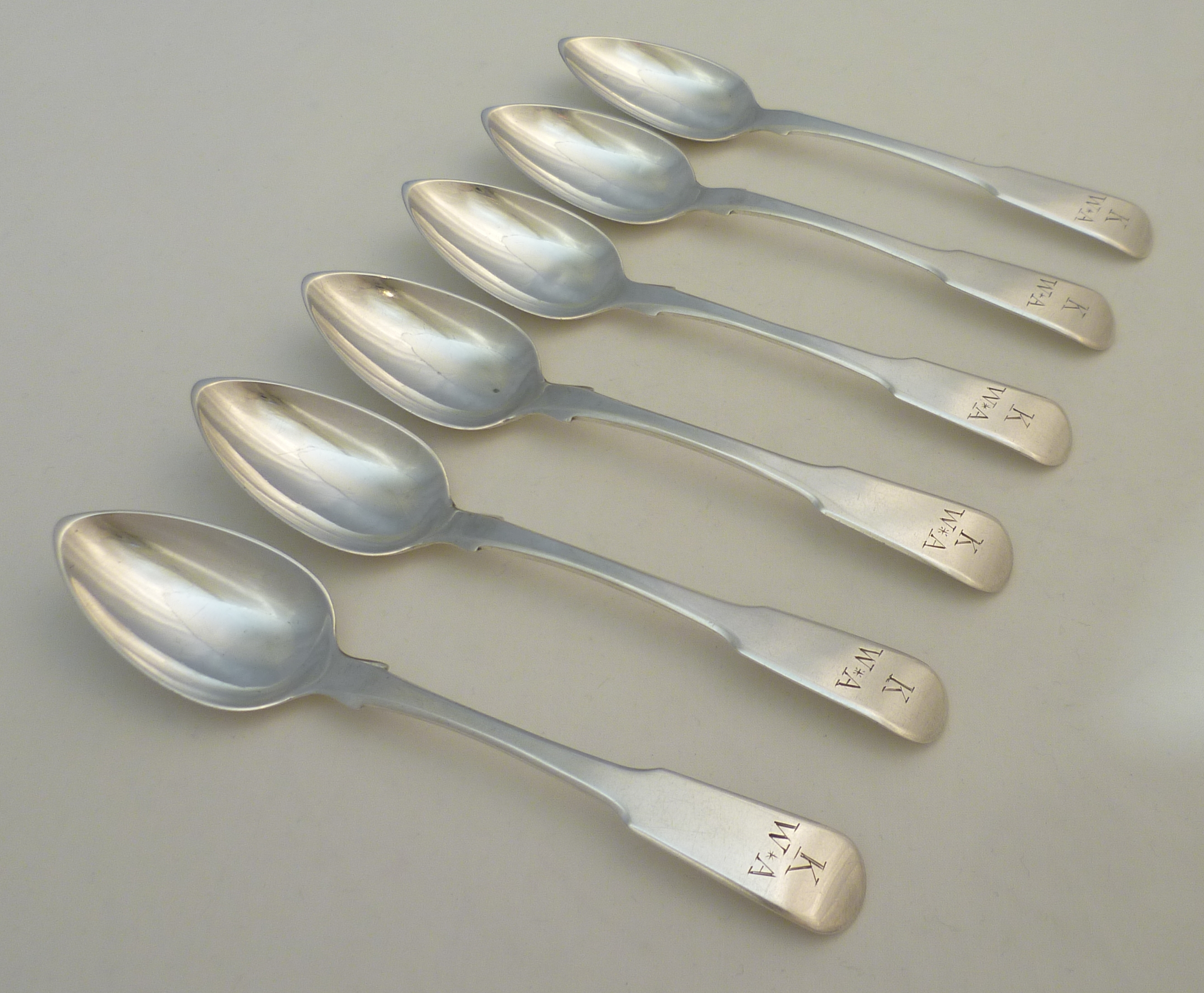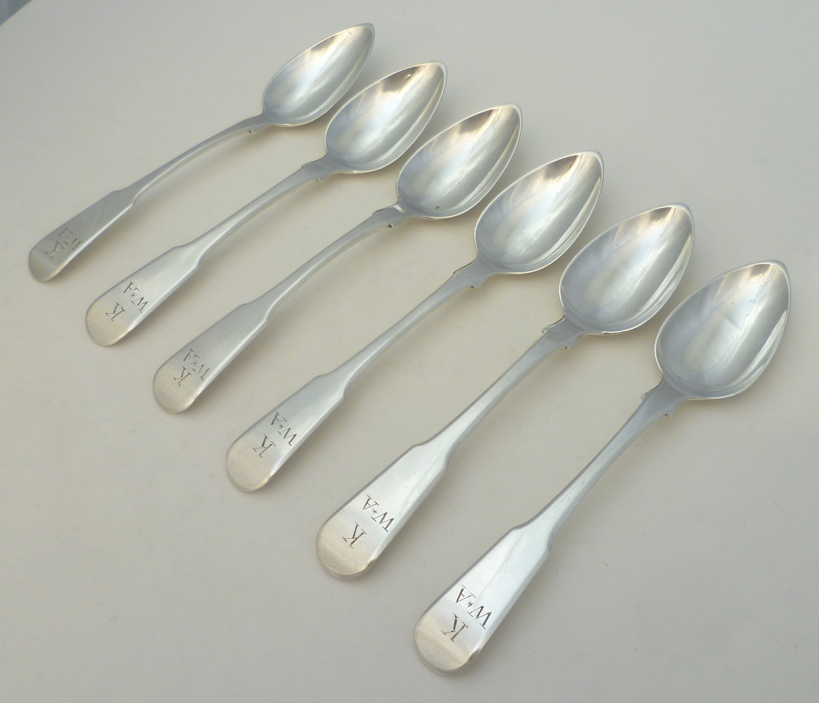 DESCRIPTION | Set of six English Georgian solid sterling silver Fiddle pattern teaspoons with the original frontal initials engraving and wonderful hallmarks. |