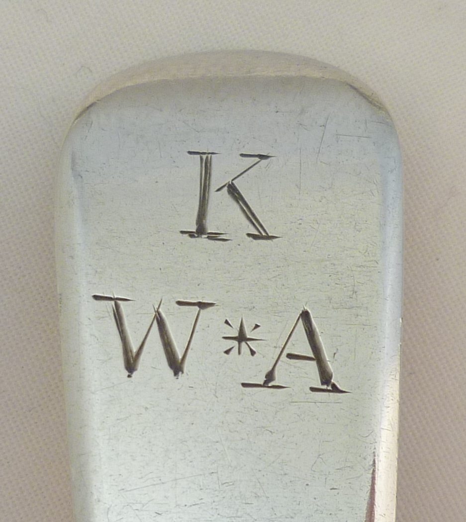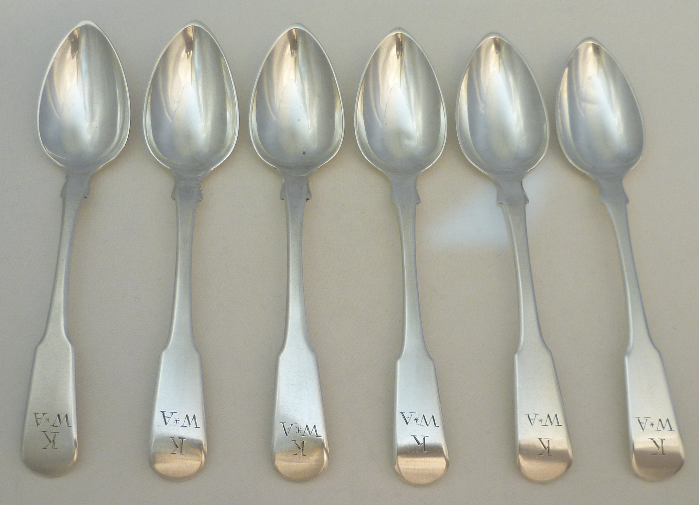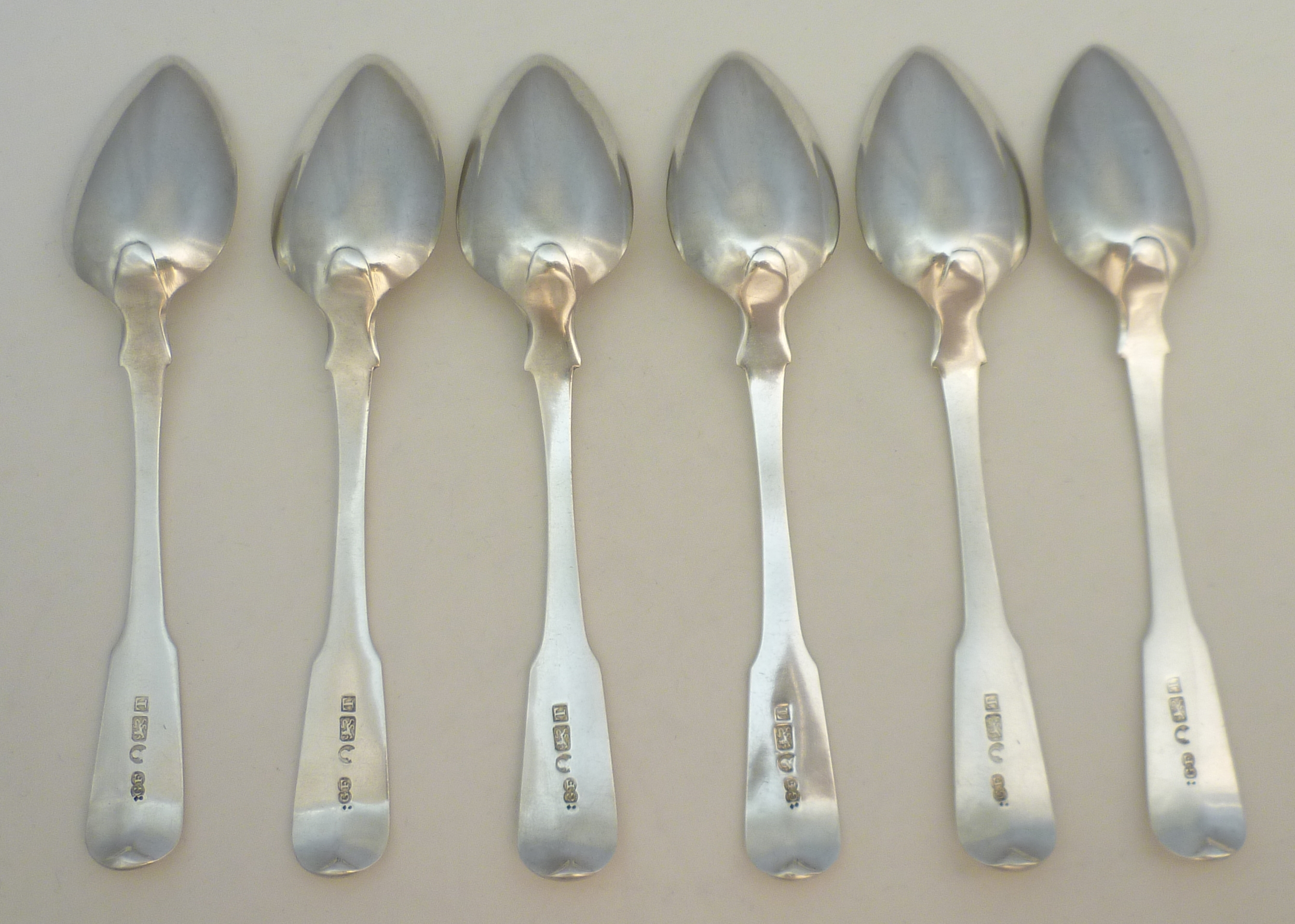 DESCRIPTION | Set of six English Georgian solid sterling silver Fiddle pattern teaspoons with the original frontal initials engraving and wonderful hallmarks. |