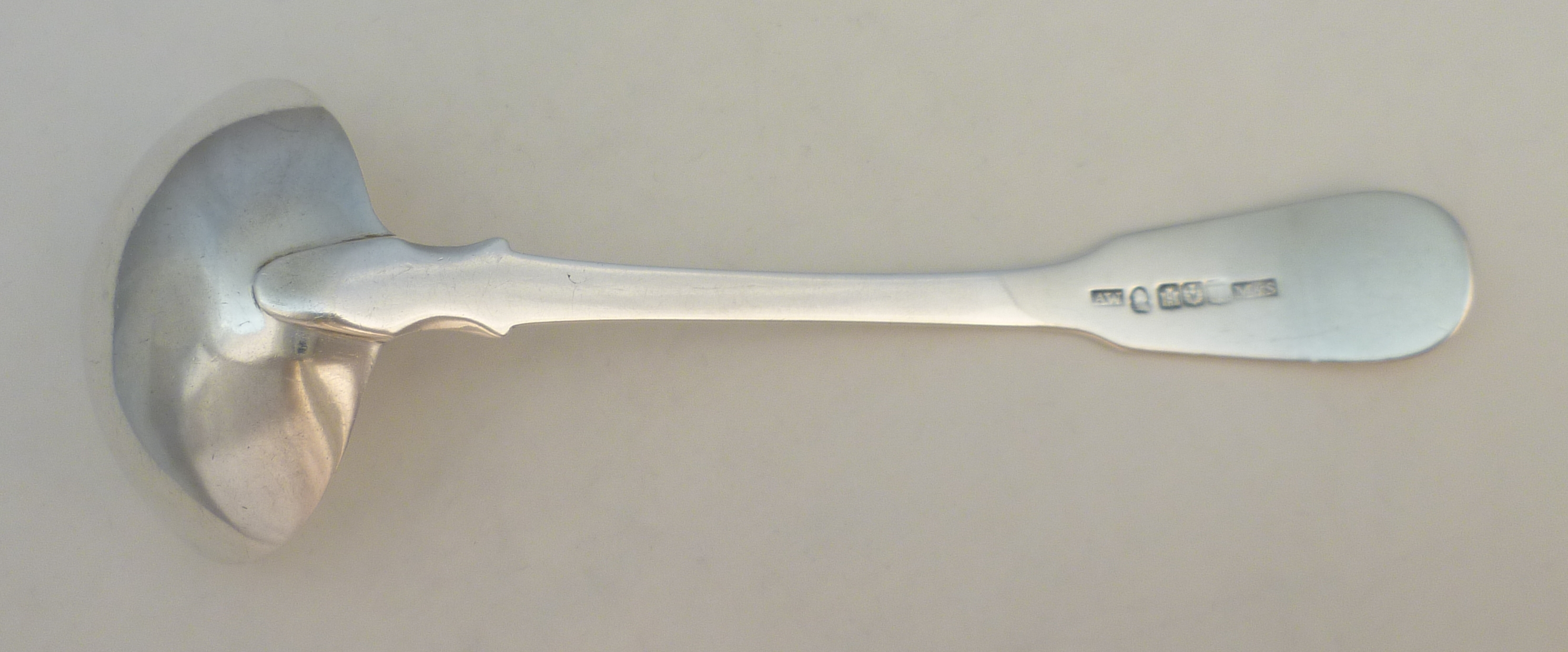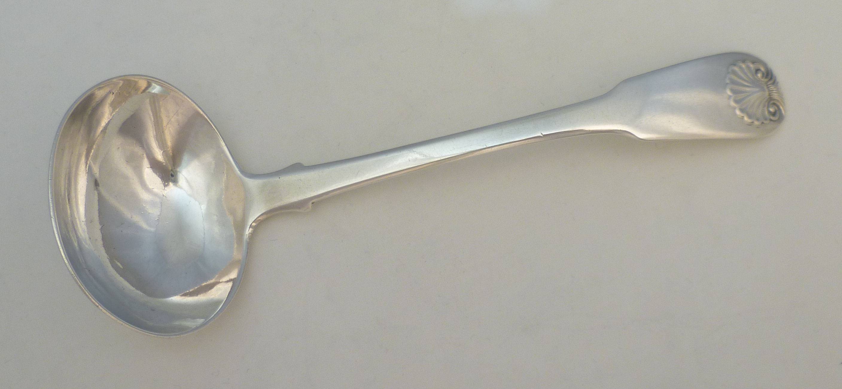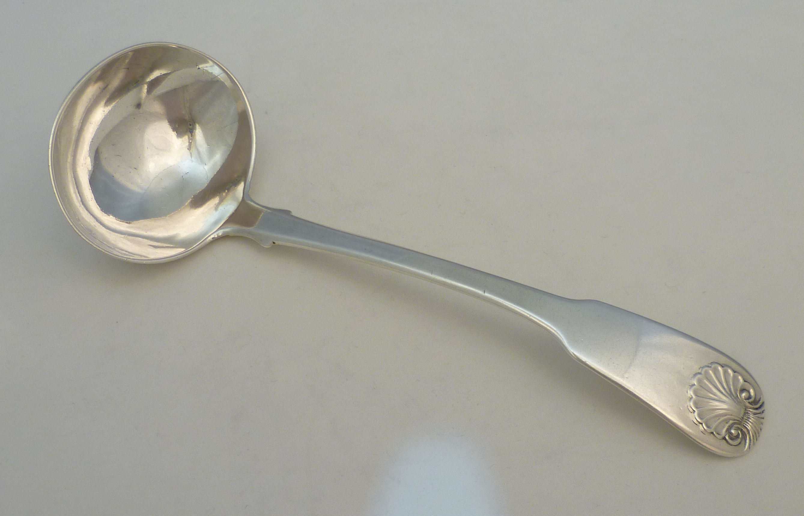 DESCRIPTION | Antique Scottish Georgian solid sterling silver Fiddle & Shell pattern sauce ladle with no engraving or erasure. |