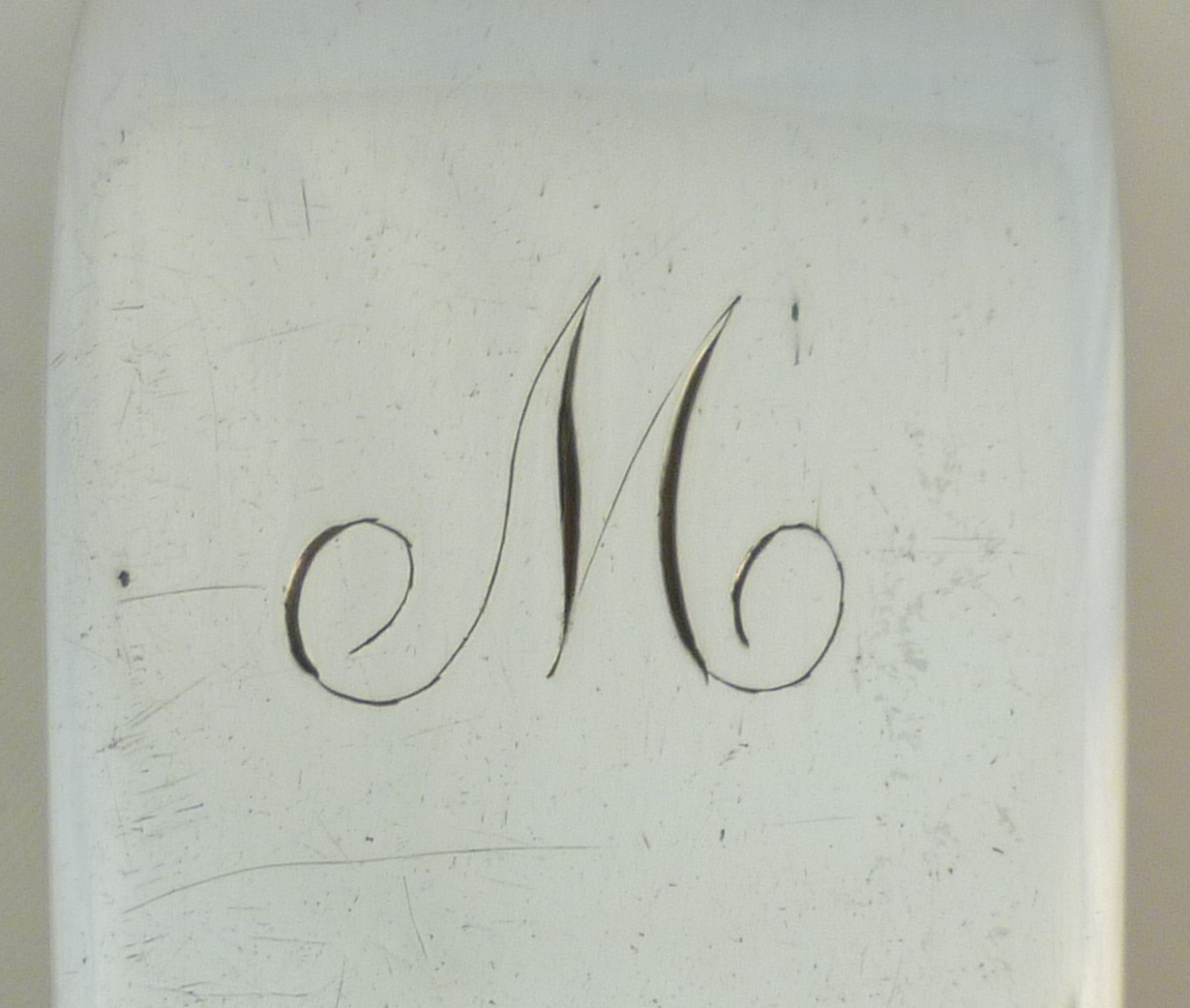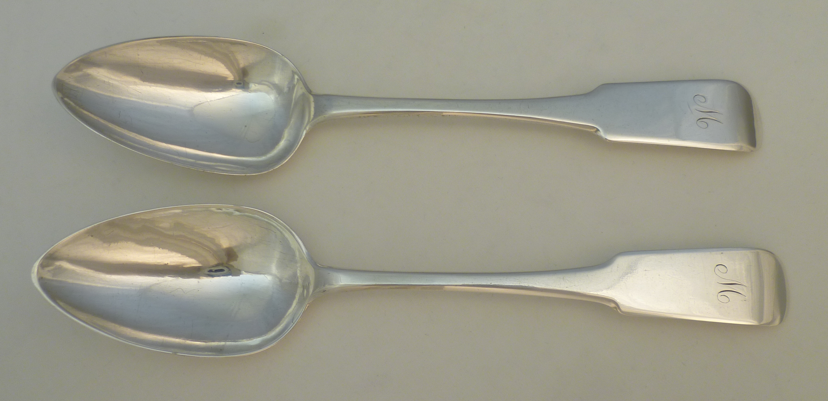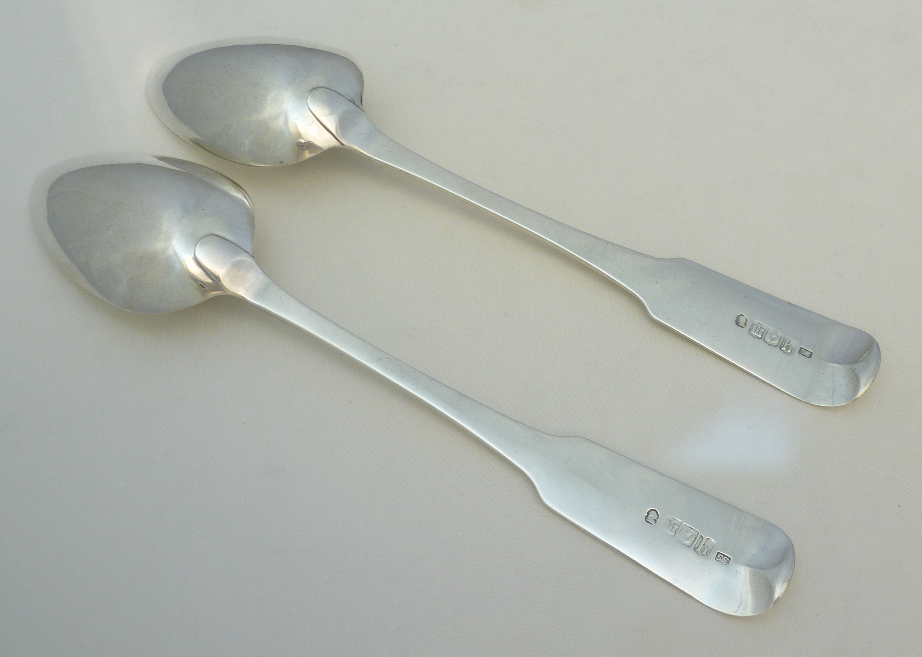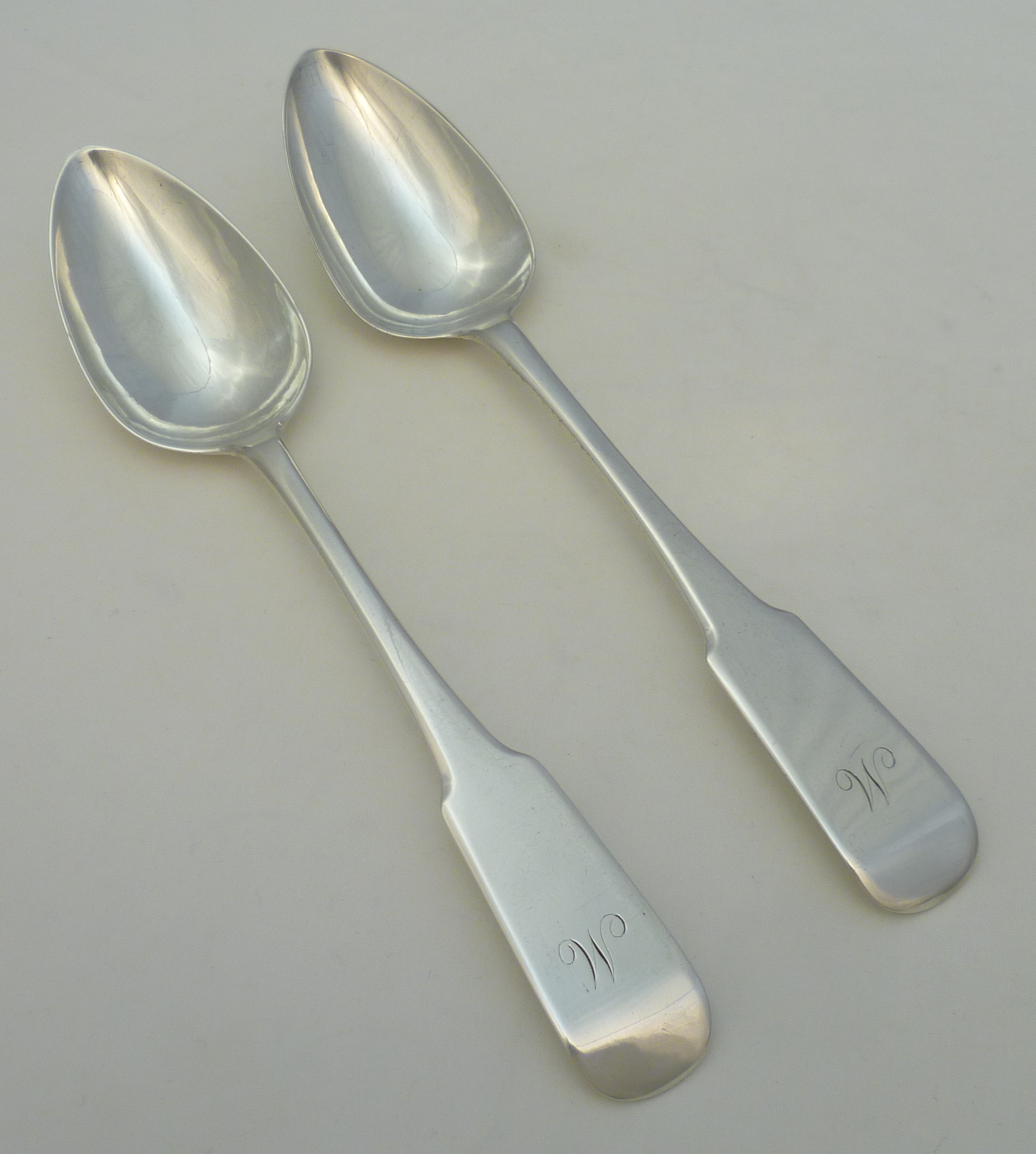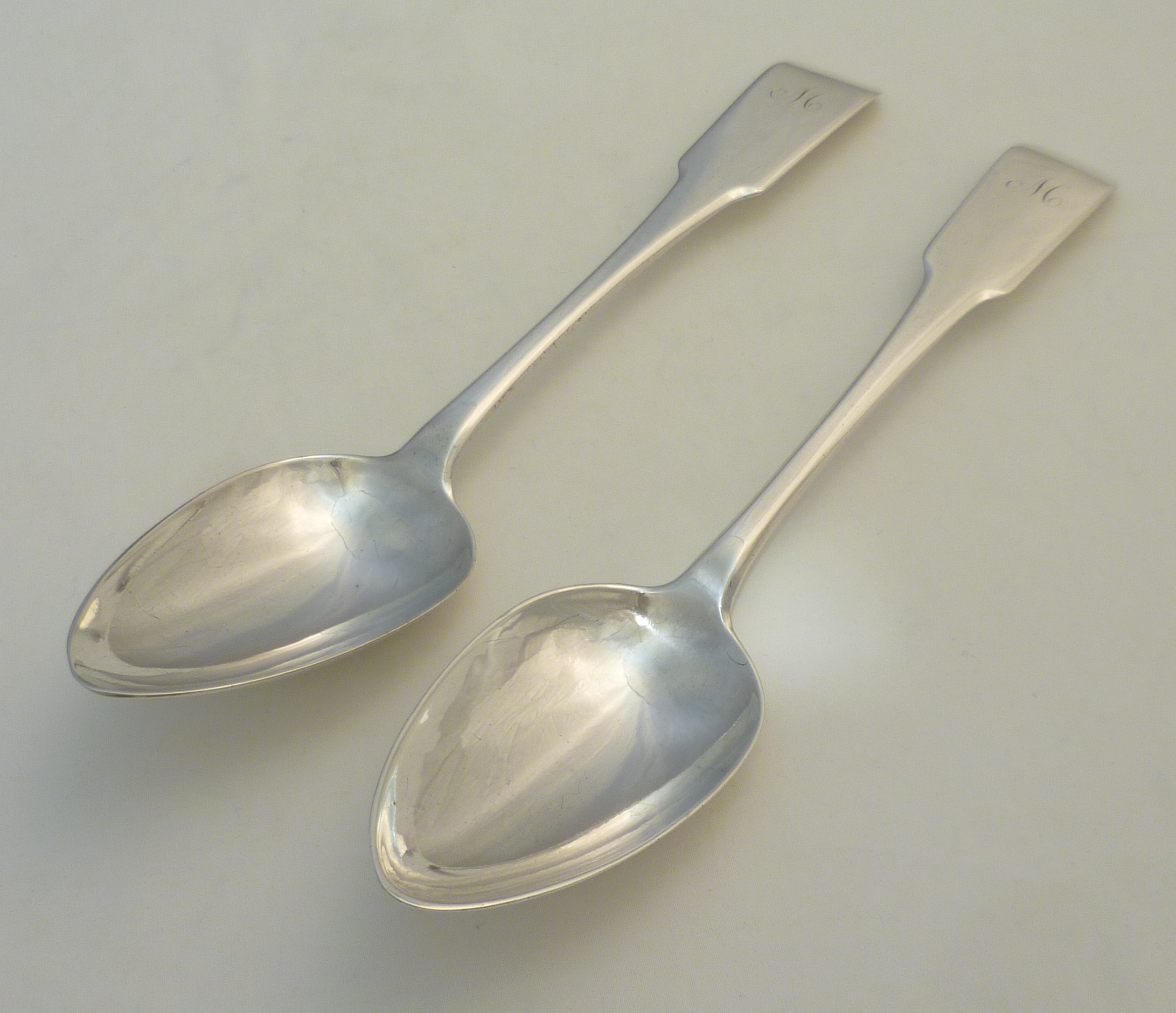 DESCRIPTION | Very good pair of antique Scottish Georgian solid sterling silver Fiddle pattern table spoons with frontal initial engraving. |