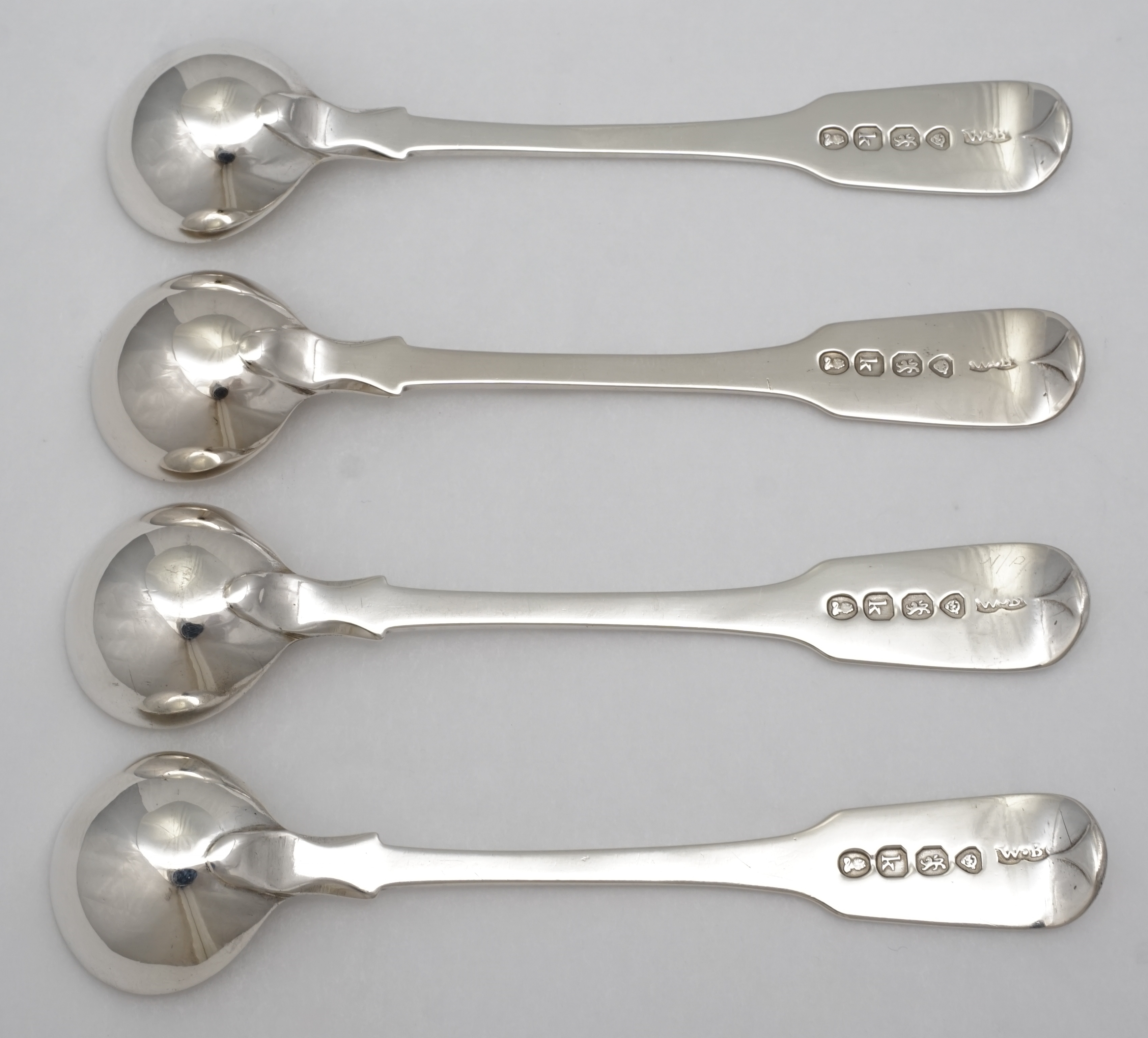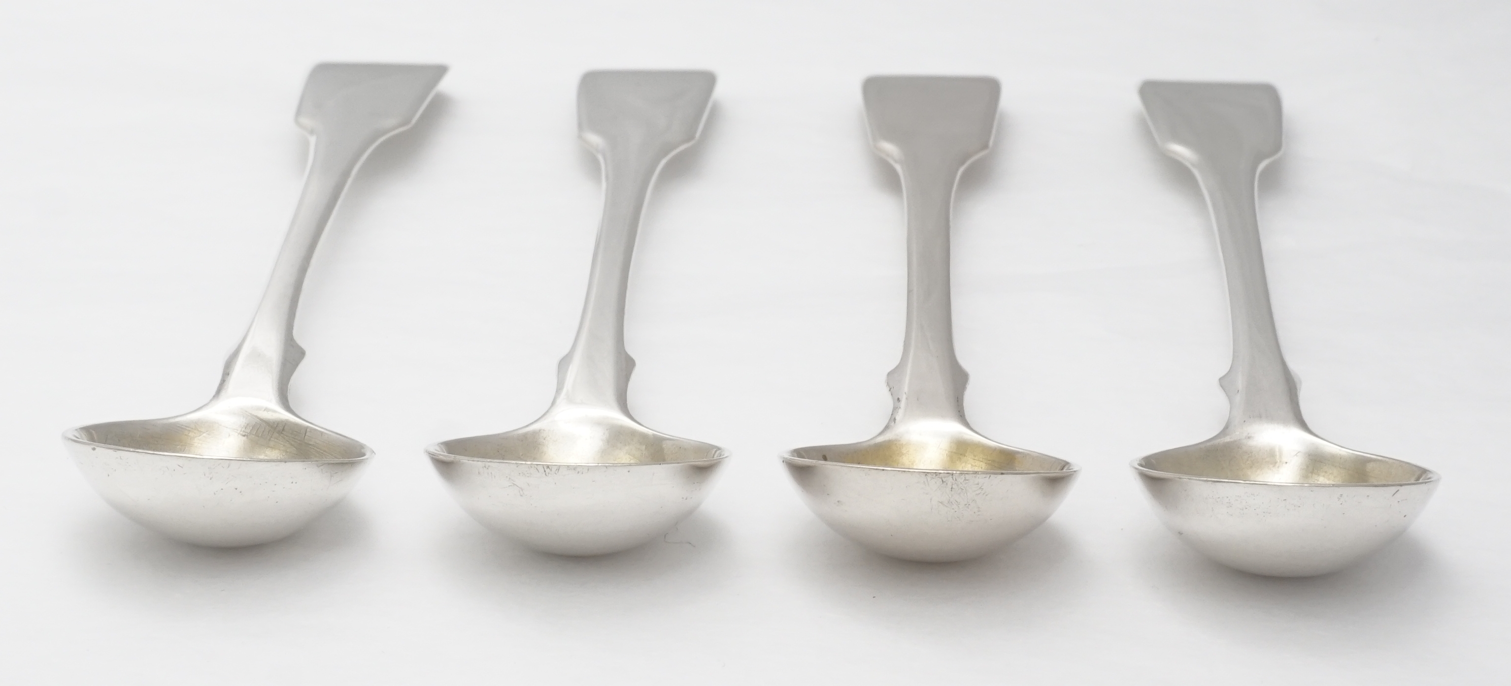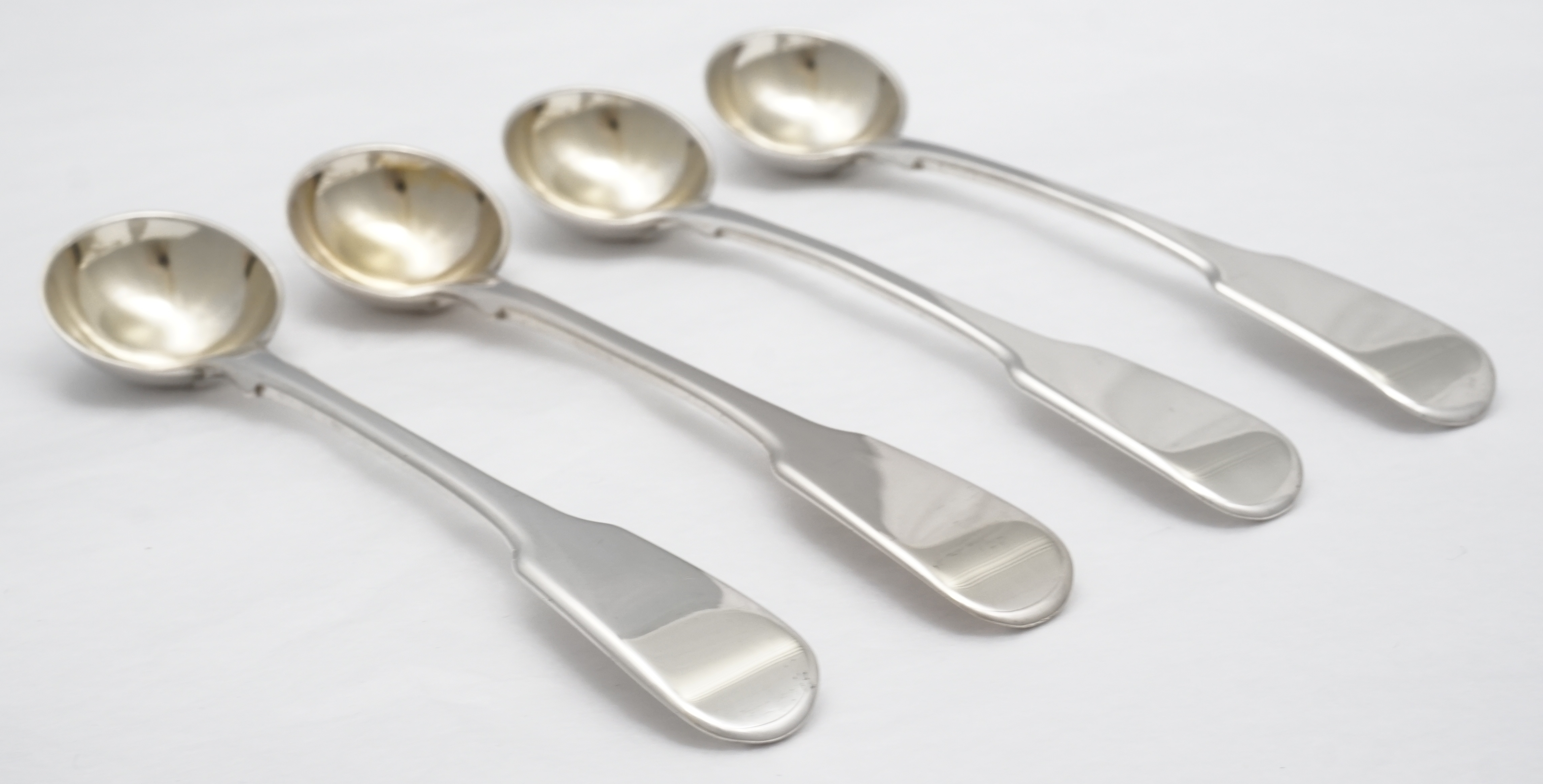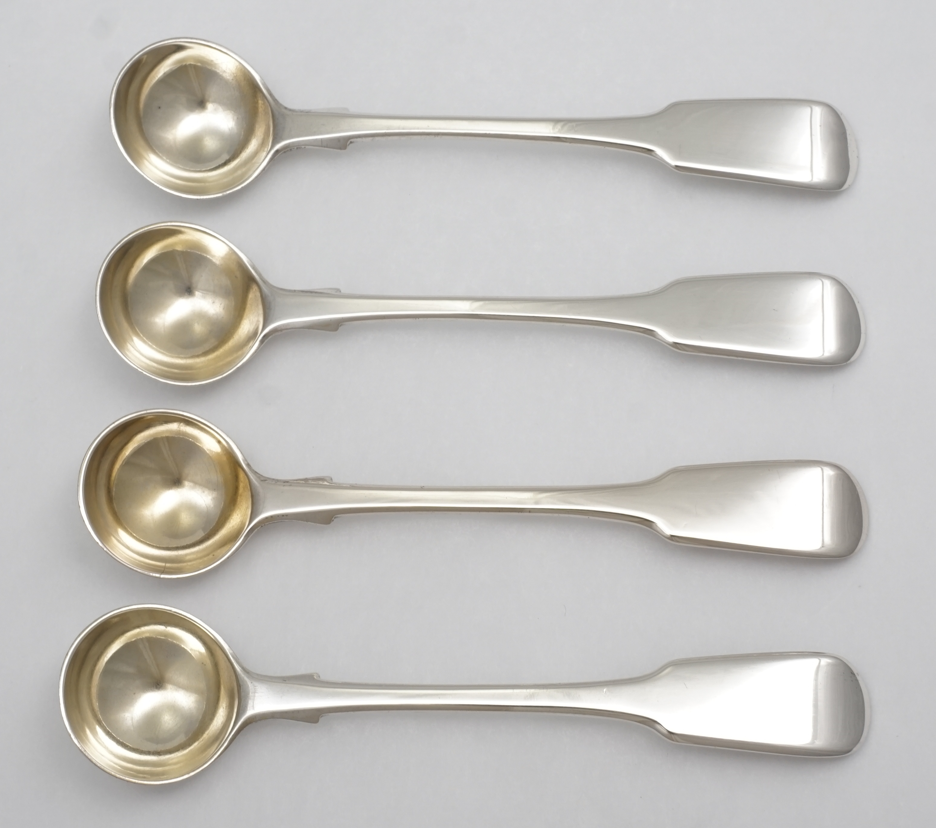 DESCRIPTION | Superb set of four antique English Georgian solid sterling silver Fiddle pattern salt spoons with gilded round bowls and no engraving or erasure. |