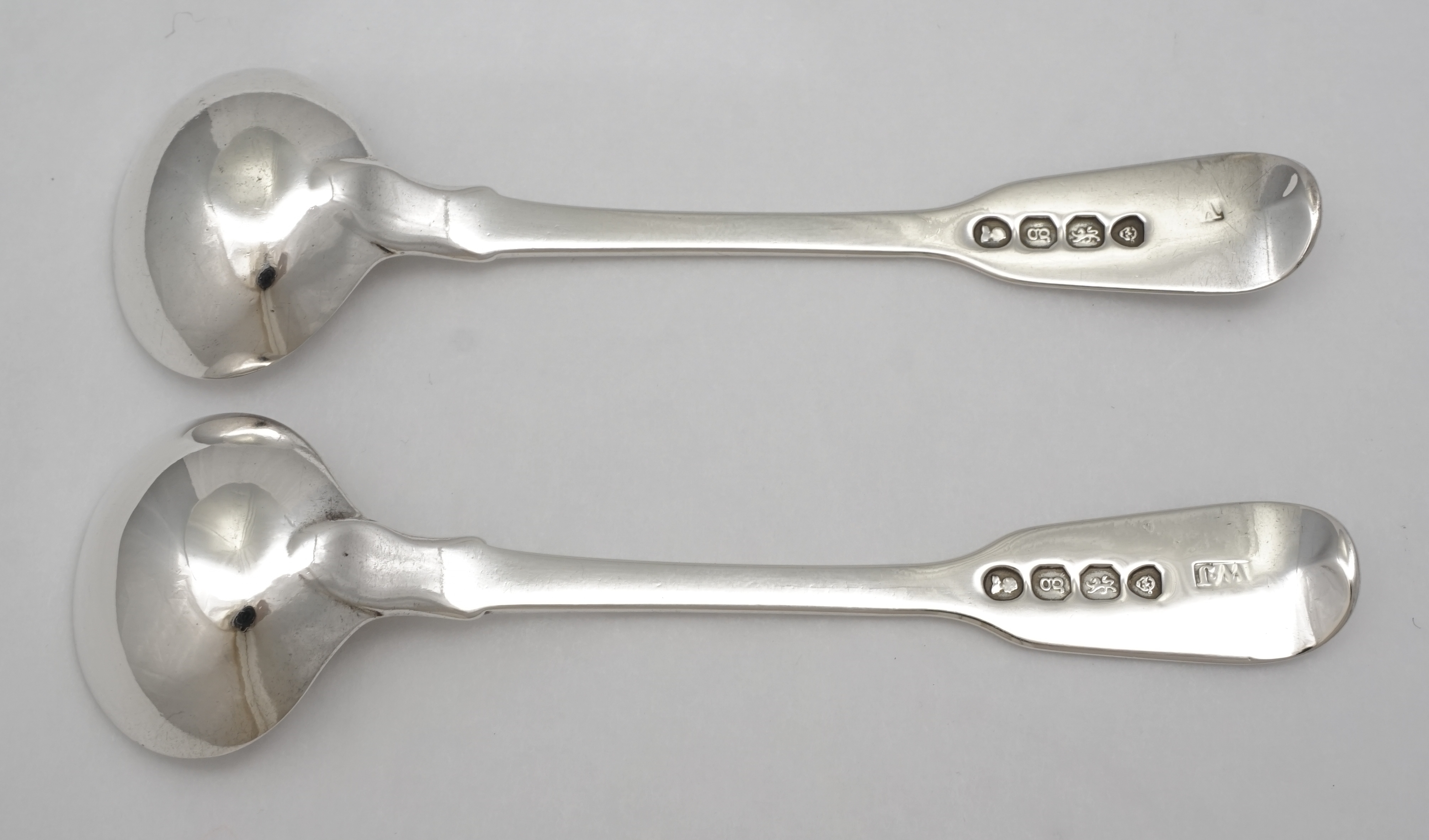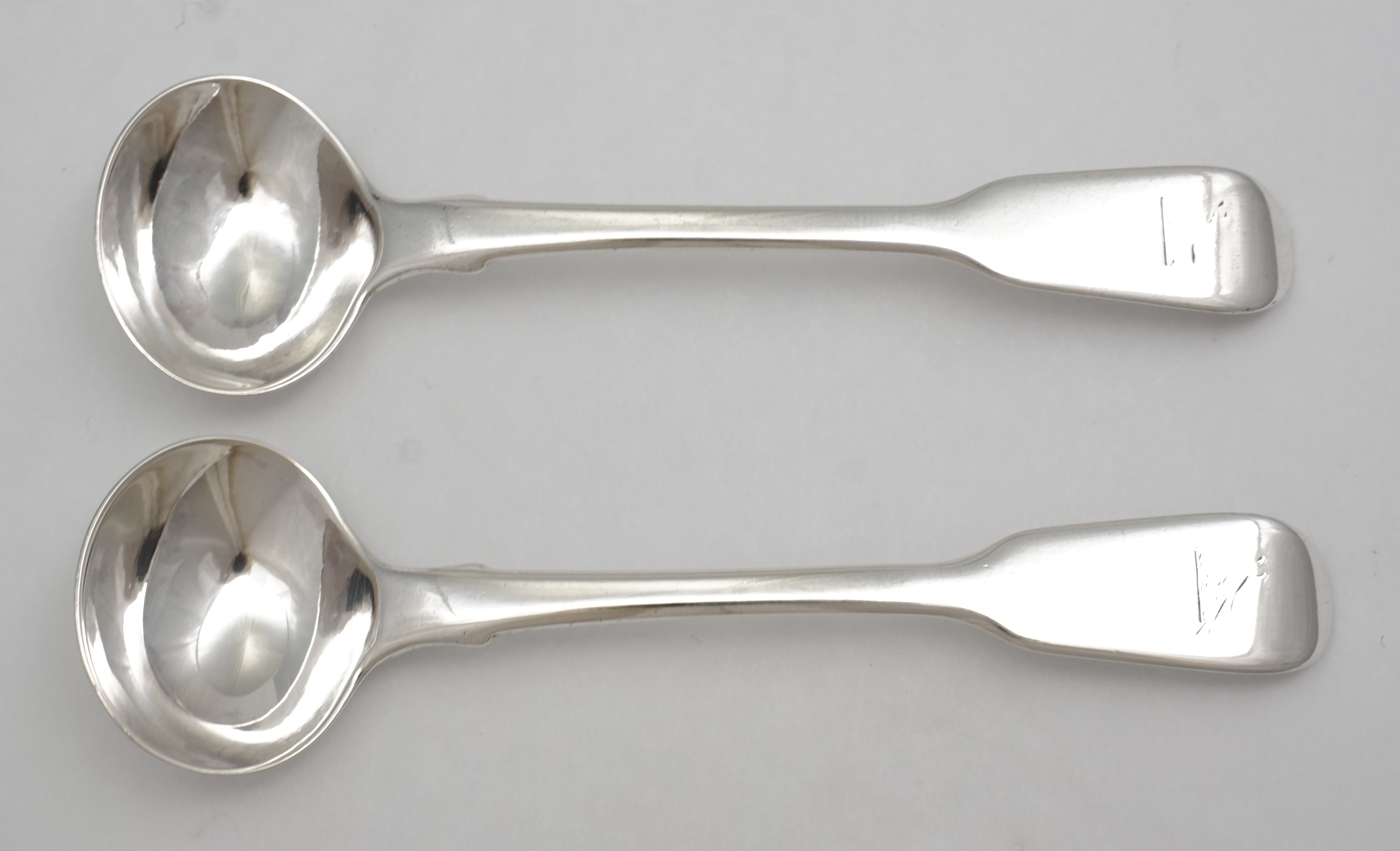DESCRIPTION | Pair of antique English Georgian solid sterling silver Fiddle pattern salt spoons with a frontal crest engraving. |