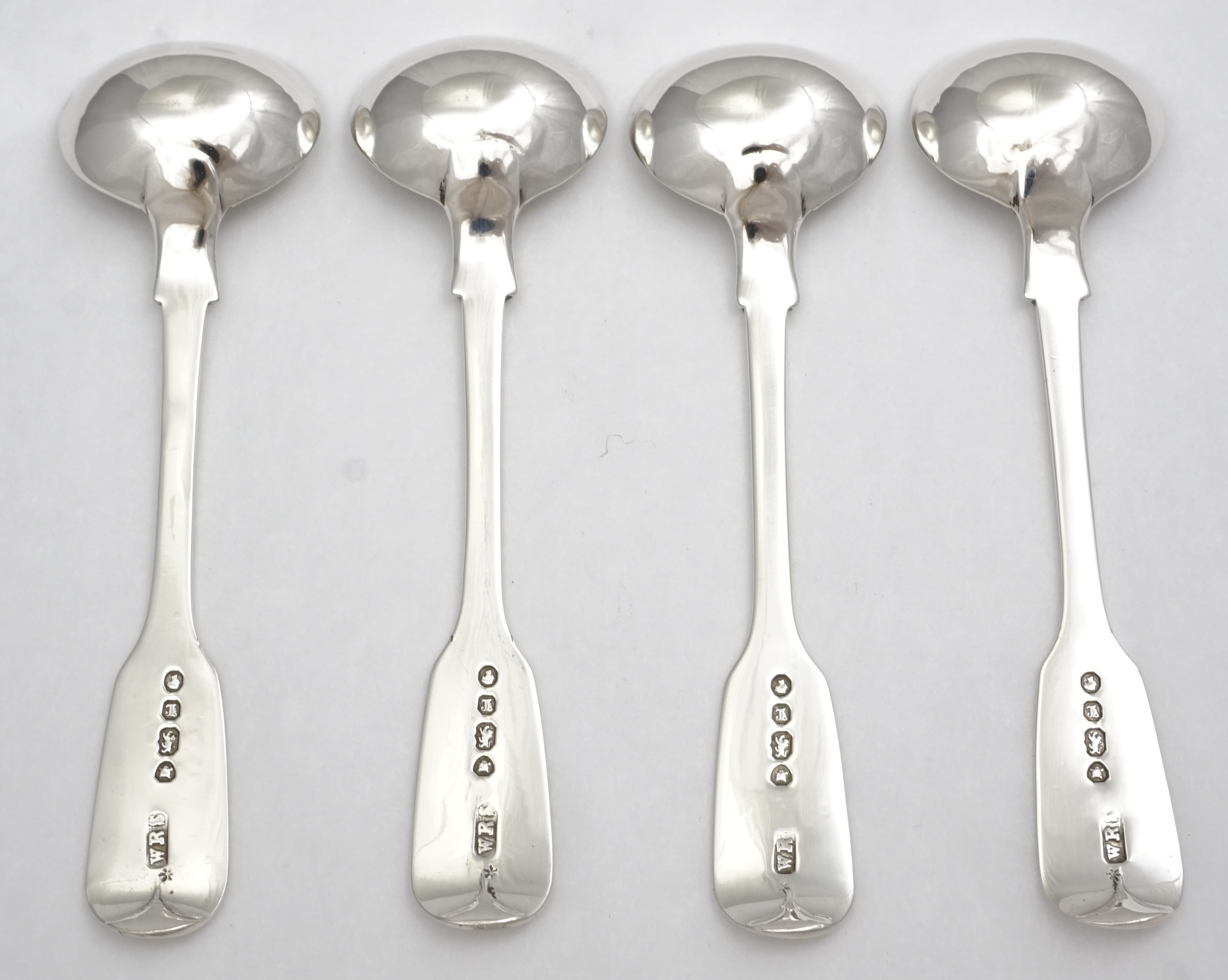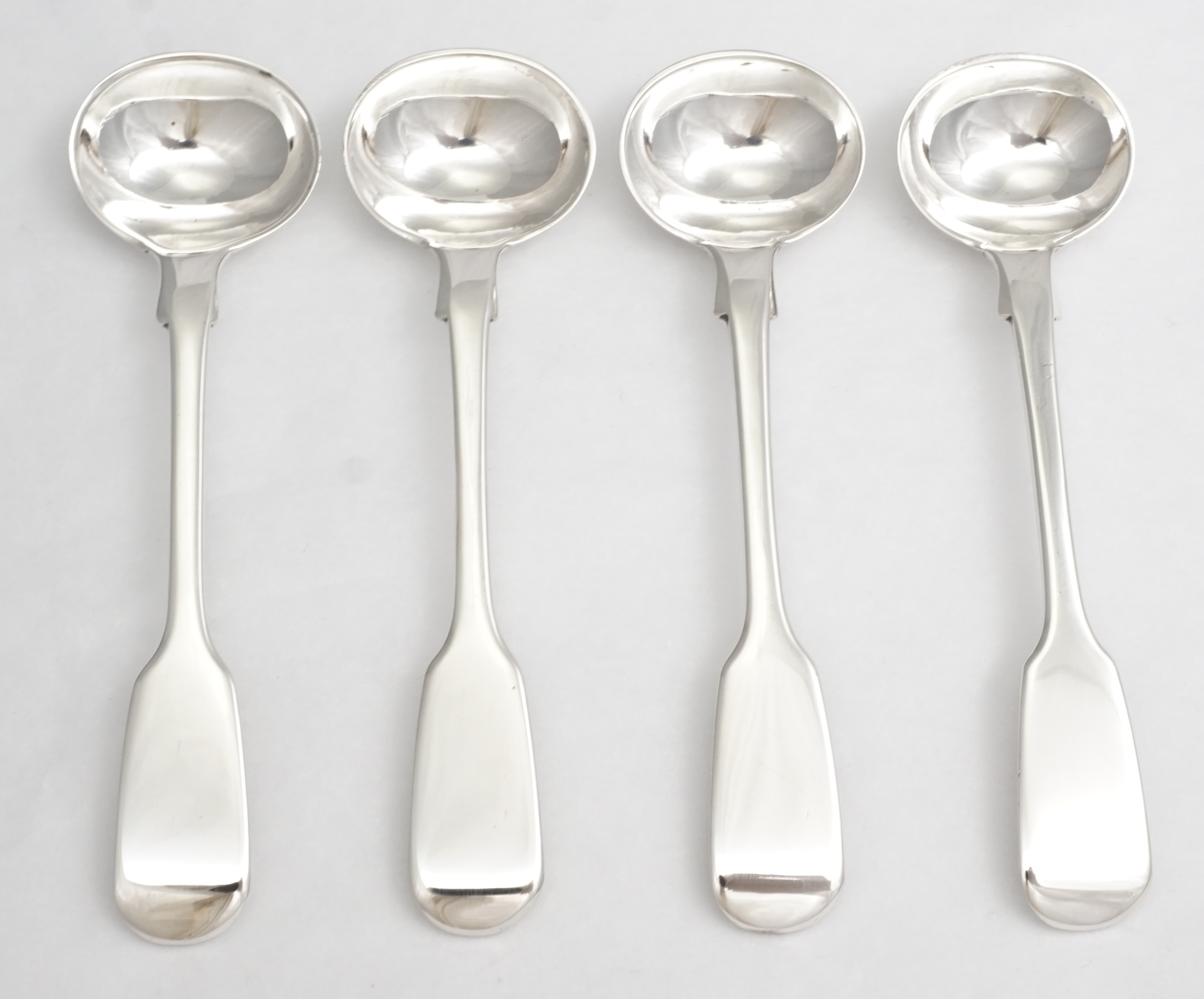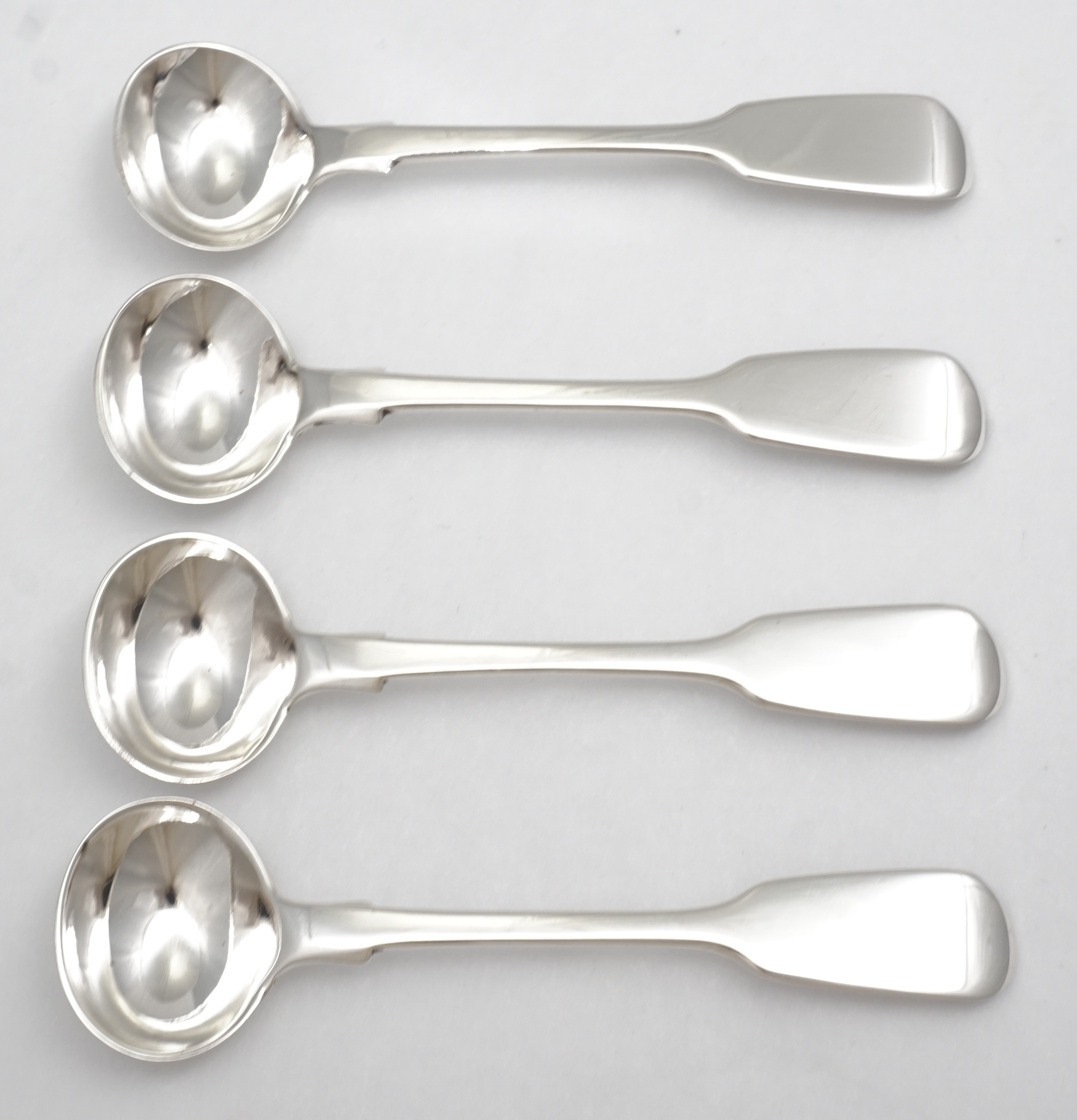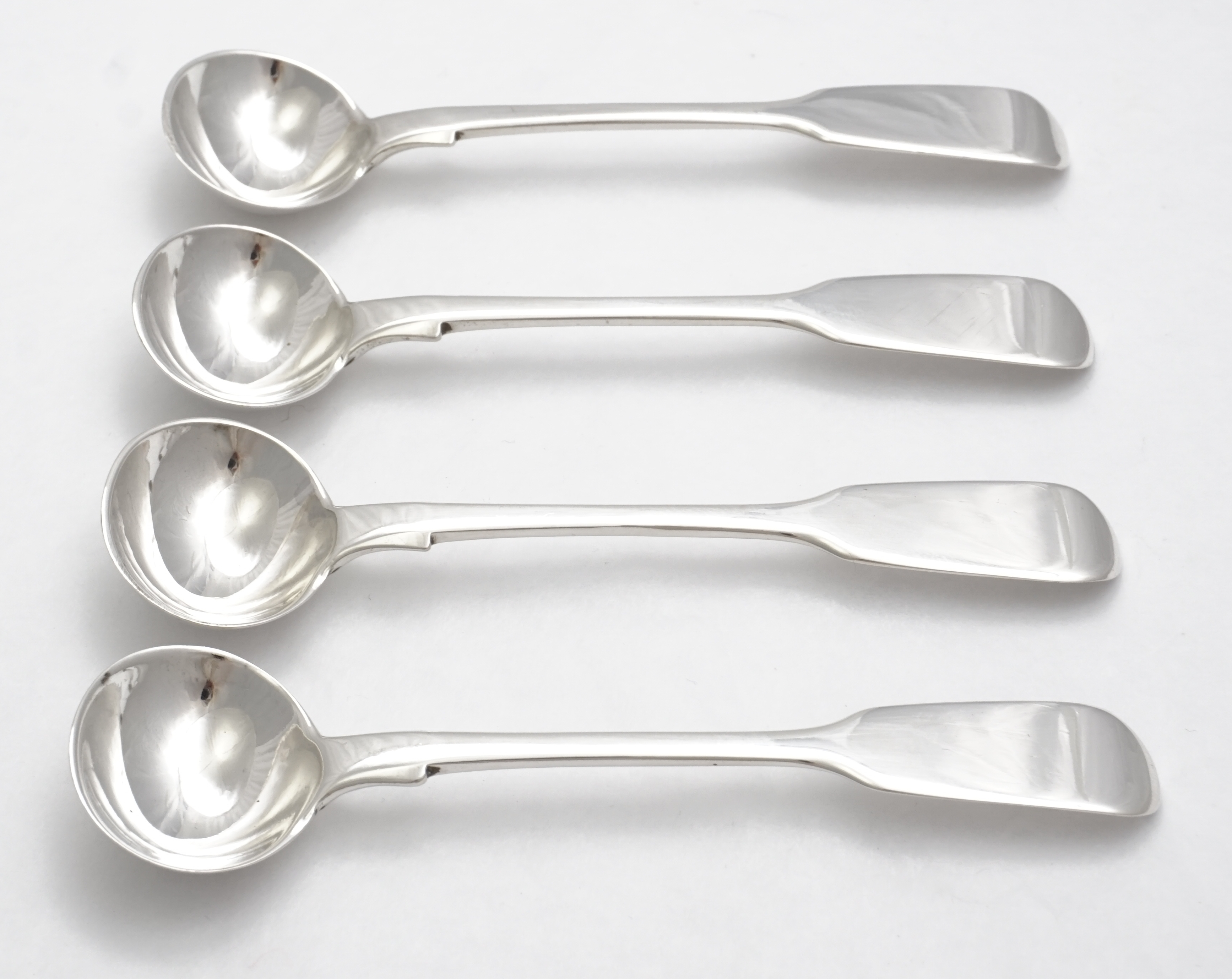 DESCRIPTION | Set of four 4" antique English Victorian solid sterling silver Fiddle pattern salt spoons with no engraving. |