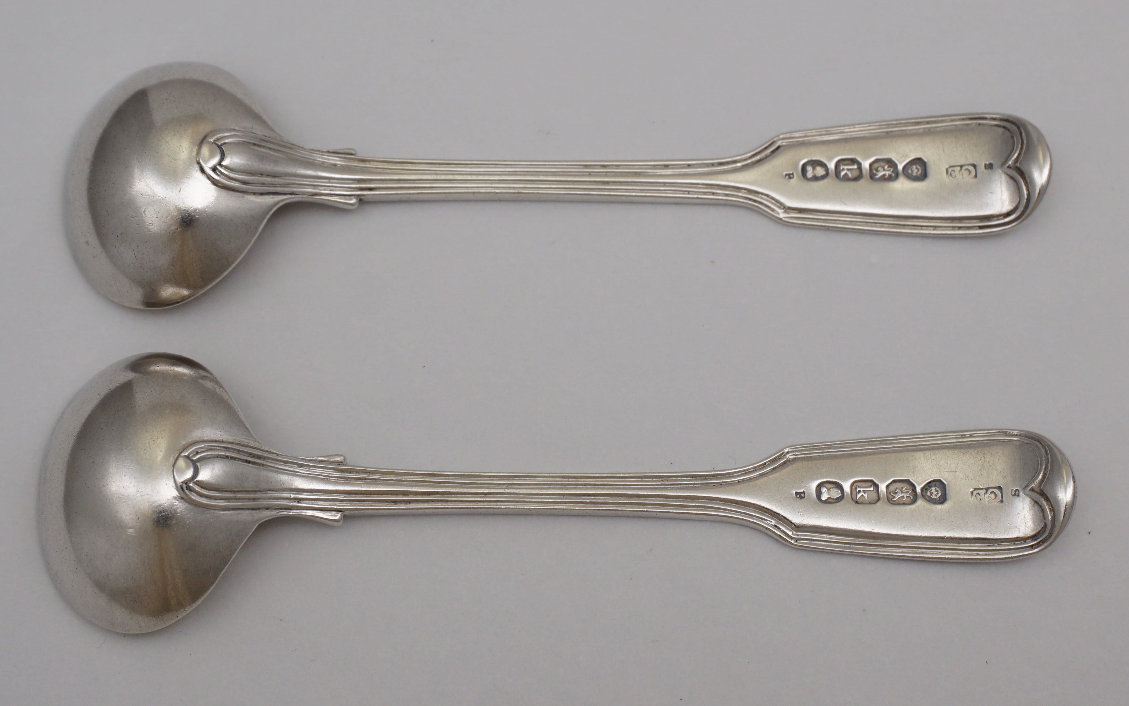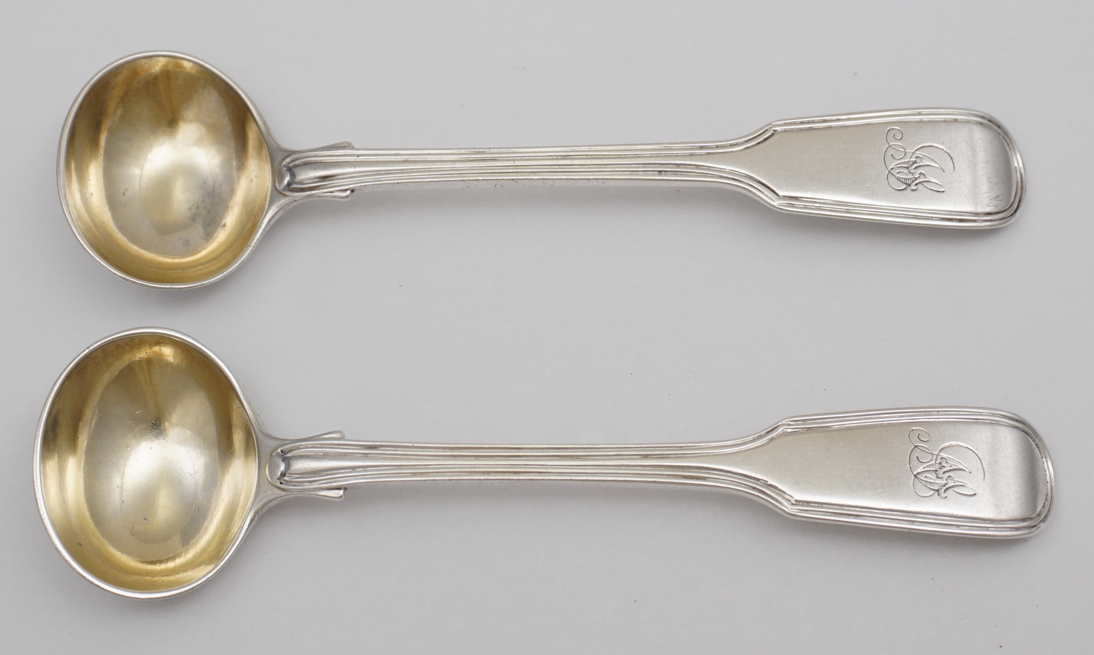 DESCRIPTION | Very good pair of antique English Georgian solid sterling silver double struck Fiddle & Thread pattern salt spoons with gilded bowls, clear hallmarks and frontal monogram engraving. |