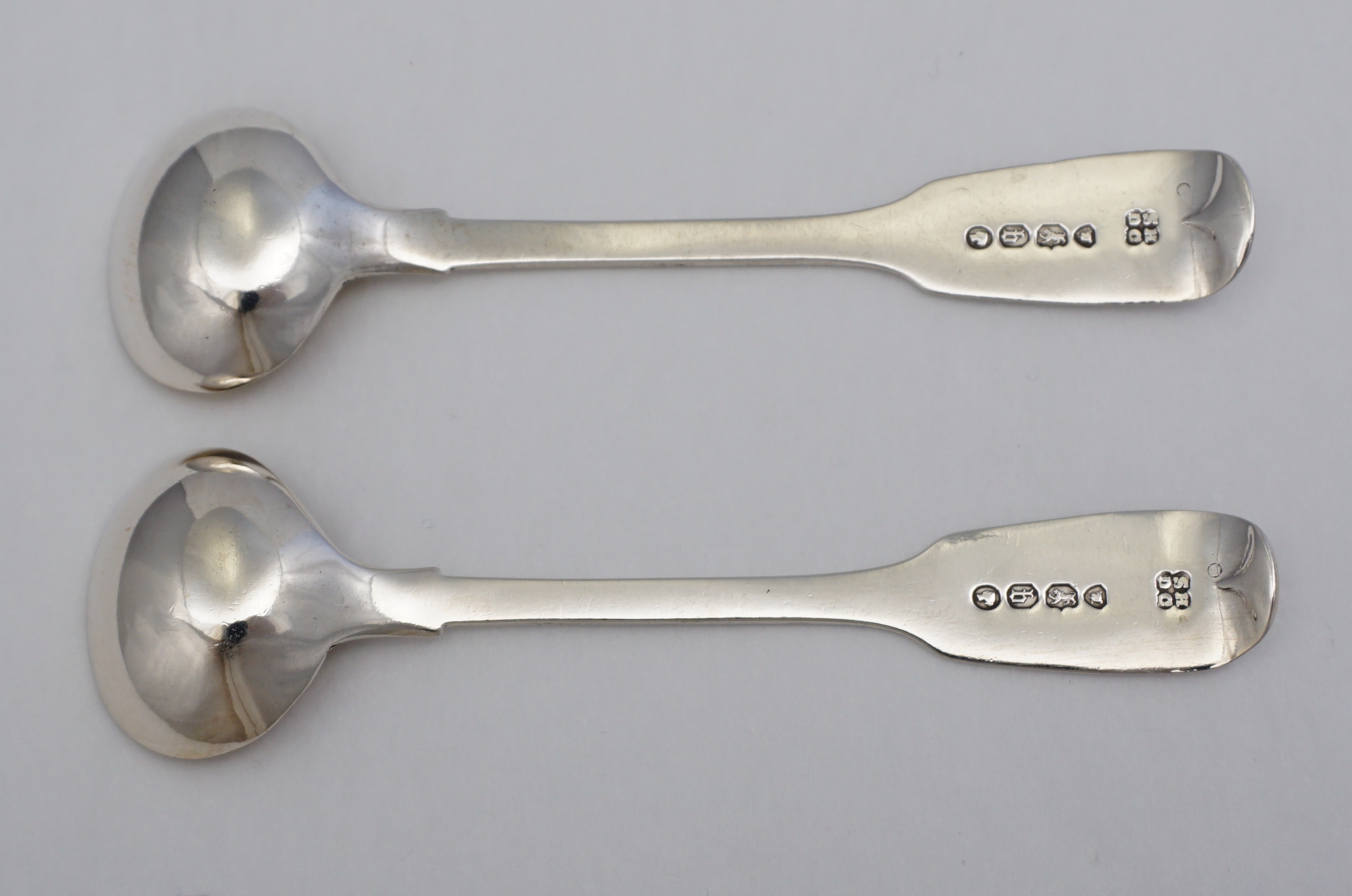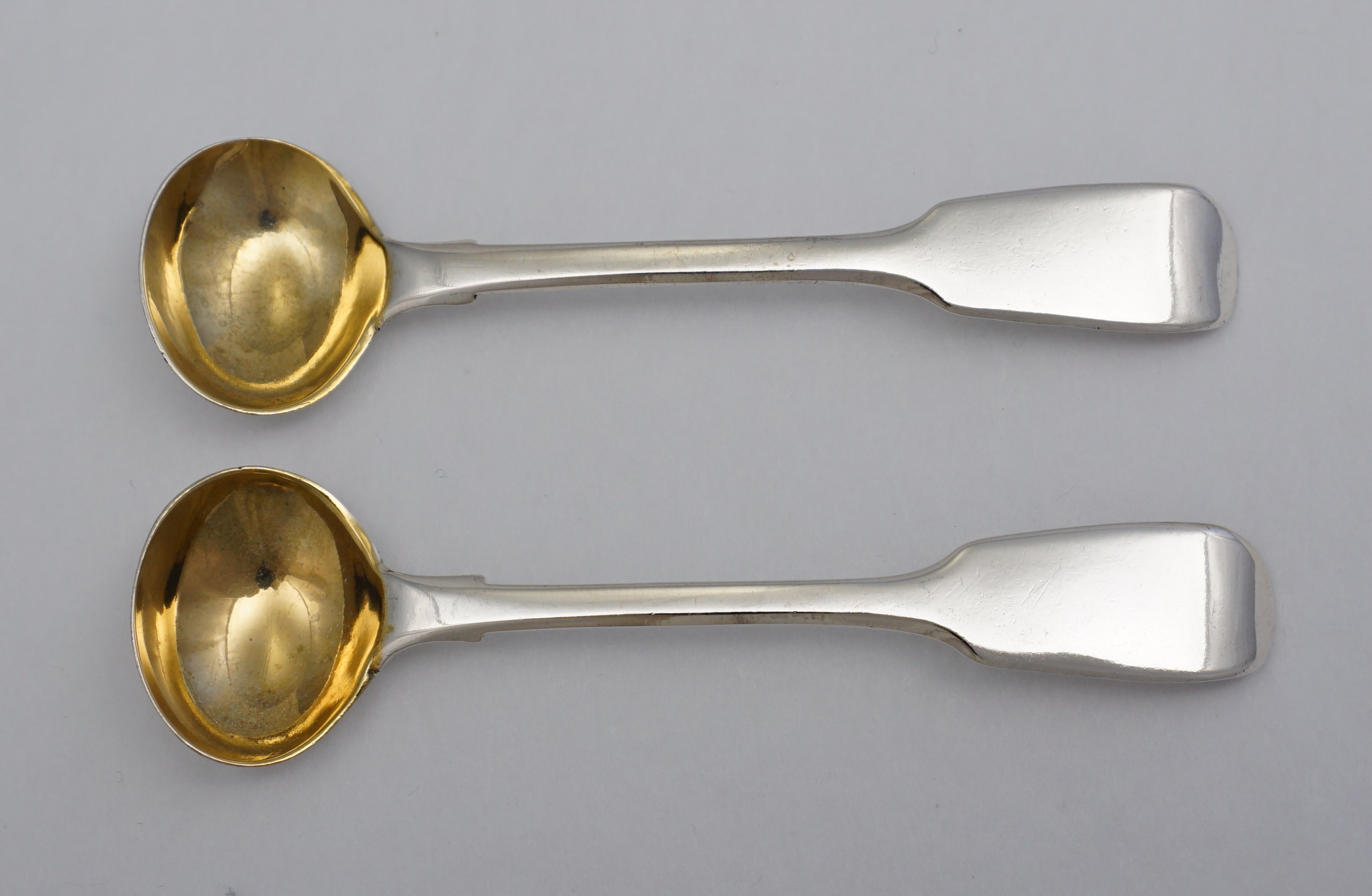 DESCRIPTION | Good pair of antique English Victorian solid sterling silver Fiddle pattern salt spoons with gilded bowls. |
