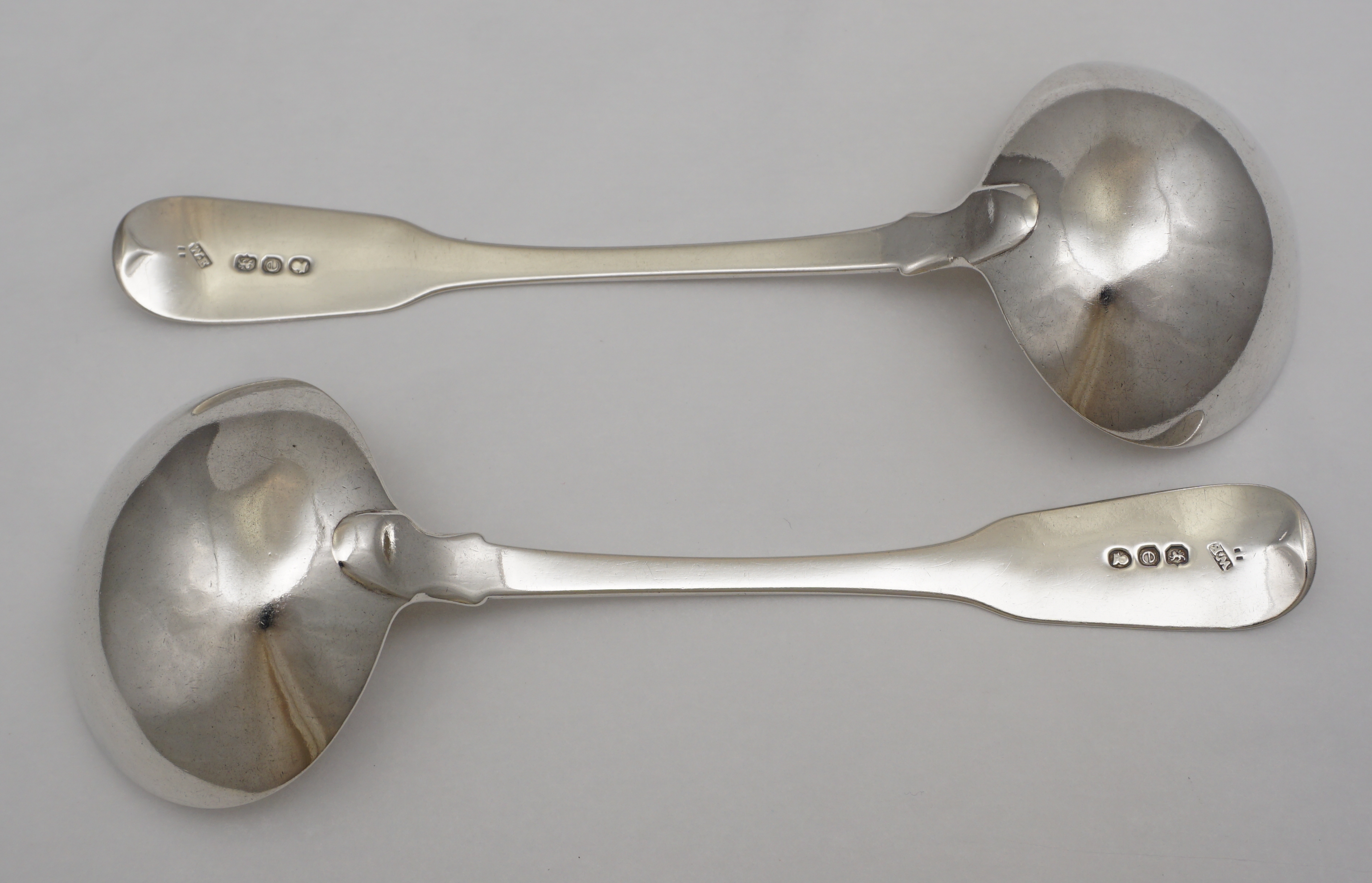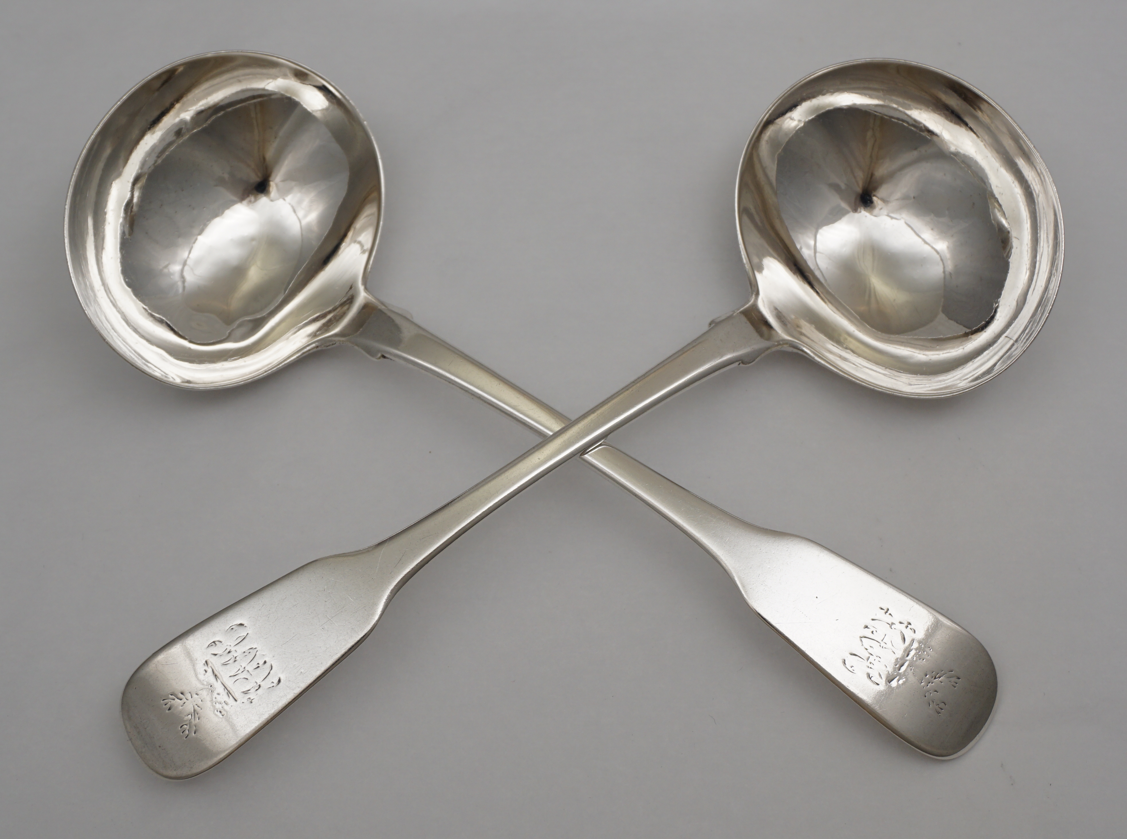 DESCRIPTION | Pair of antique English Georgian solid sterling silver Fiddle pattern sauce ladles with a frontal monogram below crest engraving. |