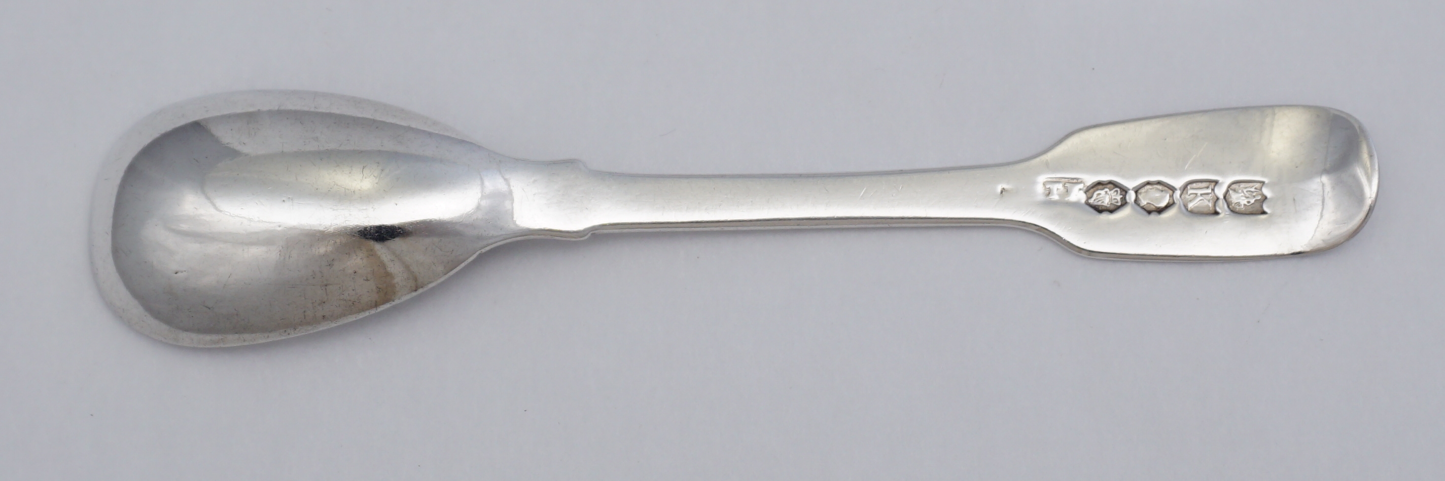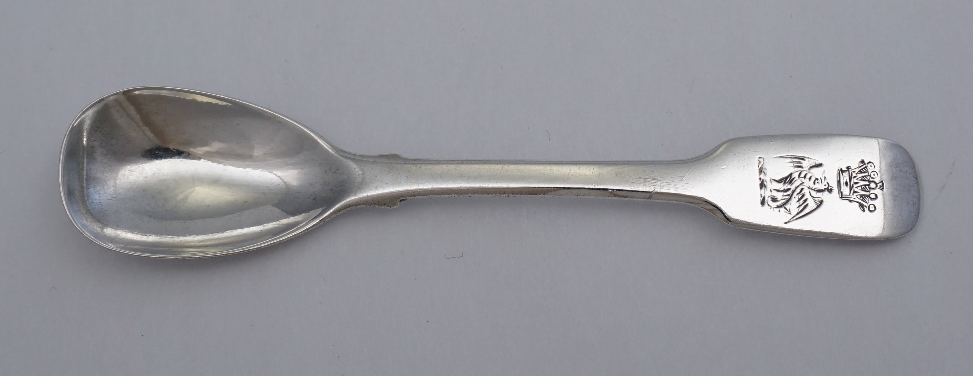 DESCRIPTION | Antique Irish William IV solid sterling silver Fiddle pattern mustard ladle with a good frontal crest engraving below an Earl's coronet. |
