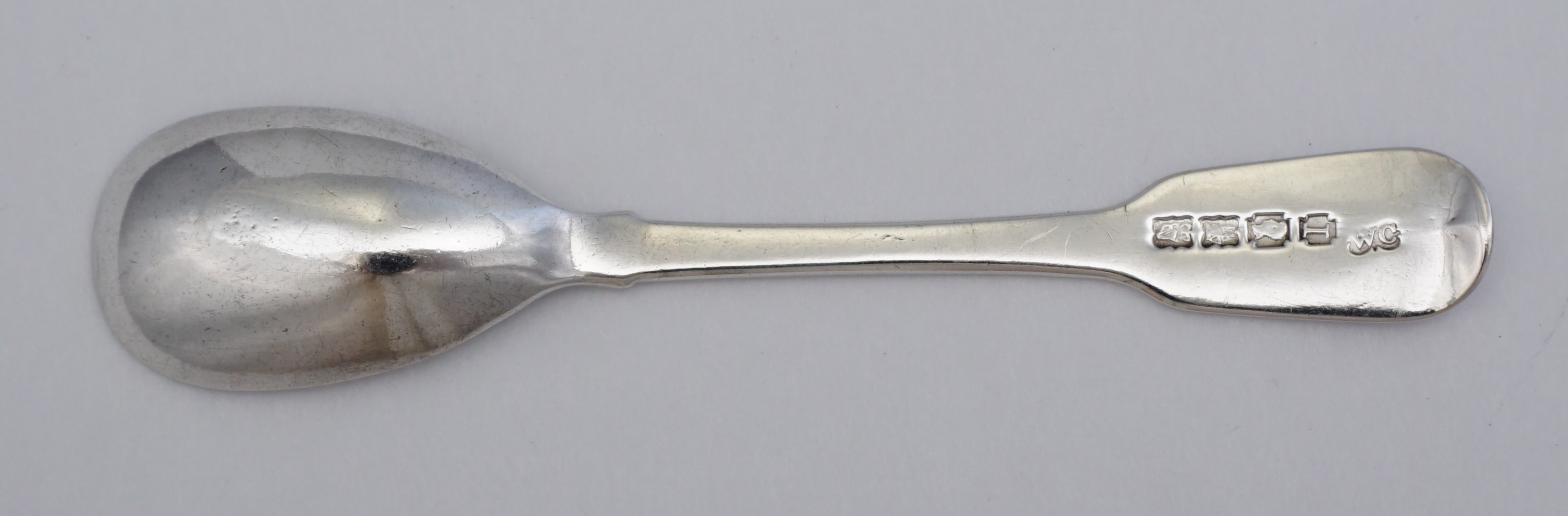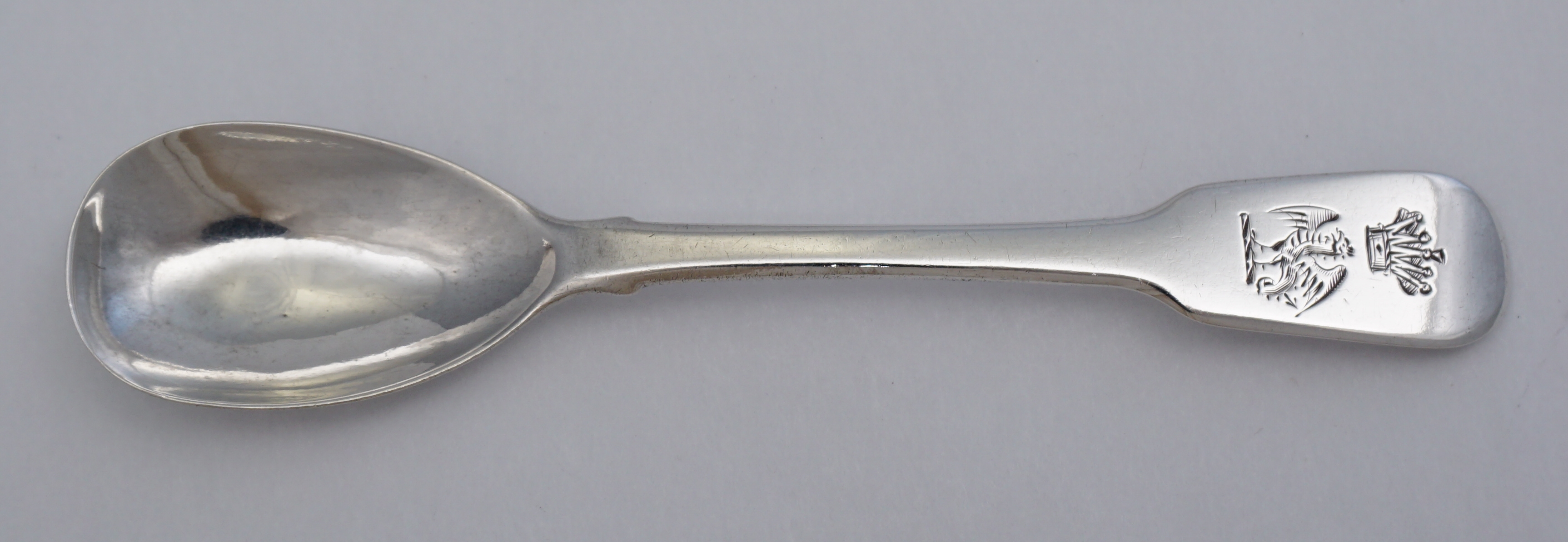 DESCRIPTION | Antique Irish George IV solid sterling silver Fiddle pattern mustard ladle with a good frontal crest engraving below an Earl's coronet. |