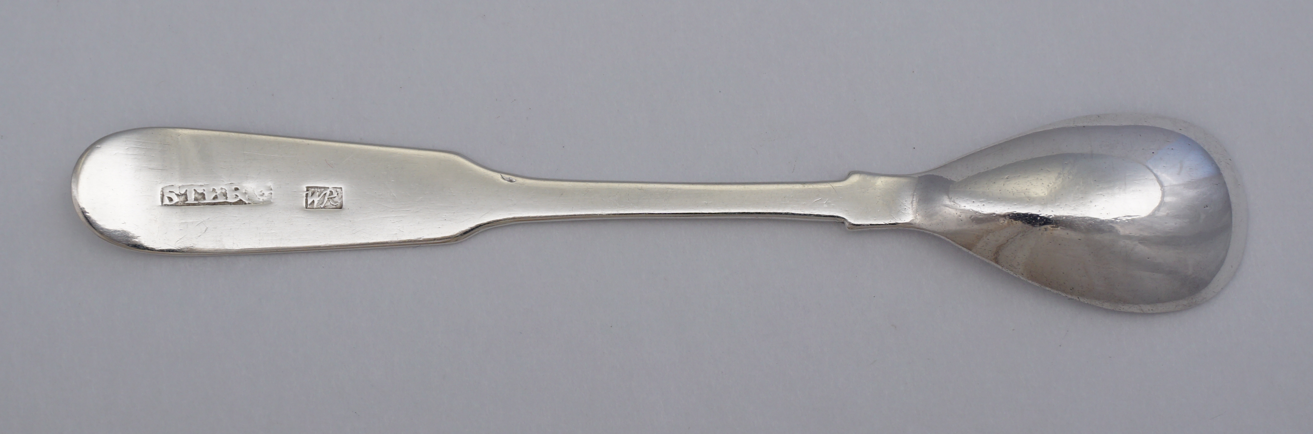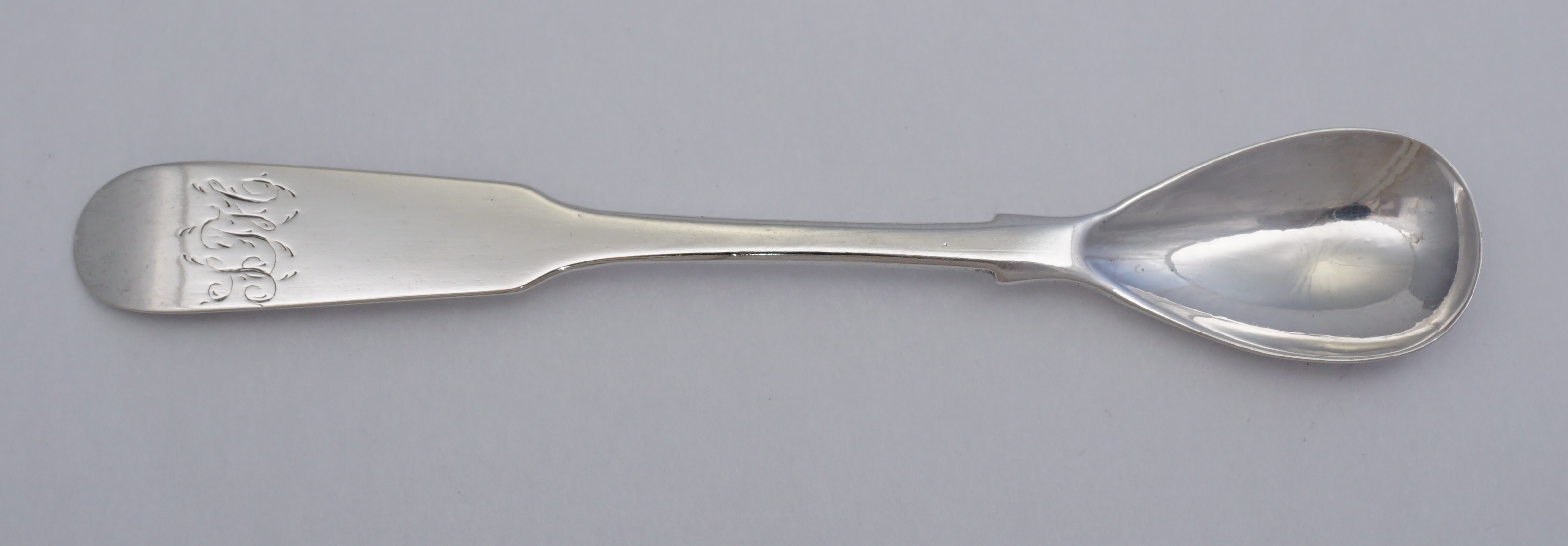 DESCRIPTION | Scarce antique Provincial Irish Georgian solid sterling silver Fiddle pattern mustard ladle with a frontal monogram engraving. Note the unusually long terminal, a feature found mostly on pre-1800 provincial Irish silver flatware. These would be very early for London Fiddle pattern but Fiddle came from France and the Irish were early adopters with Dublin Fiddle noted from 1758. For geographical reasons much Cork silver was made from imported Spanish dollars. |