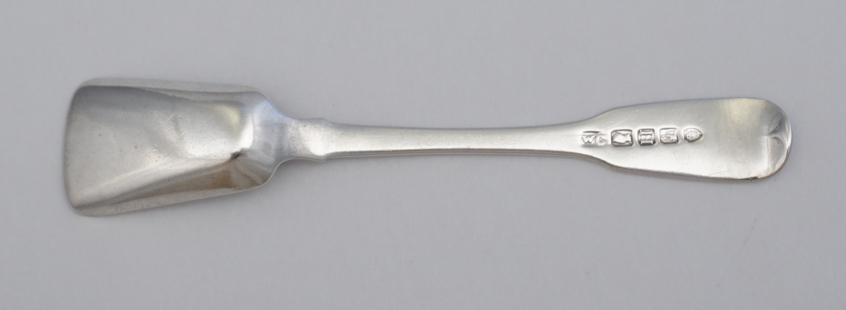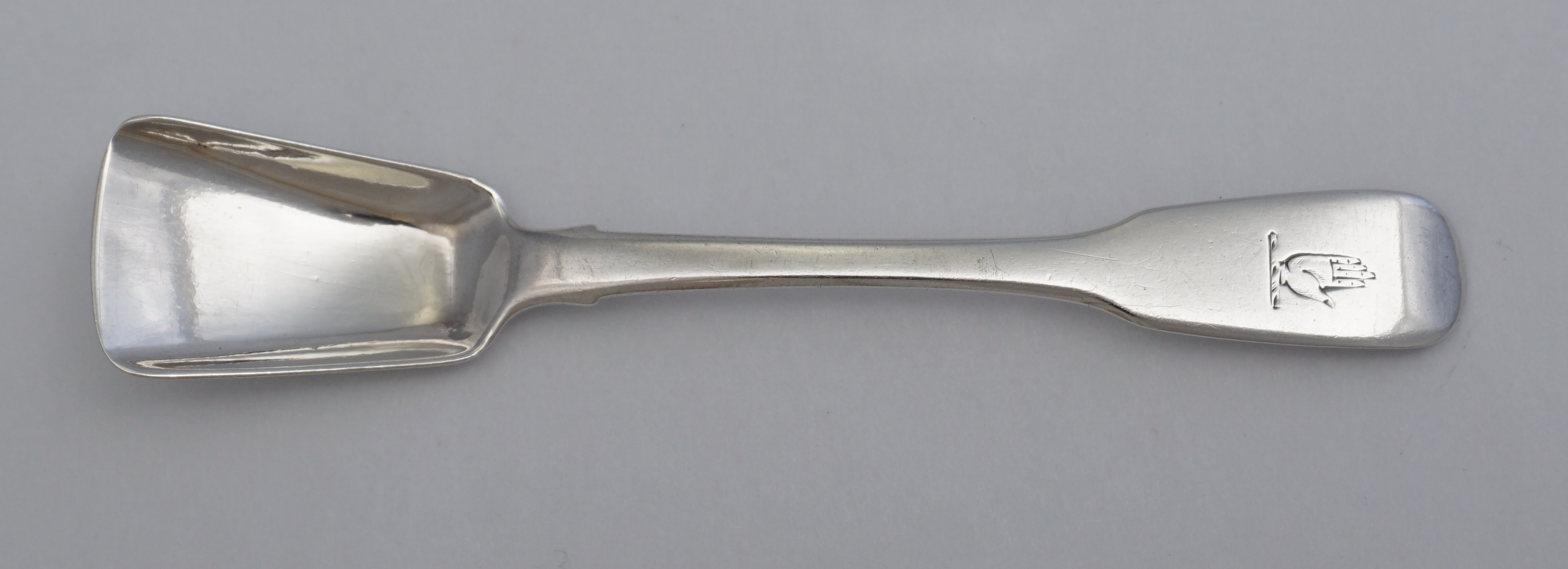 DESCRIPTION | Antique Irish Georgian solid sterling silver Fiddle pattern salt shovel with a frontal right hand crest engraving. |