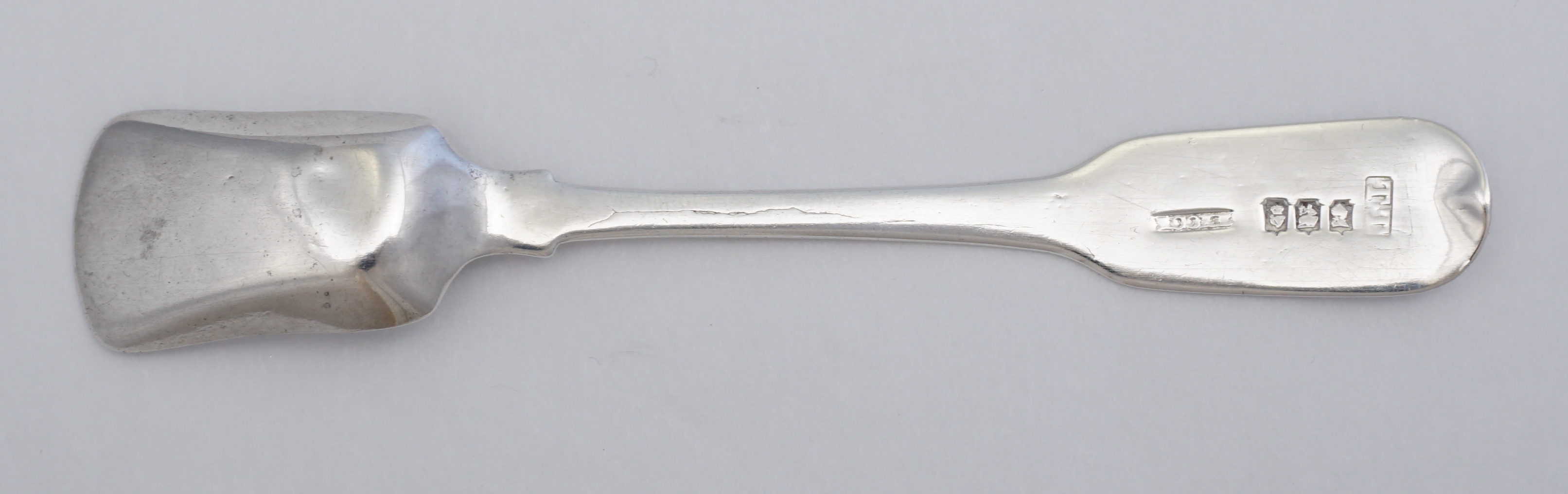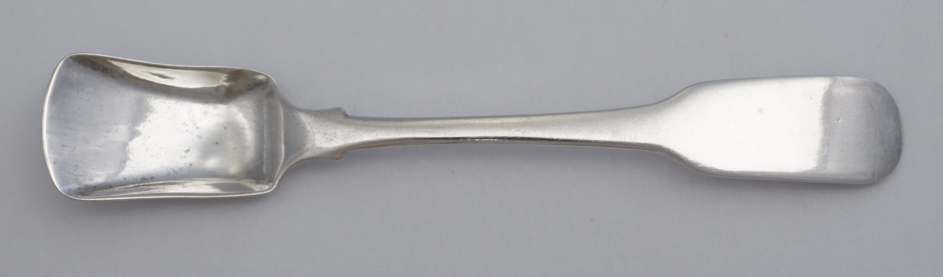 DESCRIPTION | Antique Irish Georgian solid sterling silver Fiddle pattern salt shovel. |