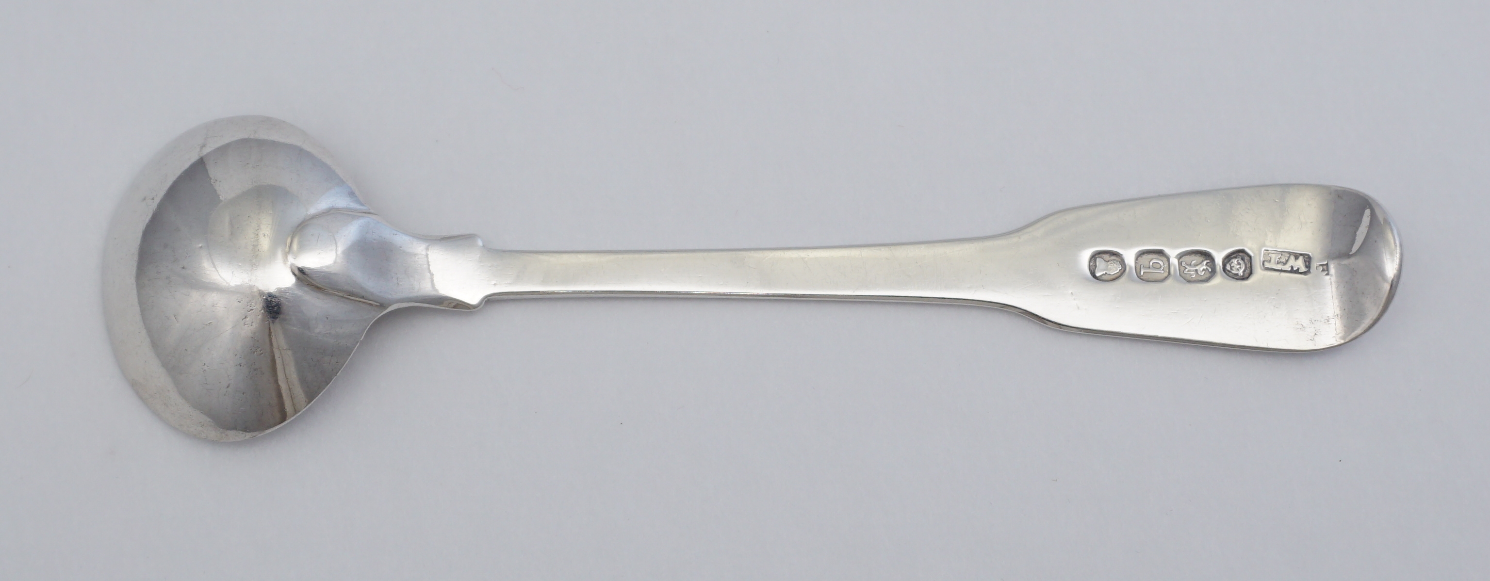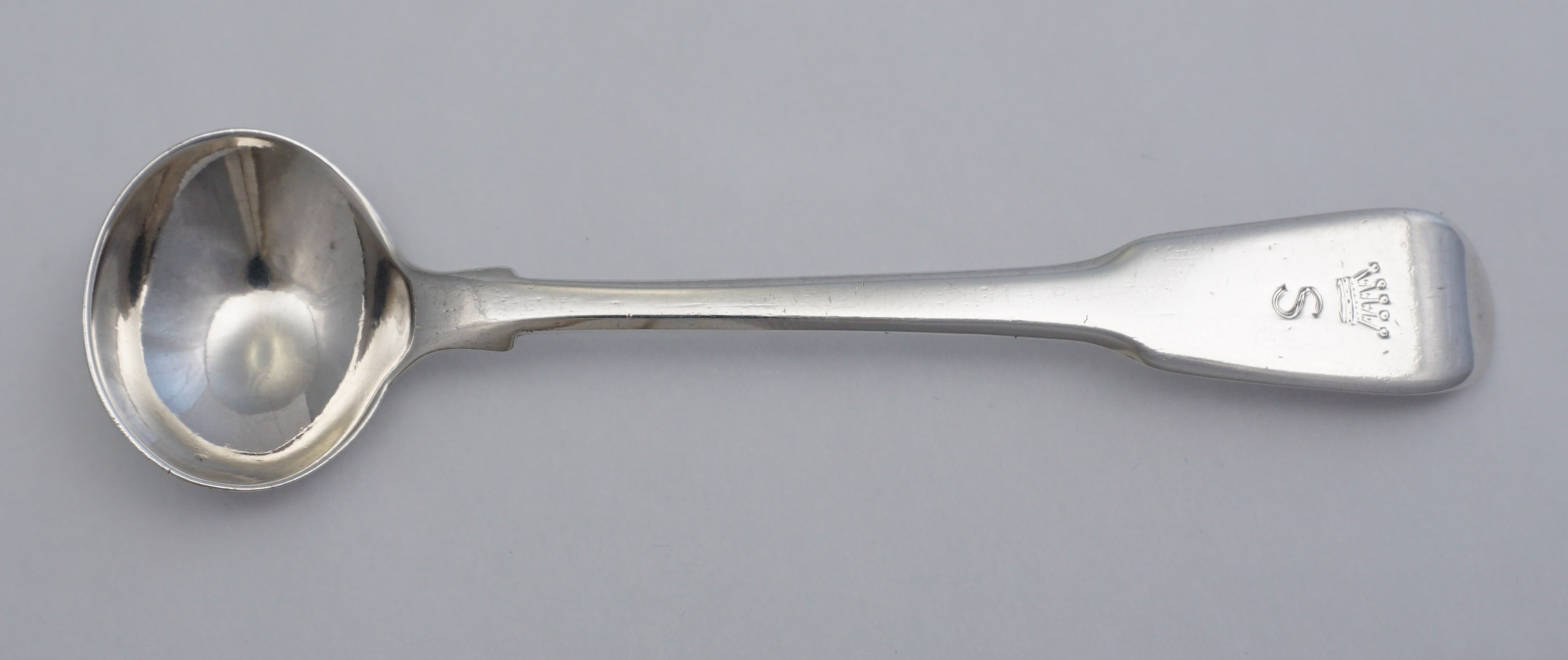 DESCRIPTION | Antique English William IV solid sterling silver Fiddle pattern salt spoon with a frontal 'S' below an Earl's coronet engraving. |