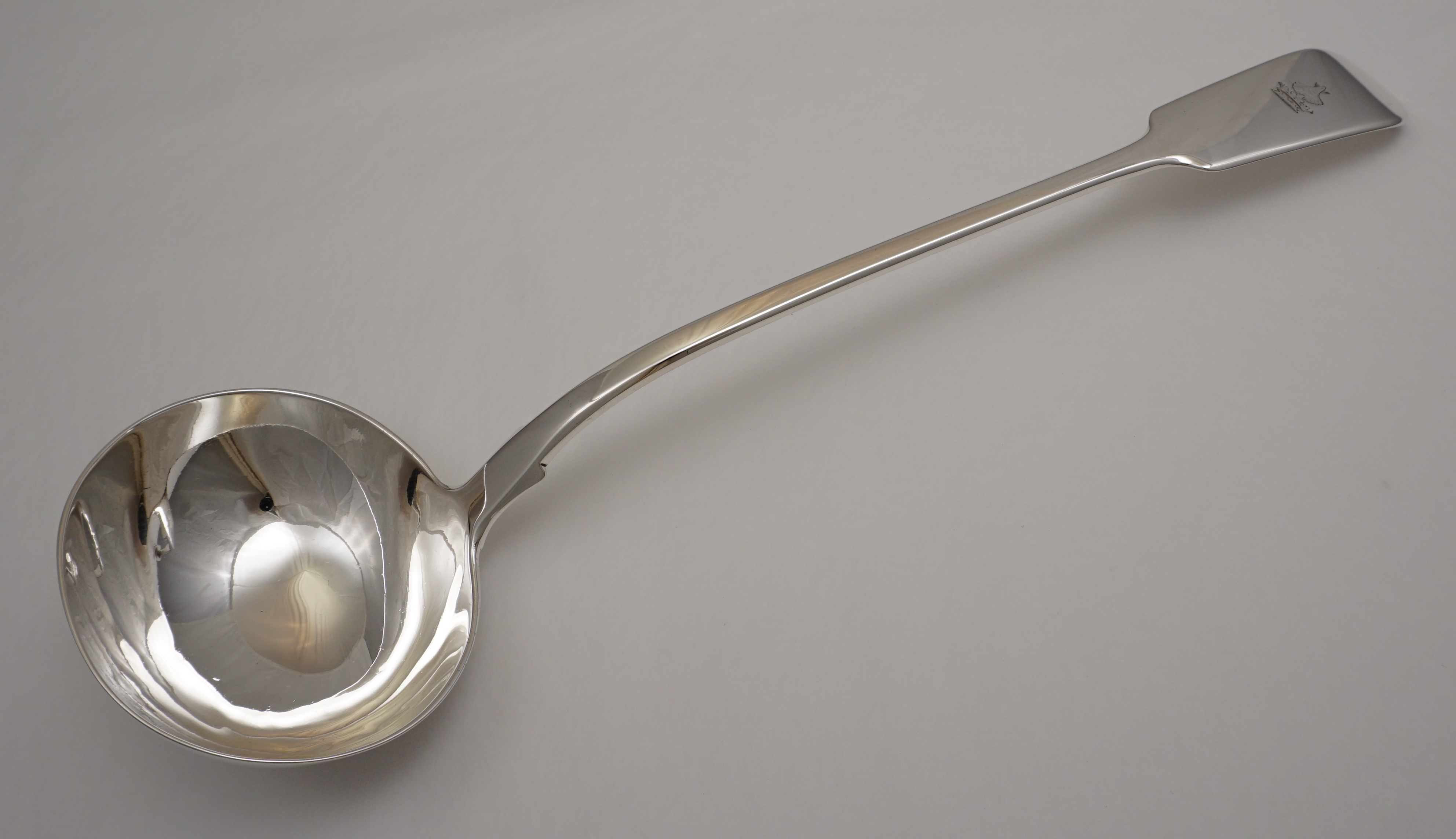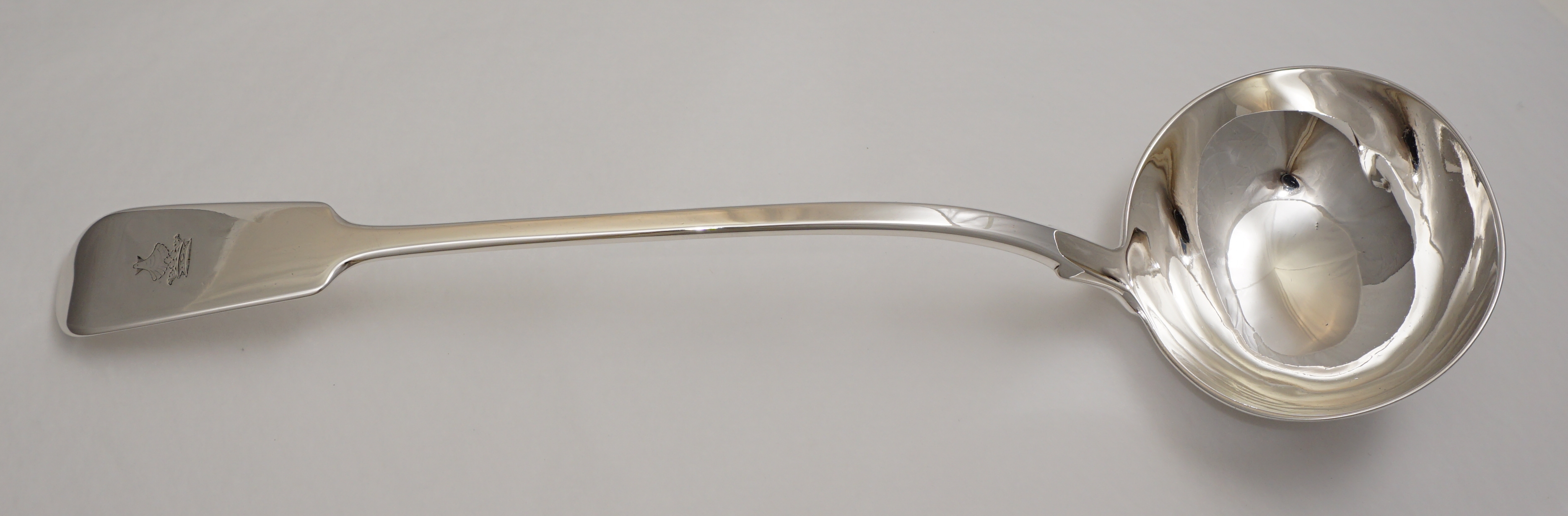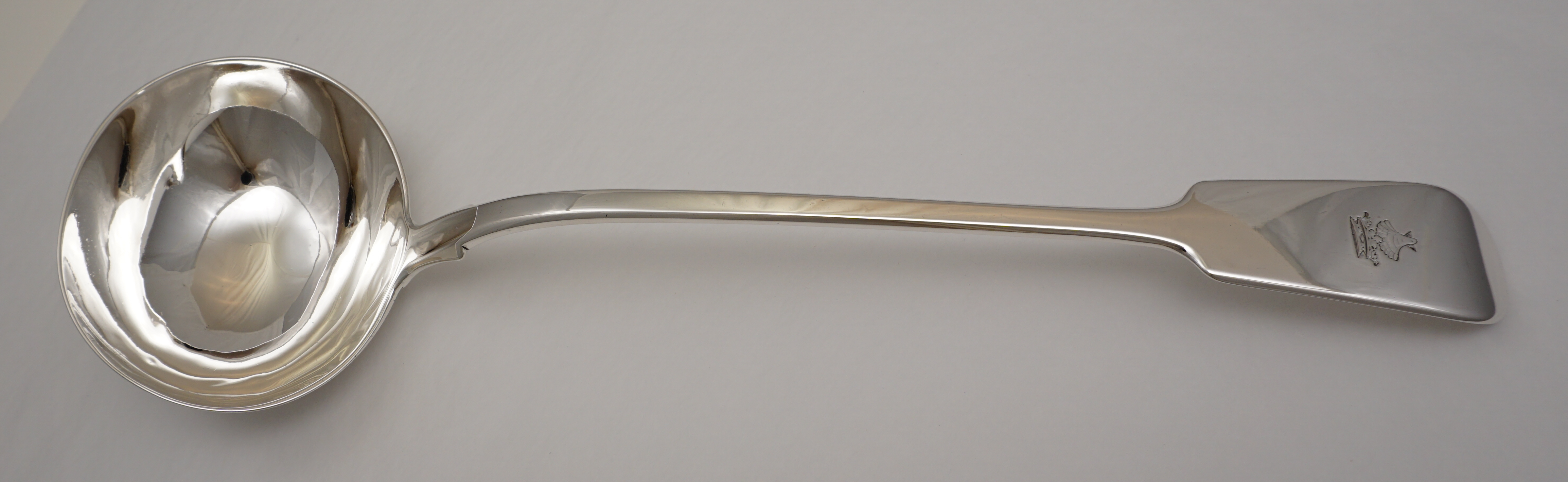 DESCRIPTION | Good, large and heavy antique English Victorian solid sterling silver Fiddle pattern soup ladle with a good frontal crest engraving. |